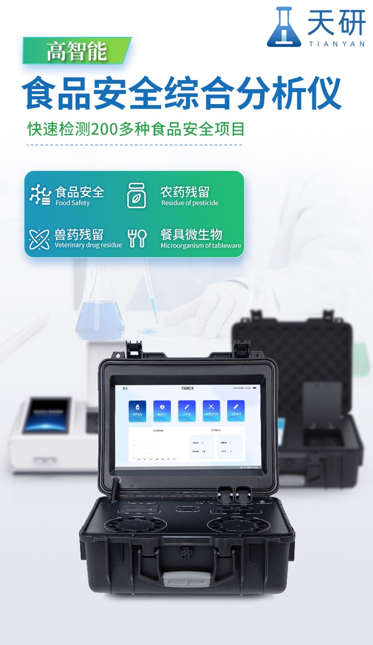 山東天研儀器有限公司生產(chǎn)的高智能食品安全檢測儀為集成化食品安全快速檢測分析設(shè)備,采用臺(tái)式一體化設(shè)計(jì),可快速檢測200多種食品安全項(xiàng)目,包含非食用化學(xué)物質(zhì)、濫用食品添加劑、農(nóng)藥殘留、獸藥殘留、重金屬、病害肉、營養(yǎng)強(qiáng)化劑、抗生素類殘留、激素類殘留、真菌毒素類殘留、化學(xué)類殘留等項(xiàng)目的定性定量檢測。目前廣泛應(yīng)用于市場監(jiān)管局、檢測中心、衛(wèi)生監(jiān)督部門、農(nóng)業(yè)部門、院校及各單位食堂、食品肉產(chǎn)品深加工企業(yè)、商超市場、司法部門、餐飲機(jī)構(gòu)、養(yǎng)殖場、屠宰場、檢驗(yàn)檢疫部門等單位。