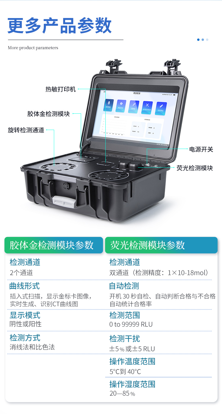 | 儀器采用臺(tái)式一體化系統(tǒng)檢測技術(shù),將分光光度模塊、膠體金檢測模塊、新型農(nóng)殘檢測模塊、數(shù)字化管理模塊、無線通訊模塊高度集成于一體,支持檢測200種食品安全檢測項(xiàng)目,同時(shí)預(yù)留升級檢測方法。 | 儀器檢測模塊標(biāo)準(zhǔn)化、智能化,可隨意自由組合。檢測箱體內(nèi)置多個(gè)標(biāo)準(zhǔn)檢測單元,檢測模塊可以調(diào)整配置。 | 顯示屏幕:儀器采用10.1英寸豎向液晶觸摸屏顯,搭配運(yùn)行安卓智能操作系統(tǒng),主控芯片采用ARM Cortex-A7,RK3288/4核處理器,主頻1.88Ghz,操作方便,性能更強(qiáng)。 | 檢測通道:≥24通道;采用精密旋轉(zhuǎn)比色池設(shè)計(jì),使用同芯片同光源校準(zhǔn)精度,解決不同光源之間的誤差值,更加準(zhǔn)確**。(1-12通道間誤差0.1%,專利號(hào):ZL202022821055.2) | 儀器光源:高精度進(jìn)口四波長冷光源,每個(gè)通道均配置 410、520、590、630nm 波長光源,標(biāo)配**的光路切換裝置,專利光路切換功能可實(shí)現(xiàn)64波長,并且所有檢測項(xiàng)目可實(shí)現(xiàn)所有通道同時(shí)檢測。 | 設(shè)備可一鍵校準(zhǔn),自動(dòng)保存校準(zhǔn)數(shù)據(jù),自動(dòng)對比校驗(yàn),得到精準(zhǔn)光源,采用Android SP存儲(chǔ)數(shù)據(jù),光源數(shù)據(jù)永不丟失,方便每一次使用。 | 通訊接口:配備無線通信模塊、可選配4G(APN)通訊模塊和藍(lán)牙傳輸,同時(shí)具有雙USB接口以及RJ45網(wǎng)線接口,可以多方式實(shí)現(xiàn)數(shù)據(jù)保存及數(shù)據(jù)傳輸。 | 存儲(chǔ)方式:支持U盤存儲(chǔ),標(biāo)準(zhǔn)USB接口,免驅(qū)動(dòng)安裝。檢測結(jié)果存儲(chǔ)容量20萬條以上,可生成Excel表格進(jìn)行拷貝,并具有登錄保護(hù)功能。 | 智能化操作系統(tǒng): | 1、操作系統(tǒng):儀器可在同一檢測界面自動(dòng)對應(yīng)相關(guān)檢測通道,一次性選擇1-12個(gè)樣品名稱,無需退出界面,節(jié)省操作時(shí)間。并可以對每個(gè)通道屬性和樣品信息單獨(dú)進(jìn)行編輯,例如送檢單位、人員,檢測人員等,打印時(shí)勾選打印顯示。 | 2、數(shù)據(jù)集成系統(tǒng):設(shè)備首頁自動(dòng)匯總分析檢測數(shù)據(jù),包含:周檢測數(shù)據(jù)、月檢測數(shù)據(jù),總檢測數(shù)量,均包含檢測總數(shù),合格數(shù),不合格數(shù),以及相關(guān)柱形分析圖,各項(xiàng)檢測數(shù)據(jù)一目了然,無需電腦查詢,更加快捷直觀。 | 3、數(shù)據(jù)庫系統(tǒng):十幾項(xiàng)數(shù)據(jù)庫分類管理儀器:包含項(xiàng)目類型、項(xiàng)目數(shù)據(jù)、檢測數(shù)據(jù)、歷史記錄、國標(biāo)信息、曲線信息、采樣信息、檢測信息、受檢信息、復(fù)核信息、圖表信息、光源校準(zhǔn)信息、打印樣式信息、樣品庫信息等等,數(shù)據(jù)庫之間互相協(xié)調(diào)聯(lián)動(dòng)保證數(shù)據(jù)的真實(shí)完整性。同時(shí)產(chǎn)品數(shù)據(jù)庫以及歷史檢測記錄支持一鍵檢索功能。 | 4、限量規(guī)判系統(tǒng):具有限量查詢、添加物質(zhì)合規(guī)判定系統(tǒng)。檢測出結(jié)果后,系統(tǒng)自動(dòng)調(diào)用系統(tǒng)數(shù)據(jù)庫中相關(guān)國標(biāo)進(jìn)行比對判定,客觀顯示判定結(jié)果是否合格。 | 5、項(xiàng)目預(yù)設(shè)系統(tǒng):儀器具有任務(wù)預(yù)設(shè)模塊,一鍵提前預(yù)設(shè),給出方便快捷的新檢測方案,每一個(gè)任務(wù)分別可以設(shè)置不同的樣品、批次、編號(hào)、來源、備注、抽樣信息、檢測信息、受檢信息、復(fù)核信息等更多信息。樣品送檢時(shí)一鍵調(diào)取保存信息,并可多次調(diào)取,大大提高檢測效率。 | 6、數(shù)據(jù)監(jiān)管系統(tǒng):同步對接監(jiān)管平臺(tái),數(shù)據(jù)可局域網(wǎng)和互聯(lián)網(wǎng)數(shù)據(jù)上傳,檢測結(jié)果可直接傳至食品安全監(jiān)管平臺(tái)。進(jìn)行區(qū)域食品安全監(jiān)管及大數(shù)據(jù)分析處理與數(shù)據(jù)統(tǒng)計(jì),監(jiān)測區(qū)域食品安全長短期動(dòng)態(tài)及問題預(yù)估、預(yù)警。 | 7、全新打印系統(tǒng):內(nèi)置全新打印機(jī),新創(chuàng)自定義打印方式,可按需靈活勾選控制:產(chǎn)品合格證(國家農(nóng)業(yè)部標(biāo)準(zhǔn)要求),二維碼,抽樣信息、檢測信息,受檢信息、復(fù)核信息、抽樣日期、檢測日期等信息的打印。 | 8、A4紙版本報(bào)告打印功能(可選配):設(shè)備擁有兩種結(jié)果展示方式,可以自動(dòng)生成A4打印模板和小票打印模板兩種樣式,可通過WiFi及網(wǎng)線等方式鏈接外置打印機(jī)可進(jìn)行打印。 | 供電模式:儀器交直流兩用,直流12V供電,可連接車載電源,可配6ah大容量充電鋰電池,電量可實(shí)時(shí)顯示,方便戶外流動(dòng)測試。 | 膠體金檢測模塊:采用雙通道CMOS成像處理技術(shù)及膠體金免疫層析技術(shù),可同時(shí)讀取雙膠體金卡數(shù)據(jù),自動(dòng)采集、處理分析,將檢測結(jié)果顯示,并可根據(jù)參考限值自動(dòng)判斷檢測結(jié)果,可檢測常見的獸藥殘留、生物毒素、抗生素、違禁添加物等。 | 1、探測技術(shù):CMOS成像探測; | 2、檢測通道:2通道,可同時(shí)讀取2個(gè)膠體金卡數(shù)據(jù); | 3、檢測方式:消線法和比色法; | 4、顯示模式:陰性或陽性; | 5、曲線形式:直插式掃描方式,