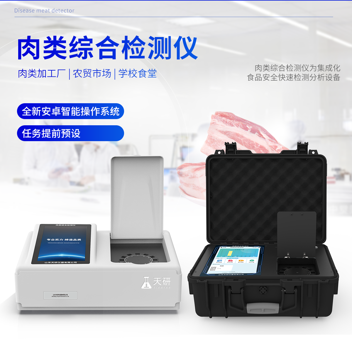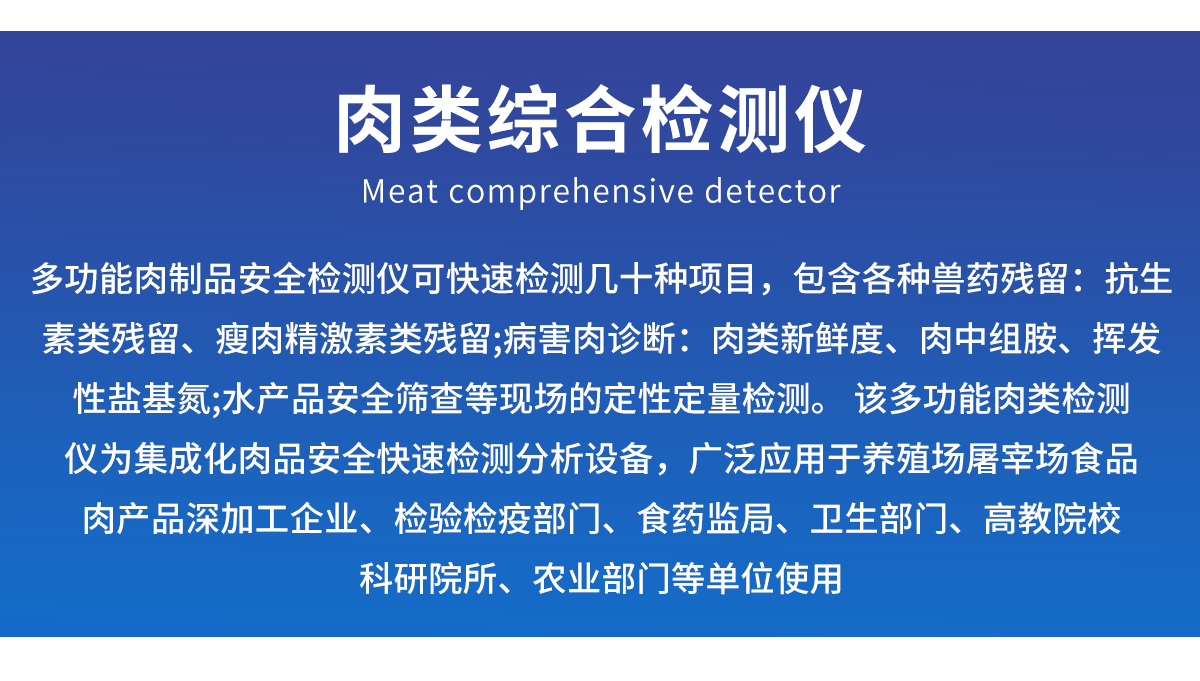 肉類綜合檢測儀可快速檢測幾十種項目,包含各種獸藥殘留:抗生素類殘留、瘦肉精激素類殘留;病害肉診斷:肉類新鮮度、肉中組胺、揮發(fā)性鹽基氮;水產品安全篩查等現(xiàn)場的定性定量檢測。