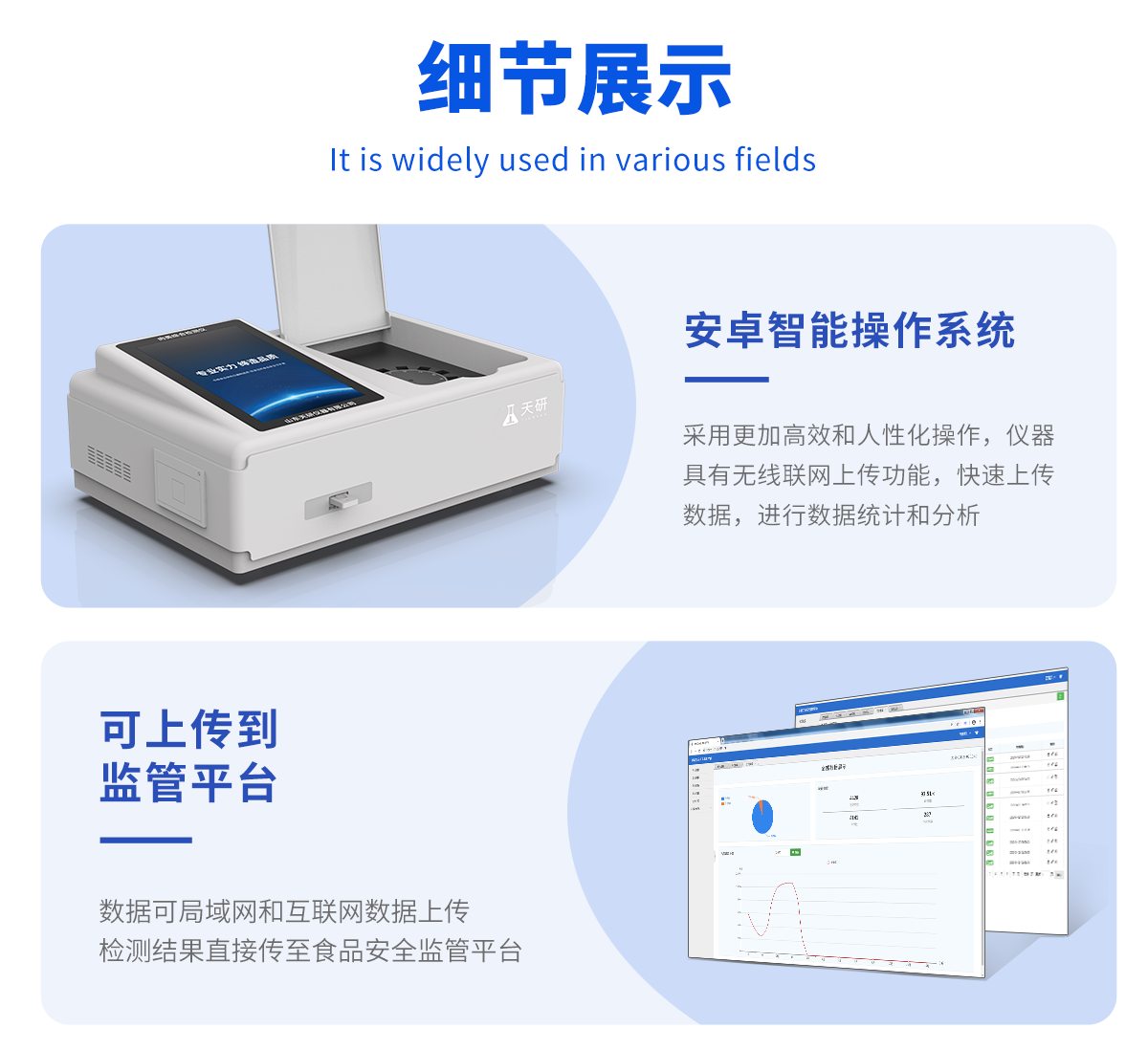 | 儀器采用臺式一體化系統(tǒng)檢測技術,將分光光度模塊、膠體金檢測模塊、新型農殘檢測模塊、數(shù)字化管理模塊、無線通訊模塊高度集成于一體,支持檢測200種食品安全檢測項目,同時預留升級檢測方法。 | 儀器檢測模塊標準化、智能化,可隨意自由組合。檢測箱體內置多個標準檢測單元,檢測模塊可以調整配置。 | 儀器采用全新安卓智能系統(tǒng),主控芯片采用 ARM Cortex-A7,RK3288/4核處理器,10.1寸高清液晶觸摸豎屏,更加**的UI交互界面,運轉快捷;儀器配備無線通信模塊: 4G(APN)通訊模塊、Wifi模塊,藍牙傳輸,同時具有雙USB接口以及RJ45接口能以多種方式實現(xiàn)數(shù)據(jù)保存和數(shù)據(jù)傳輸功能。 | 創(chuàng)新檢測模式: | ★檢測通道:≥12通道;采用精密旋轉比色池設計,使用同芯片同光源校準精度,解決不同光源之間的誤差值。1-12通道間誤差0.1%。(專利號:ZL202022821055.2) | ★儀器具有自動識別比色皿檢測功能,即:將樣品比色皿放入儀器后,點擊樣品檢測,儀器自動識別比色皿進行通道檢測。 | 進口高精光源: | 高精度進口四波長冷光源,通道配置 410、520、590、630nm 波長光源,一個光源芯片驅動一個光源,誤差極小,每臺設備單獨**校準光源,**比對,同時參照四種不同波段光源全方位覆蓋市面上99%的農殘食品項目檢測。 | 膠體金模塊檢測方式: | 采用COMS實時成像技術,可采集多個畫面,支持3個金標同時讀卡,通過不同顏色的灰度變化,一秒精準得出結果。 | 智能化操作系統(tǒng): | 便捷操作系統(tǒng):設備檢測時可在同一檢測界面自動對應相關檢測通道一次性選擇1-12個樣品名稱,無須退出界面,節(jié)省操作時間。 | 數(shù)據(jù)集成系統(tǒng):設備首頁自動統(tǒng)計檢測數(shù)據(jù)包含:周檢測數(shù)據(jù)、月檢測數(shù)據(jù),全部檢測總數(shù)量,均包含檢測總數(shù),合格數(shù),不合格數(shù),以及相關柱形分析圖,對各項檢測數(shù)據(jù)清晰掌握,無需電腦查詢,更加快捷直觀。 | 項目預設系統(tǒng):支持添加單個及多個相同或不相同的任務預設,一鍵快速調取,每一個任務分別可以設置不同的樣品、批次、編號、來源、備注、抽樣信息、檢測信息、受檢信息、復核信息等更多信息。無縫鏈接平臺和APP實時查看下發(fā)任務。 | 數(shù)據(jù)監(jiān)管系統(tǒng):同步對接監(jiān)管平臺,數(shù)據(jù)可局域網(wǎng)和互聯(lián)網(wǎng)數(shù)據(jù)上傳,檢測結果可選擇直接傳至食品安全監(jiān)管平臺。集成OSS輸出存儲服務、區(qū)分設備定向管理應用,進行區(qū)域食品安全監(jiān)管及大數(shù)據(jù)分析處理與數(shù)據(jù)統(tǒng)計,檢測區(qū)域食品安全長短期動態(tài),達到食品安全問題預估、預警。 | 自定義打印系統(tǒng):內置全新打印系統(tǒng),新創(chuàng)自定義打印方式,可按需靈活設置開啟或關閉:產品合格證(國家農業(yè)部標準要求),二維碼,抽樣信息、檢測信息,受檢信息、復核信息、抽樣日期、檢測日期等信息的打印。 | 系統(tǒng)遠程更新功能:可定向分客戶分儀器更新系統(tǒng),按照不同客戶后期實際需求添加項目,無需機器返廠,即可遠程實時升級全新系統(tǒng),節(jié)省時間成本及避免運輸造成設備損壞。 | 儀器主機采用一體化防水、抗壓、防撞擊、防腐蝕箱體設計,同時配備交直流供電,可連接車載電源,可選配大容量充電鋰電池,滿足現(xiàn)場野外檢測需求。 | 安全證書,放心保障:儀器具有中國計量科學研究院校準證書,**認證。 |