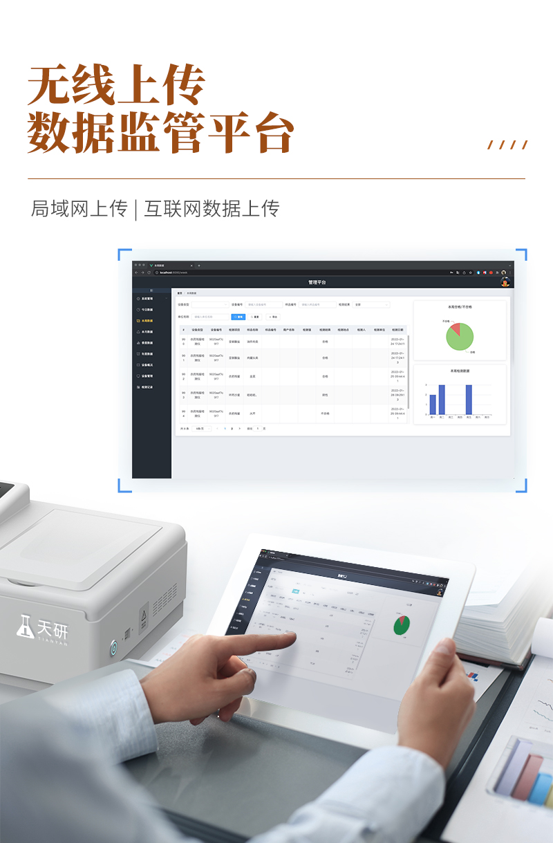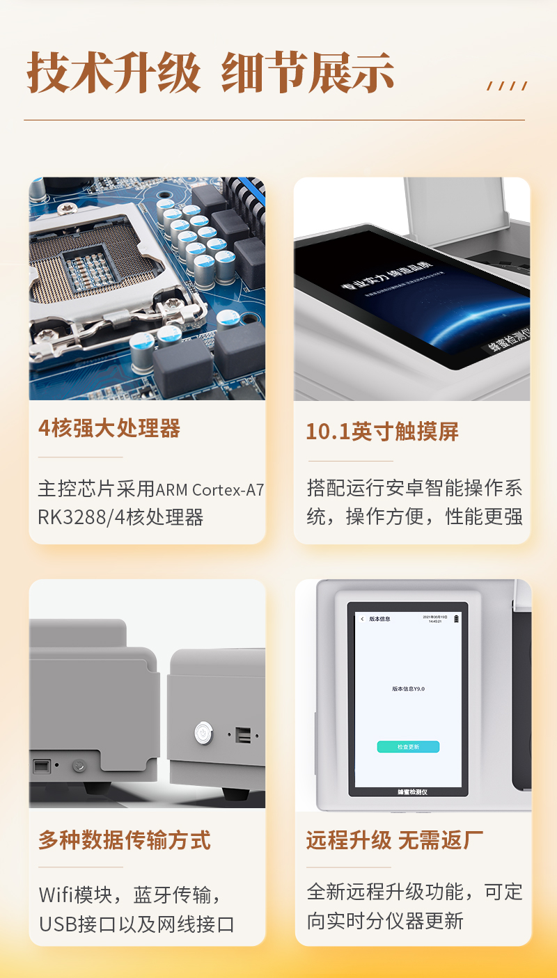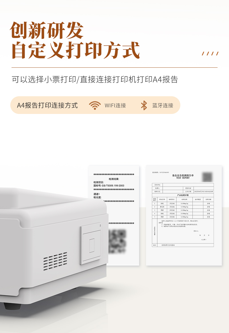 | 儀器采用手提一體化系統(tǒng)檢測(cè)技術(shù),將分光光度模塊、膠體金檢測(cè)模塊、新型農(nóng)殘檢測(cè)模塊、數(shù)字化管理模塊、無(wú)線通訊模塊高度集成于一體,支持檢測(cè)200種食品安全檢測(cè)項(xiàng)目,同時(shí)預(yù)留升級(jí)檢測(cè)方法。 | 儀器檢測(cè)模塊標(biāo)準(zhǔn)化、智能化,檢測(cè)項(xiàng)目可隨意自由組合。檢測(cè)箱體內(nèi)置多個(gè)標(biāo)準(zhǔn)檢測(cè)單元,檢測(cè)模塊可以調(diào)整配置。 | 顯示屏幕:儀器采用10.1英寸豎向液晶觸摸屏顯,搭配運(yùn)行安卓智能操作系統(tǒng),主控芯片采用ARM Cortex-A7,RK3288/4核處理器,主頻1.88Ghz,操作方便,性能更強(qiáng)。 | 檢測(cè)通道:≥12通道;采用精密旋轉(zhuǎn)比色池設(shè)計(jì),使用同芯片同光源校準(zhǔn)精度,解決不同光源之間的誤差值,更加準(zhǔn)確**。(1-12通道間誤差0.1%,專(zhuān)利號(hào):ZL202022821055.2) | 儀器光源:高精度進(jìn)口四波長(zhǎng)冷光源,每個(gè)通道均配置 410、520、590、630nm 波長(zhǎng)光源,標(biāo)配**的光路切換裝置,專(zhuān)利光路切換功能可實(shí)現(xiàn)64波長(zhǎng),并且所有檢測(cè)項(xiàng)目可實(shí)現(xiàn)所有通道同時(shí)檢測(cè)。 | 設(shè)備可一鍵校準(zhǔn),自動(dòng)保存校準(zhǔn)數(shù)據(jù),自動(dòng)對(duì)比校驗(yàn),得到精準(zhǔn)光源,采用Android SP存儲(chǔ)數(shù)據(jù),光源數(shù)據(jù)永不丟失,方便每一次使用。 | 通訊接口:配備無(wú)線通信模塊、4G(APN)通訊模塊、藍(lán)牙傳輸,同時(shí)具有雙USB接口以及RJ45網(wǎng)線接口,可以多方式實(shí)現(xiàn)數(shù)據(jù)保存及數(shù)據(jù)傳輸。 | 存儲(chǔ)方式:支持U盤(pán)存儲(chǔ),標(biāo)準(zhǔn)USB接口,免驅(qū)動(dòng)安裝。檢測(cè)結(jié)果存儲(chǔ)容量20萬(wàn)條以上,可生成Excel表格進(jìn)行拷貝,并具有登錄保護(hù)功能。 | 智能化操作系統(tǒng):: ★操作系統(tǒng):儀器可在同一檢測(cè)界面自動(dòng)對(duì)應(yīng)相關(guān)檢測(cè)通道,一次性選擇1-12個(gè)樣品名稱,無(wú)需退出界面,節(jié)省操作時(shí)間。并可以對(duì)每個(gè)通道屬性和樣品信息單獨(dú)進(jìn)行編輯,例如送檢單位、人員,檢測(cè)人員等,打印時(shí)勾選打印顯示。 | ★數(shù)據(jù)集成系統(tǒng):設(shè)備首頁(yè)自動(dòng)匯總分析檢測(cè)數(shù)據(jù),包含:周檢測(cè)數(shù)據(jù)、月檢測(cè)數(shù)據(jù),全部檢測(cè)總數(shù)量,均包含檢測(cè)總數(shù),合格數(shù),不合格數(shù),以及相關(guān)柱形分析圖,各項(xiàng)檢測(cè)數(shù)據(jù)一目了然,無(wú)需電腦查詢,更加快捷直觀。 | ★數(shù)據(jù)庫(kù)系統(tǒng):十幾項(xiàng)數(shù)據(jù)庫(kù)分類(lèi)管理儀器:包含項(xiàng)目類(lèi)型、項(xiàng)目數(shù)據(jù)、檢測(cè)數(shù)據(jù)、歷史記錄、國(guó)標(biāo)信息、曲線信息、采樣信息、檢測(cè)信息、受檢信息、復(fù)核信息、圖表信息、光源校準(zhǔn)信息、打印樣式信息、樣品庫(kù)信息等等,數(shù)據(jù)庫(kù)之間互相協(xié)調(diào)聯(lián)動(dòng)保證數(shù)據(jù)的真實(shí)完整性。同時(shí)產(chǎn)品數(shù)據(jù)庫(kù)以及歷史檢測(cè)記錄支持一鍵檢索功能。 | ★限量規(guī)判系統(tǒng):具有限量查詢、添加物質(zhì)合規(guī)判定系統(tǒng)。檢測(cè)出結(jié)果后,系統(tǒng)自動(dòng)調(diào)用系統(tǒng)數(shù)據(jù)庫(kù)中相關(guān)國(guó)標(biāo)進(jìn)行比對(duì)判定,客觀顯示判定結(jié)果是否合格 | ★項(xiàng)目預(yù)設(shè)系統(tǒng):儀器具有任務(wù)預(yù)設(shè)模塊,一鍵提前預(yù)設(shè),給出方便快捷的新檢測(cè)方案,每一個(gè)任務(wù)分別可以設(shè)置不同的樣品、批次、編號(hào)、來(lái)源、備注、抽樣信息、檢測(cè)信息、受檢信息、復(fù)核信息等更多信息。樣品送檢時(shí)一鍵調(diào)取保存信息,并可多次調(diào)取,大大提高檢測(cè)效率。 | ★數(shù)據(jù)監(jiān)管系統(tǒng):同步對(duì)接監(jiān)管平臺(tái),數(shù)據(jù)可局域網(wǎng)和互聯(lián)網(wǎng)數(shù)據(jù)上傳,檢測(cè)結(jié)果可選擇直接傳至食品安全監(jiān)管平臺(tái)。進(jìn)行區(qū)域食品安全監(jiān)管及大數(shù)據(jù)分析處理與數(shù)據(jù)統(tǒng)計(jì),檢測(cè)區(qū)域食品安全長(zhǎng)短期動(dòng)態(tài),達(dá)到食品安全問(wèn)題預(yù)估、預(yù)警。 | ★打印系統(tǒng):內(nèi)置全新打印機(jī),新創(chuàng)自定義打印方式,可按需靈活勾選控制:產(chǎn)品合格證(國(guó)家農(nóng)業(yè)部標(biāo)準(zhǔn)要求),二維碼,抽樣信息、檢測(cè)信息,受檢信息、復(fù)核信息、抽樣日期、檢測(cè)日期等信息的打印。 | 供電模式:儀器交直流兩用,直流12V供電,可連接車(chē)載電源,可配6ah大容量充電鋰電池,電量可實(shí)時(shí)顯示,方便戶外流動(dòng)測(cè)試。 | 膠體金檢測(cè)模塊:采用雙通道CMOS成像處理技術(shù)及膠體金免疫層析技術(shù),可同時(shí)讀取雙膠體金卡數(shù)據(jù),自動(dòng)采集、處理分析,將檢測(cè)結(jié)果顯示,并可根據(jù)參考限值自動(dòng)判斷檢測(cè)結(jié)果,可檢測(cè)常見(jiàn)的獸藥殘留、生物毒素、抗生素、違禁添加物等。 | ★探測(cè)技術(shù):CMOS成像探測(cè); | ★檢測(cè)通道:1個(gè)通道; | 