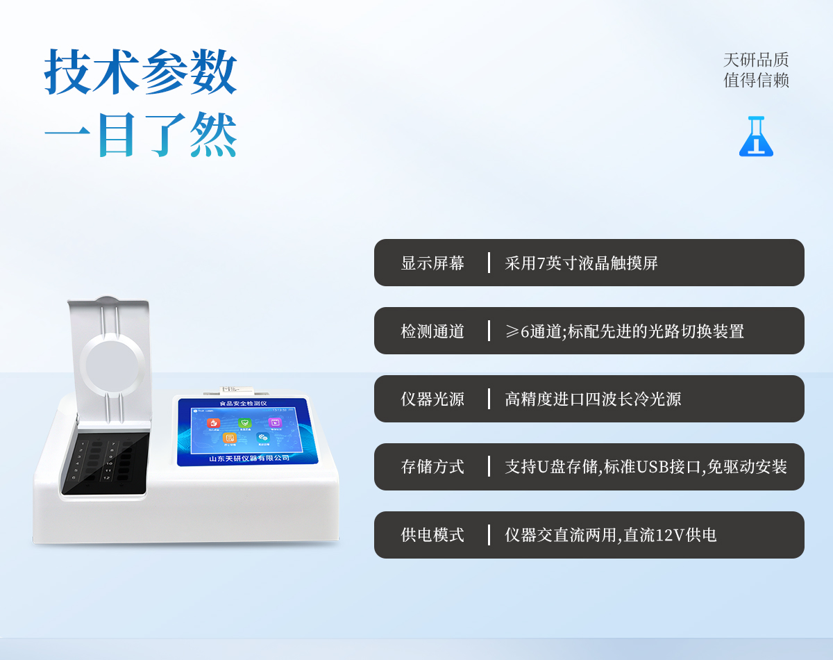 產(chǎn)品介紹:多功能食品安全檢測(cè)儀可快速檢測(cè)200多項(xiàng)目,包含非食用化學(xué)物質(zhì)、濫用食品添加劑、農(nóng)藥殘留、獸藥殘留、重金屬、病害肉、營(yíng)養(yǎng)強(qiáng)化劑、抗生素類(lèi)殘留、激素類(lèi)殘留、真菌毒素類(lèi)殘留、化學(xué)類(lèi)殘留等現(xiàn)場(chǎng)的定性定量檢測(cè)。該多功能食品安全檢測(cè)儀為集成化食品安全快速檢測(cè)分析設(shè)備,廣泛應(yīng)用于市場(chǎng)監(jiān)管局、檢測(cè)中心、衛(wèi)生