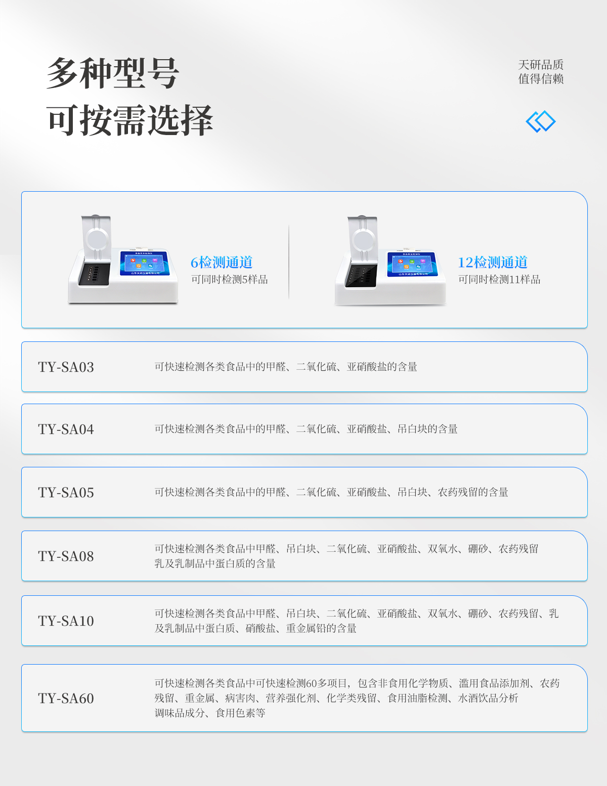 產(chǎn)品介紹:多功能食品安全檢測儀可快速檢測200多項目,包含非食用化學物質(zhì)、濫用食品添加劑、農(nóng)藥殘留、獸藥殘留、重金屬、病害肉、營養(yǎng)強化劑、抗生素類殘留、激素類殘留、真菌毒素類殘留、化學類殘留等現(xiàn)場的定性定量檢測。該多功能食品安全檢測儀為集成化食品安全快速檢測分析設備,廣泛應用于市場監(jiān)管局、檢測中心、衛(wèi)生