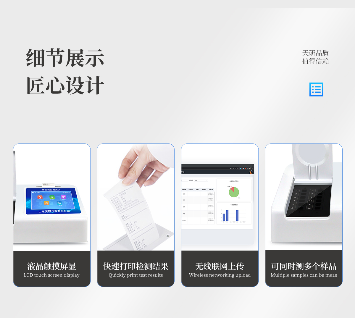 | 安卓智能操作系統(tǒng),采用更加**和人性化操作,儀器具有網(wǎng)線連接、wifi聯(lián)網(wǎng)上傳、GPRS無線遠傳功能,快速上傳數(shù)據(jù)。 | 智能化程度高,儀器具有自檢功能:具有開機自檢和調(diào)零功能,具有自動檢測重復性功能。 | 檢測通道:≥12個檢測通道,可以同時測試多個樣品,每個樣品由程序控制分別獨立工作,不會互相干擾。 | 顯示方式:≥8英寸液晶觸摸屏顯示,人性化中文操作界面,讀數(shù)直觀、簡單。 | 配備新一代嵌入式熱敏打印機,可選擇手動打印或者自動打印,檢測完成可自動打印檢測報告和二維碼。 | 光源采用進口超高亮發(fā)光二極管,高精度、穩(wěn)定性強、光源可控、可以關(guān)掉不使用的光源,功耗更低。 | 采用USB2.0接口設計,方便數(shù)據(jù)的存貯和移動,并可隨時與計算機直接相連,并且可用計算機控制儀器。實現(xiàn)數(shù)據(jù)查詢、瀏覽、分析、統(tǒng)計、打印等。 | 儀器帶有監(jiān)管平臺。數(shù)據(jù)可局域網(wǎng)和互聯(lián)網(wǎng)數(shù)據(jù)上傳,檢測結(jié)果直接傳至食品安全監(jiān)管平臺。進行區(qū)域食品安全監(jiān)管及大數(shù)據(jù)分析處理,檢測區(qū)域食品安全長短期動態(tài),達到食品安全問題預估、預警 | 一體化便攜式快檢設備,滿足現(xiàn)場及流動檢測使用需求,能夠在同一軟件下實現(xiàn)所有檢測項目的檢測,并可通過同一窗口直觀顯示檢測結(jié)果。 | 儀器具有多品類多種類樣品菜單庫,可靈活選擇檢測樣品,不同的檢測通道可同時檢測不同的樣品項目。也可在儀器上直接編輯錄入樣品名稱、檢測指標、送檢單位等信息并保存進樣品數(shù)據(jù)庫。 | 樣品處理簡單省力,整體操作快速、安全、便捷。 | 儀器具有自身保護功能,可設置用戶名及密碼,防止非工作人員操作等。 | 高靈敏度,高檢測精度,高重復性精度,掃描式高精度光學傳感器。 | 儀器具有重新校準、鎖定、恢復出廠設置功能。 | 支持U盤存儲。 結(jié)果判定線可修改,對照值標定值可保存,斷電不丟失數(shù)據(jù)。 |
