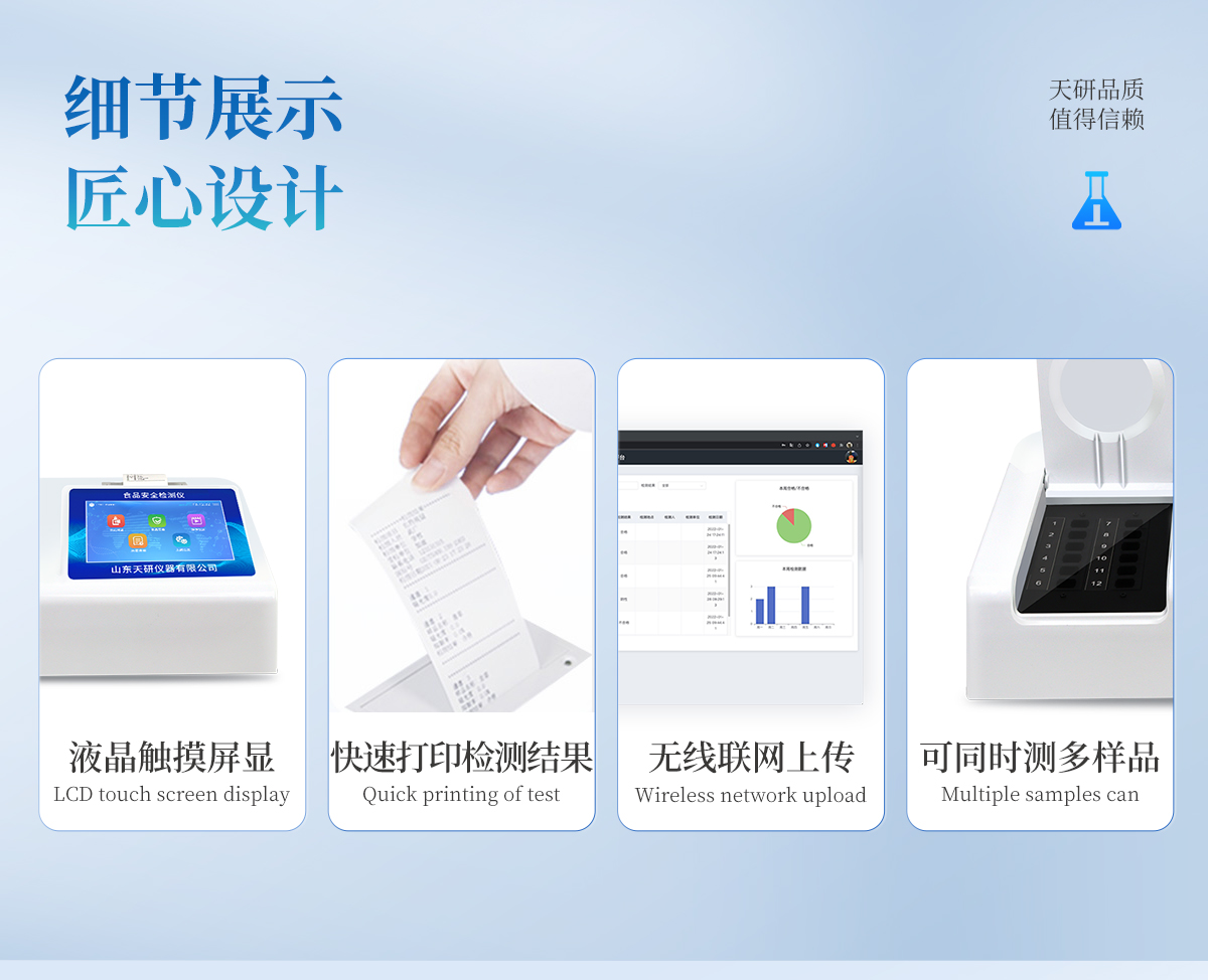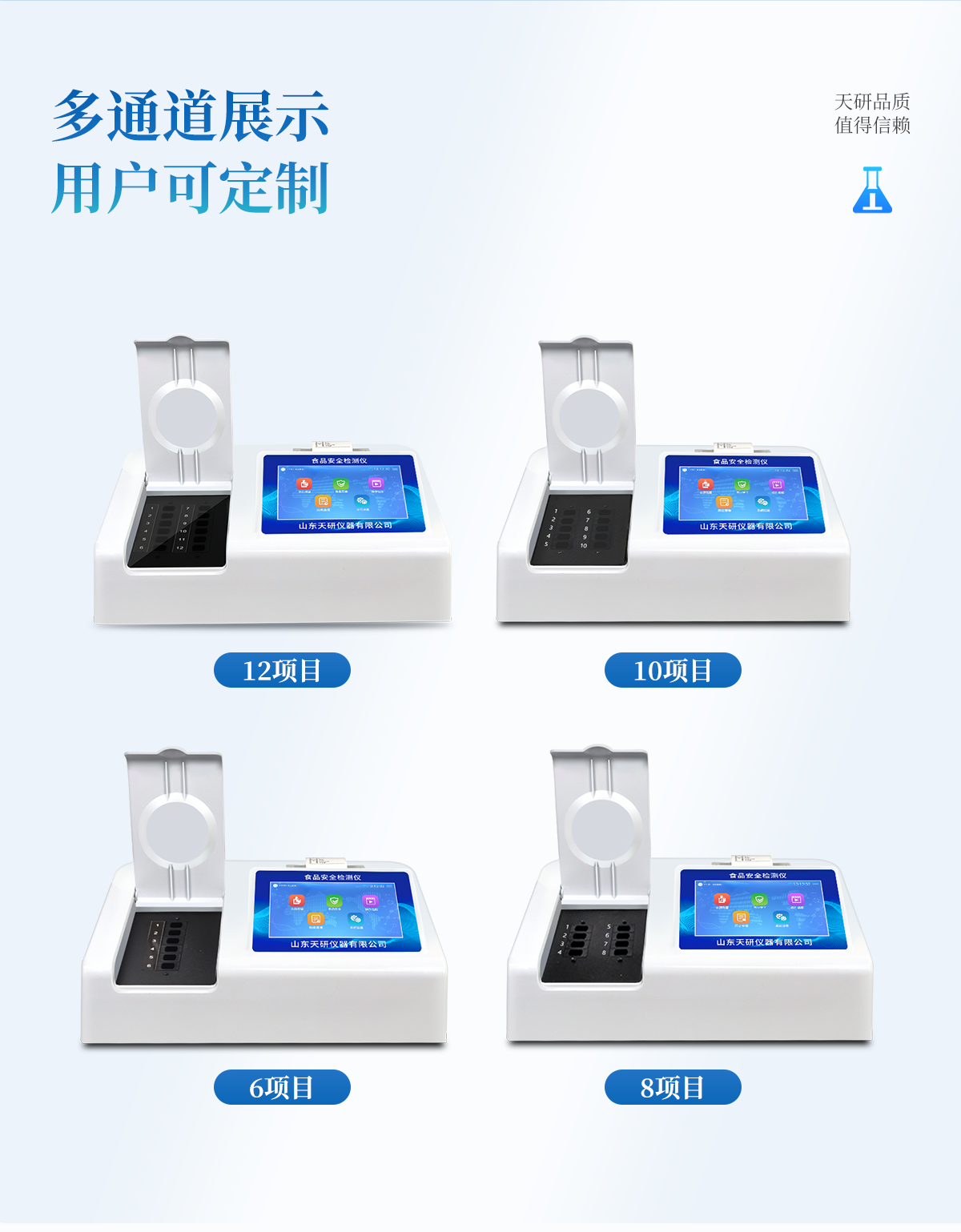| 安卓智能操作系統(tǒng),采用更加**和人性化操作,儀器具有網(wǎng)線連接、wifi聯(lián)網(wǎng)上傳、GPRS無(wú)線遠(yuǎn)傳功能,快速上傳數(shù)據(jù)。 | 智能化程度高,儀器具有自檢功能:具有開(kāi)機(jī)自檢和調(diào)零功能,具有自動(dòng)檢測(cè)重復(fù)性功能。 | 檢測(cè)通道:≥12個(gè)檢測(cè)通道,可以同時(shí)測(cè)試多個(gè)樣品,每個(gè)樣品由程序控制分別獨(dú)立工作,不會(huì)互相干擾。 | 顯示方式:≥8英寸液晶觸摸屏顯示,人性化中文操作界面,讀數(shù)直觀、簡(jiǎn)單。 | 配備新一代嵌入式熱敏打印機(jī),可選擇手動(dòng)打印或者自動(dòng)打印,檢測(cè)完成可自動(dòng)打印檢測(cè)報(bào)告和二維碼。 | 光源采用進(jìn)口超高亮發(fā)光二極管,高精度、穩(wěn)定性強(qiáng)、光源可控、可以關(guān)掉不使用的光源,功耗更低。 | 采用USB2.0接口設(shè)計(jì),方便數(shù)據(jù)的存貯和移動(dòng),并可隨時(shí)與計(jì)算機(jī)直接相連,并且可用計(jì)算機(jī)控制儀器。實(shí)現(xiàn)數(shù)據(jù)查詢、瀏覽、分析、統(tǒng)計(jì)、打印等。 | 儀器帶有監(jiān)管平臺(tái)。數(shù)據(jù)可局域網(wǎng)和互聯(lián)網(wǎng)數(shù)據(jù)上傳,檢測(cè)結(jié)果直接傳至食品安全監(jiān)管平臺(tái)。進(jìn)行區(qū)域食品安全監(jiān)管及大數(shù)據(jù)分析處理,檢測(cè)區(qū)域食品安全長(zhǎng)短期動(dòng)態(tài),達(dá)到食品安全問(wèn)題預(yù)估、預(yù)警 | 一體化便攜式快檢設(shè)備,滿足現(xiàn)場(chǎng)及流動(dòng)檢測(cè)使用需求,能夠在同一軟件下實(shí)現(xiàn)所有檢測(cè)項(xiàng)目的檢測(cè),并可通過(guò)同一窗口直觀顯示檢測(cè)結(jié)果。 | 儀器具有多品類多種類樣品菜單庫(kù),可靈活選擇檢測(cè)樣品,不同的檢測(cè)通道可同時(shí)檢測(cè)不同的樣品項(xiàng)目。也可在儀器上直接編輯錄入樣品名稱、檢測(cè)指標(biāo)、送檢單位等信息并保存進(jìn)樣品數(shù)據(jù)庫(kù)。 | 樣品處理簡(jiǎn)單省力,整體操作快速、安全、便捷。 | 儀器具有自身保護(hù)功能,可設(shè)置用戶名及密碼,防止非工作人員操作等。 | 高靈敏度,高檢測(cè)精度,高重復(fù)性精度,掃描式高精度光學(xué)傳感器。 | 儀器具有重新校準(zhǔn)、鎖定、恢復(fù)出廠設(shè)置功能。 | 支持U盤(pán)存儲(chǔ)。 結(jié)果判定線可修改,對(duì)照值標(biāo)定值可保存,斷電不丟失數(shù)據(jù)。 |