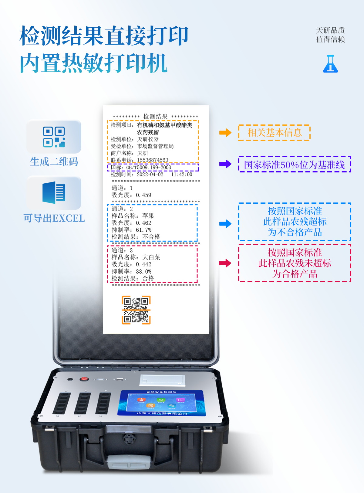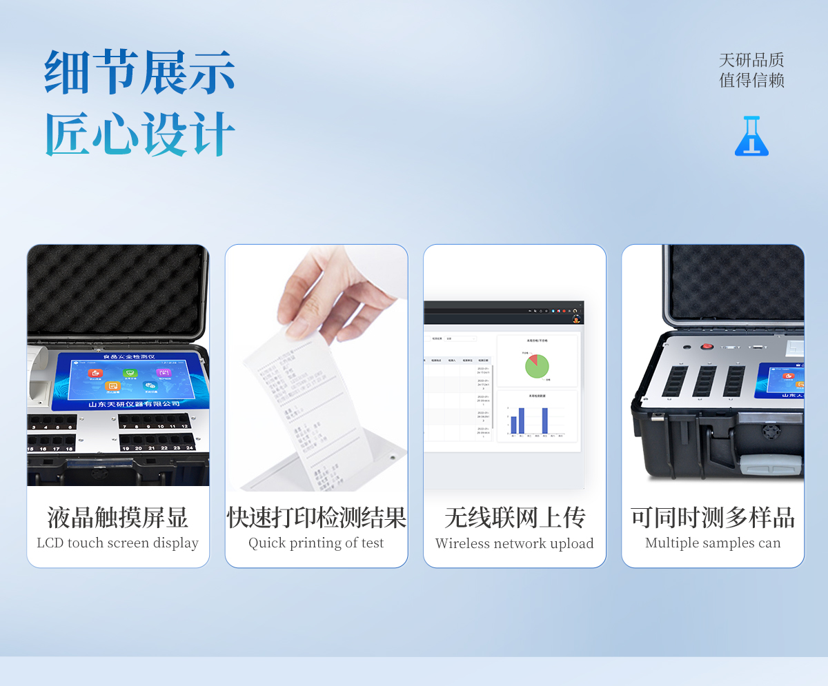 | 安卓智能操作系統(tǒng),采用更加**的UI交互界面,儀器具有wifi聯(lián)網(wǎng)上傳、4G聯(lián)網(wǎng)傳輸、GPRS無線遠(yuǎn)傳、網(wǎng)線連接功能,快速批量上傳數(shù)據(jù)。 | 智能化程度高,儀器具有自檢功能:具有開機(jī)自檢和調(diào)零功能,具有自動(dòng)檢測(cè)重復(fù)性功能。 | 新一代高速熱敏打印機(jī),檢測(cè)完成可自動(dòng)打印或批量打印檢測(cè)報(bào)告和二維碼。 | 儀器帶有監(jiān)管平臺(tái),數(shù)據(jù)可局域網(wǎng)和互聯(lián)網(wǎng)數(shù)據(jù)上傳,檢測(cè)結(jié)果直接傳至食品安全監(jiān)管平臺(tái)。進(jìn)行區(qū)域食品安全監(jiān)管及大數(shù)據(jù)分析處理與數(shù)據(jù)統(tǒng)計(jì),檢測(cè)區(qū)域食品安全長(zhǎng)短期動(dòng)態(tài),達(dá)到食品安全問題預(yù)估、預(yù)警 | 一體化主機(jī),包含食品安全檢測(cè)模塊、多通道農(nóng)藥殘留檢測(cè)模塊、膠體金免疫層析檢測(cè)模塊。 | 一體化便攜式快檢設(shè)備,滿足現(xiàn)場(chǎng)及流動(dòng)檢測(cè)使用需求,能夠在同一軟件下實(shí)現(xiàn)所有檢測(cè)項(xiàng)目的檢測(cè),并可通過同一窗口直觀顯示檢測(cè)結(jié)果。 | 膠體金模塊檢測(cè)方式:軌道式自動(dòng)傳輸掃描,檢測(cè)完成后自動(dòng)退出檢測(cè)卡。 | CT線自動(dòng)識(shí)別,無需手動(dòng)調(diào)整。 | 內(nèi)置強(qiáng)大的數(shù)據(jù)庫,具有多品類多種類樣品菜單功能,可靈活選擇檢測(cè)樣品,不同的檢測(cè)通道可同時(shí)檢測(cè)不同的樣品項(xiàng)目。也可在儀器上直接編輯錄入樣品名稱、檢測(cè)指標(biāo)、送檢單位等信息并保存進(jìn)樣品數(shù)據(jù)庫。 | 產(chǎn)品內(nèi)置操作演示視頻,是您身邊的化驗(yàn)指導(dǎo)專家。 | 樣品處理簡(jiǎn)單省力,整體操作快速、安全、便捷。 | 儀器具有自身保護(hù)功能,可設(shè)置用戶名及密碼,防止非工作人員操作等。 | 高靈敏度,高檢測(cè)精度,高重復(fù)性精度,掃描式高精度光學(xué)傳感器。 | 結(jié)果判定線可修改,對(duì)照值標(biāo)定值可保存,斷電不丟失數(shù)據(jù)。 | 兼容市場(chǎng)上所有的膠體金卡,使用耗材不受限制,極大增強(qiáng)用戶使用體驗(yàn)。 | 儀器具有重新校準(zhǔn)、鎖定、恢復(fù)出廠設(shè)置功能。 |