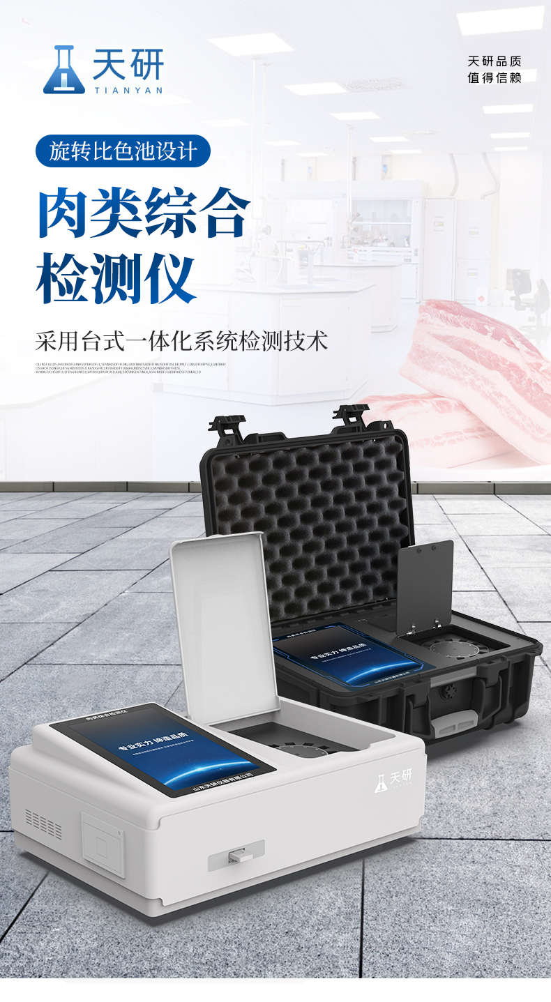 多功能肉制品安全檢測儀可快速檢測幾十種項(xiàng)目,包含各種獸藥殘留:抗生素類殘留、瘦肉精激素類殘留;病害肉診斷:肉類新鮮度、肉中組胺、揮發(fā)性鹽基氮;水產(chǎn)品安全篩查等現(xiàn)場的定性定量檢測。