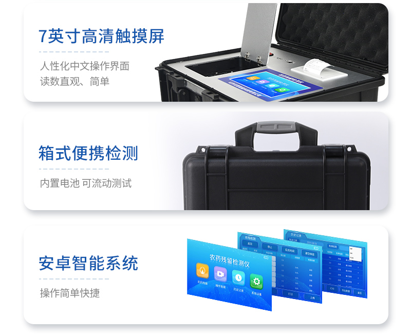 | 安卓智能操作系統(tǒng),采用更加**和人性化操作,儀器具有無線聯(lián)網(wǎng)上傳功能,快速上傳數(shù)據(jù),進行數(shù)據(jù)統(tǒng)計和分析。 | 智能化程度高,儀器具有自檢功能:具有開機自檢和調零功能,具有自動檢測重復性功能;同時,檢測完成可自動打印檢測報告和二維碼。手機掃碼可顯示出詳細檢測信息。 | 儀器帶有監(jiān)管平臺,數(shù)據(jù)可局域網(wǎng)和互聯(lián)網(wǎng)數(shù)據(jù)上傳,檢測結果直接傳至食品安全監(jiān)管平臺。進行區(qū)域食品安全監(jiān)管及大數(shù)據(jù)分析處理與數(shù)據(jù)統(tǒng)計,檢測區(qū)域食品安全長短期動態(tài),達到食品安全問題預估、預警 。 | 樣品處理簡單省力,整體操作快速、安全、便捷。 | 儀器具有自身保護功能,可設置用戶名及密碼,防止非工作人員操作等。 | 內置強大的數(shù)據(jù)庫,可在儀器上直接選擇樣品名稱、檢測指標、送檢單位等信息,也可在儀器上直接編輯錄入樣品名稱、檢測指標、送檢單位等信息并保存進樣品數(shù)據(jù)庫,方便后期操作調取使用。 | 儀器具有重新校準、鎖定、恢復出廠設置功能。 |