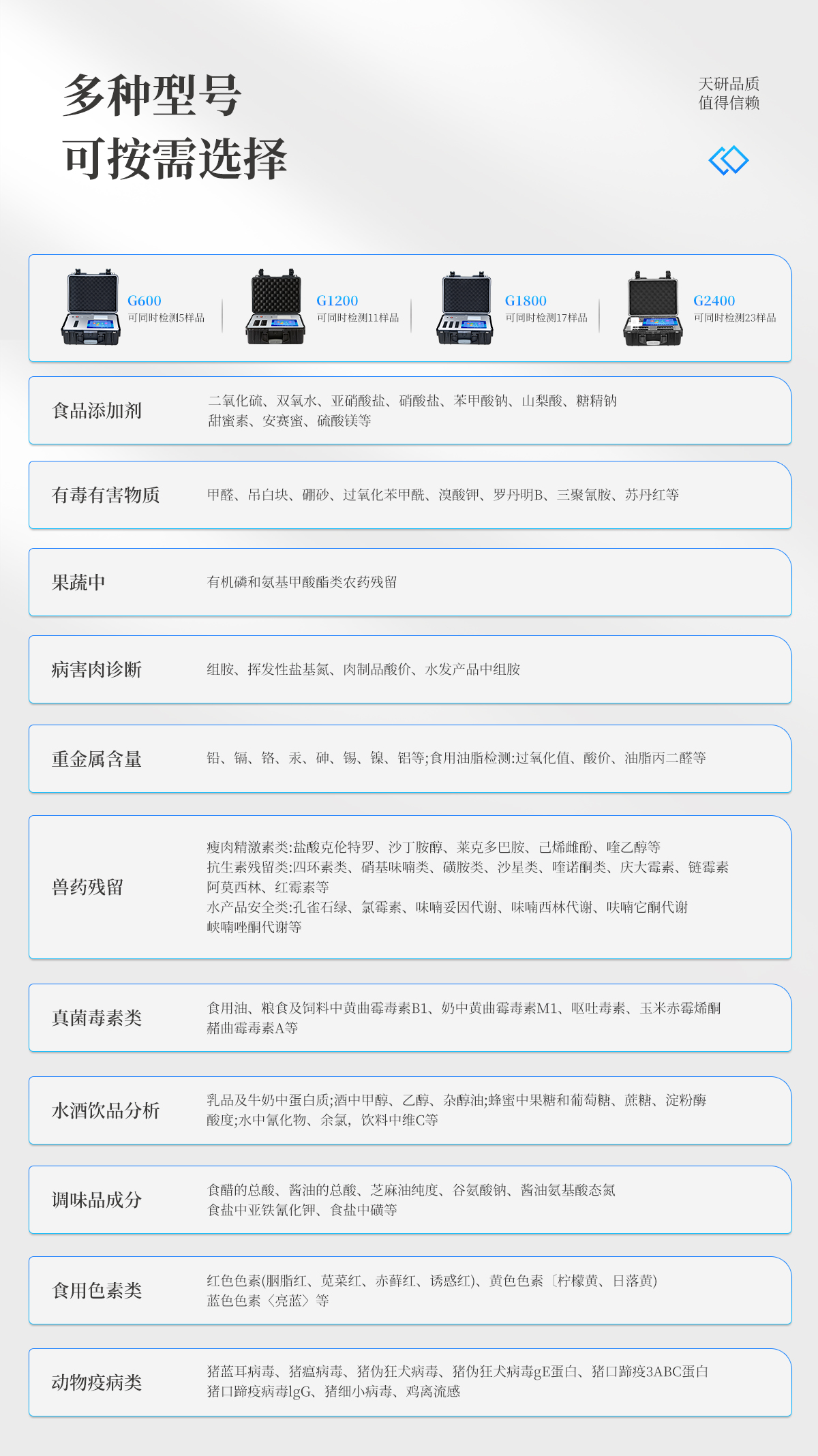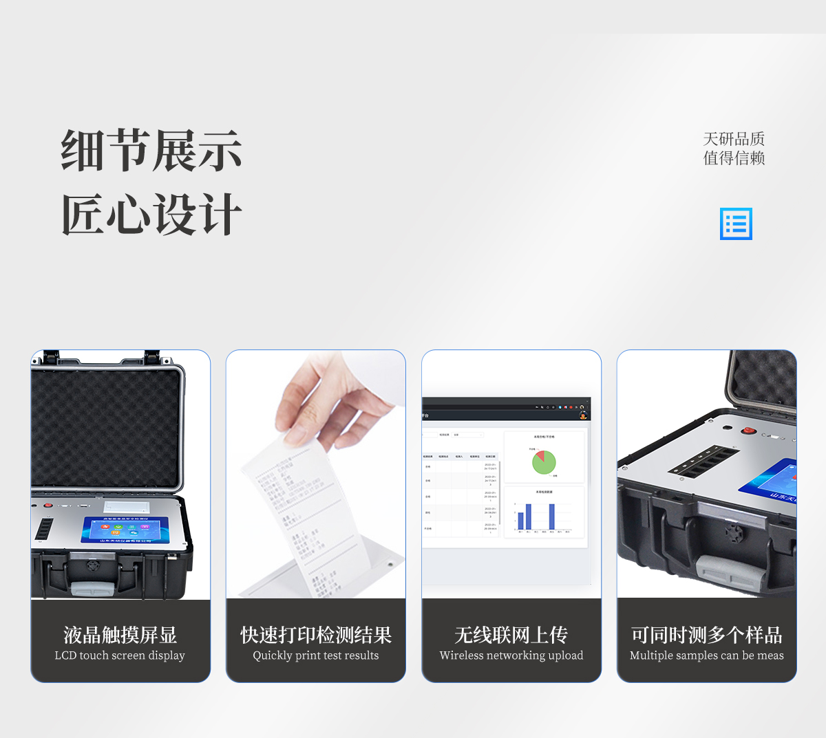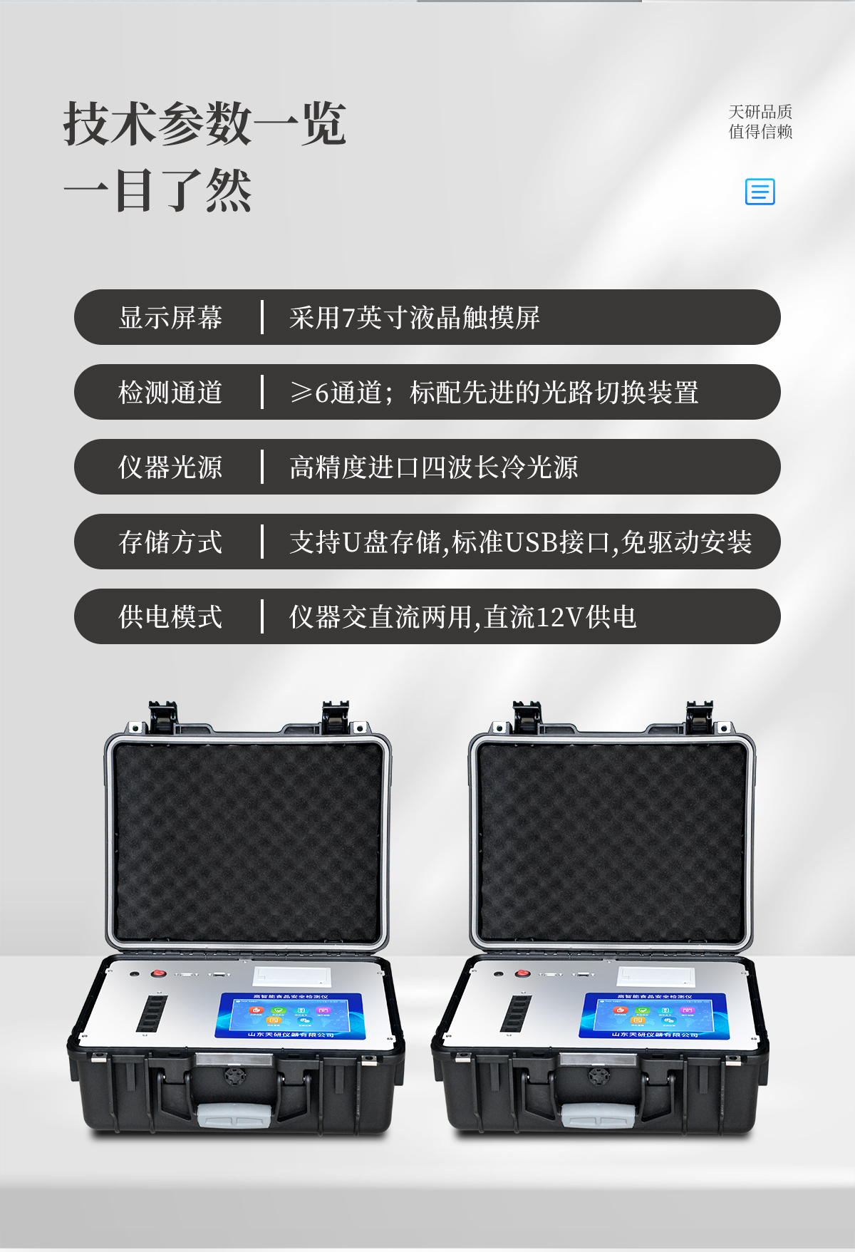 | 儀器采用手提式一體化系統(tǒng)檢測(cè)技術(shù),將分光光度模塊、新型農(nóng)殘檢測(cè)模塊、數(shù)字化管理模塊、無(wú)線通訊模塊高度集成于一體,支持檢測(cè)200種食品安全檢測(cè)項(xiàng)目,同時(shí)預(yù)留升級(jí)檢測(cè)方法。 | 儀器檢測(cè)模塊標(biāo)準(zhǔn)化、智能化,檢測(cè)項(xiàng)目可隨意自由組合。檢測(cè)箱體內(nèi)置多個(gè)標(biāo)準(zhǔn)檢測(cè)單元,檢測(cè)模塊可以調(diào)整配置。 | 顯示屏幕:儀器采用10.1英寸豎向液晶觸摸屏顯,搭配運(yùn)行安卓智能操作系統(tǒng),主控芯片采用ARM Cortex-A7,RK3288/4核處理器,主頻1.88Ghz,操作方便,性能更強(qiáng)。 | 檢測(cè)通道:≥12通道;采用精密旋轉(zhuǎn)比色池設(shè)計(jì),使用同芯片同光源校準(zhǔn)精度,解決不同光源之間的誤差值,更加準(zhǔn)確**。(1-12通道間誤差0.1%,專利號(hào):ZL202022821055.2) | 儀器光源:高精度進(jìn)口四波長(zhǎng)冷光源,每個(gè)通道均配置 410、520、590、630nm 波長(zhǎng)光源,標(biāo)配**的光路切換裝置,專利光路切換功能可實(shí)現(xiàn)64波長(zhǎng),并且所有檢測(cè)項(xiàng)目可實(shí)現(xiàn)所有通道同時(shí)檢測(cè)。 | 設(shè)備可一鍵校準(zhǔn),自動(dòng)保存校準(zhǔn)數(shù)據(jù),自動(dòng)對(duì)比校驗(yàn),得到精準(zhǔn)光源,采用Android SP存儲(chǔ)數(shù)據(jù),光源數(shù)據(jù)永不丟失,方便每一次使用。 | 通訊接口:配備無(wú)線通信模塊、4G(APN)通訊模塊、藍(lán)牙傳輸,同時(shí)具有雙USB接口以及RJ45網(wǎng)線接口,可以多方式實(shí)現(xiàn)數(shù)據(jù)保存及數(shù)據(jù)傳輸 | 存儲(chǔ)方式:支持U盤存儲(chǔ),標(biāo)準(zhǔn)USB接口,免驅(qū)動(dòng)安裝。檢測(cè)結(jié)果存儲(chǔ)容量20萬(wàn)條以上,可生成Excel表格進(jìn)行拷貝,并具有登錄保護(hù)功能。 | 智能化操作系統(tǒng): | 1)操作系統(tǒng):儀器可在同一檢測(cè)界面自動(dòng)對(duì)應(yīng)相關(guān)檢測(cè)通道,一次性選擇1-12個(gè)樣品名稱,無(wú)需退出界面,節(jié)省操作時(shí)間。并可以對(duì)每個(gè)通道屬性和樣品信息單獨(dú)進(jìn)行編輯,例如送檢單位、人員,檢測(cè)人員等,打印時(shí)勾選打印顯示。 | 2)數(shù)據(jù)集成系統(tǒng):設(shè)備首頁(yè)自動(dòng)匯總分析檢測(cè)數(shù)據(jù),包含:周檢測(cè)數(shù)據(jù)、月檢測(cè)數(shù)據(jù),全部檢測(cè)總數(shù)量,均包含檢測(cè)總數(shù),合格數(shù),不合格數(shù),以及相關(guān)柱形分析圖,各項(xiàng)檢測(cè)數(shù)據(jù)一目了然,無(wú)需電腦查詢,更加快捷直觀。 | 3)數(shù)據(jù)庫(kù)系統(tǒng):十幾項(xiàng)數(shù)據(jù)庫(kù)分類管理儀器:包含項(xiàng)目類型、項(xiàng)目數(shù)據(jù)、檢測(cè)數(shù)據(jù)、歷史記錄、國(guó)標(biāo)信息、曲線信息、采樣信息、檢測(cè)信息、受檢信息、復(fù)核信息、圖表信息、光源校準(zhǔn)信息、打印樣式信息、樣品庫(kù)信息等等,數(shù)據(jù)庫(kù)之間互相協(xié)調(diào)聯(lián)動(dòng)保證數(shù)據(jù)的真實(shí)完整性。同時(shí)產(chǎn)品數(shù)據(jù)庫(kù)以及歷史檢測(cè)記錄支持一鍵檢索功能。 | 4)限量規(guī)判系統(tǒng):具有限量查詢、添加物質(zhì)合規(guī)判定系統(tǒng)。檢測(cè)出結(jié)果后,系統(tǒng)自動(dòng)調(diào)用系統(tǒng)數(shù)據(jù)庫(kù)中相關(guān)國(guó)標(biāo)進(jìn)行比對(duì)判定,客觀顯示判定結(jié)果是否合格。 | 5)項(xiàng)目預(yù)設(shè)系統(tǒng):儀器具有任務(wù)預(yù)設(shè)模塊,一鍵提前預(yù)設(shè),給出方便快捷的新檢測(cè)方案,每一個(gè)任務(wù)分別可以設(shè)置不同的樣品、批次、編號(hào)、來(lái)源、備注、抽樣信息、檢測(cè)信息、受檢信息、復(fù)核信息等更多信息。樣品送檢時(shí)一鍵調(diào)取保存信息,并可多次調(diào)取,大大提高檢測(cè)效率。 | 6)數(shù)據(jù)監(jiān)管系統(tǒng):同步對(duì)接監(jiān)管平臺(tái),數(shù)據(jù)可局域網(wǎng)和互聯(lián)網(wǎng)數(shù)據(jù)上傳,檢測(cè)結(jié)果可選擇直接傳至食品安全監(jiān)管平臺(tái)。進(jìn)行區(qū)域食品安全監(jiān)管及大數(shù)據(jù)分析處理與數(shù)據(jù)統(tǒng)計(jì),檢測(cè)區(qū)域食品安全長(zhǎng)短期動(dòng)態(tài),達(dá)到食品安全問題預(yù)估、預(yù)警。 | 7)打印系統(tǒng):內(nèi)置全新打印機(jī),新創(chuàng)自定義打印方式,可按需靈活勾選控制:產(chǎn)品合格證(國(guó)家農(nóng)業(yè)部標(biāo)準(zhǔn)要求),二維碼,抽樣信息、檢測(cè)信息,受檢信息、復(fù)核信息、抽樣日期、檢測(cè)日期等信息的打印。 | 供電模式:儀器交直流兩用,直流12V供電,可連接車載電源,可配6ah大容量充電鋰電池,電量可實(shí)時(shí)顯示,方便戶外流動(dòng)測(cè)試。 | 膠體金檢測(cè)模塊:采用雙通道CMOS成像處理技術(shù)及膠體金免疫層析技術(shù),可同時(shí)讀取雙膠體金卡數(shù)據(jù),自動(dòng)采集、處理分析,將檢測(cè)結(jié)果顯示,并可根據(jù)參考限值自動(dòng)判斷檢測(cè)結(jié)果,可檢測(cè)常見的獸藥殘留、生物毒素、抗生素、違禁添加物等。 | 1)探測(cè)技術(shù):CMOS成像探測(cè); | 2)檢測(cè)通道:1個(gè)通道; | 3)檢測(cè)方式:消線法和比色法; | 4)顯示模式:陰性或陽(yáng)性; | 5)