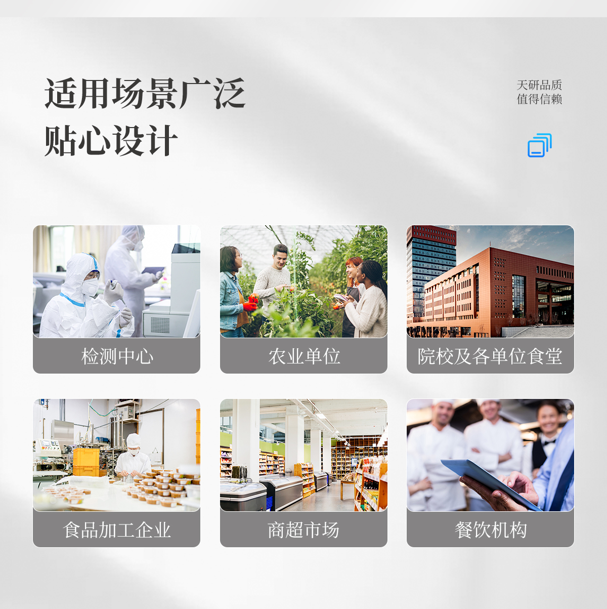 該多功能食品安全檢測(cè)儀為集成化食品安全快速檢測(cè)分析設(shè)備,廣泛應(yīng)用于市場(chǎng)監(jiān)管局、食品肉產(chǎn)品深加工企業(yè)、學(xué)校食堂、衛(wèi)生部門、畜牧部門、屠宰場(chǎng)、檢驗(yàn)檢疫部門等單位使用。