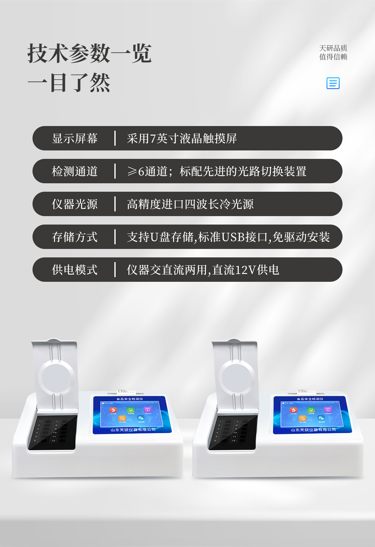| 主控芯片采用ARM Cortex-A7,RK3288/4核處理器,主頻1.88Ghz,運轉(zhuǎn)速度更快速,穩(wěn)定性更強。 | 顯示方式:7英寸液晶觸摸屏顯示,人性化中文操作界面,讀數(shù)直觀、簡單。 | 交直流兩用,直流12V供電,也可連接車載電源,可加配6ah大容量充電鋰電池,方便戶外流動測試。 | 四波長冷光源,12個檢測通道,每個通道均配置410、520、590、630nm波長光源,標配**的光路切換裝置,專業(yè)光路切換功能可實現(xiàn)最多64波長,并且所有檢測項目可實現(xiàn)所有通道同時檢測 | 光源亮度自動調(diào)節(jié)與校準 | 智能恒流穩(wěn)壓,光強自動校準,長時間連續(xù)工作光源無溫漂現(xiàn)象。 | 內(nèi)置新國家限量標準,與所測結(jié)果進行現(xiàn)場比對,并持續(xù)更新標準。 | 不間斷進樣,連續(xù)檢測 | 樣本編號自動累加。 | 檢測結(jié)果為Excel表格,連接電腦即可拷貝。 | 檢測結(jié)果存儲容量20萬條 | 支持U盤存儲,標準USB接口,免驅(qū)動安裝。 | 檢測項目可擴充,固件可升級 | 儀器尺寸:43×35×20cm, 主機凈重:5.2g |