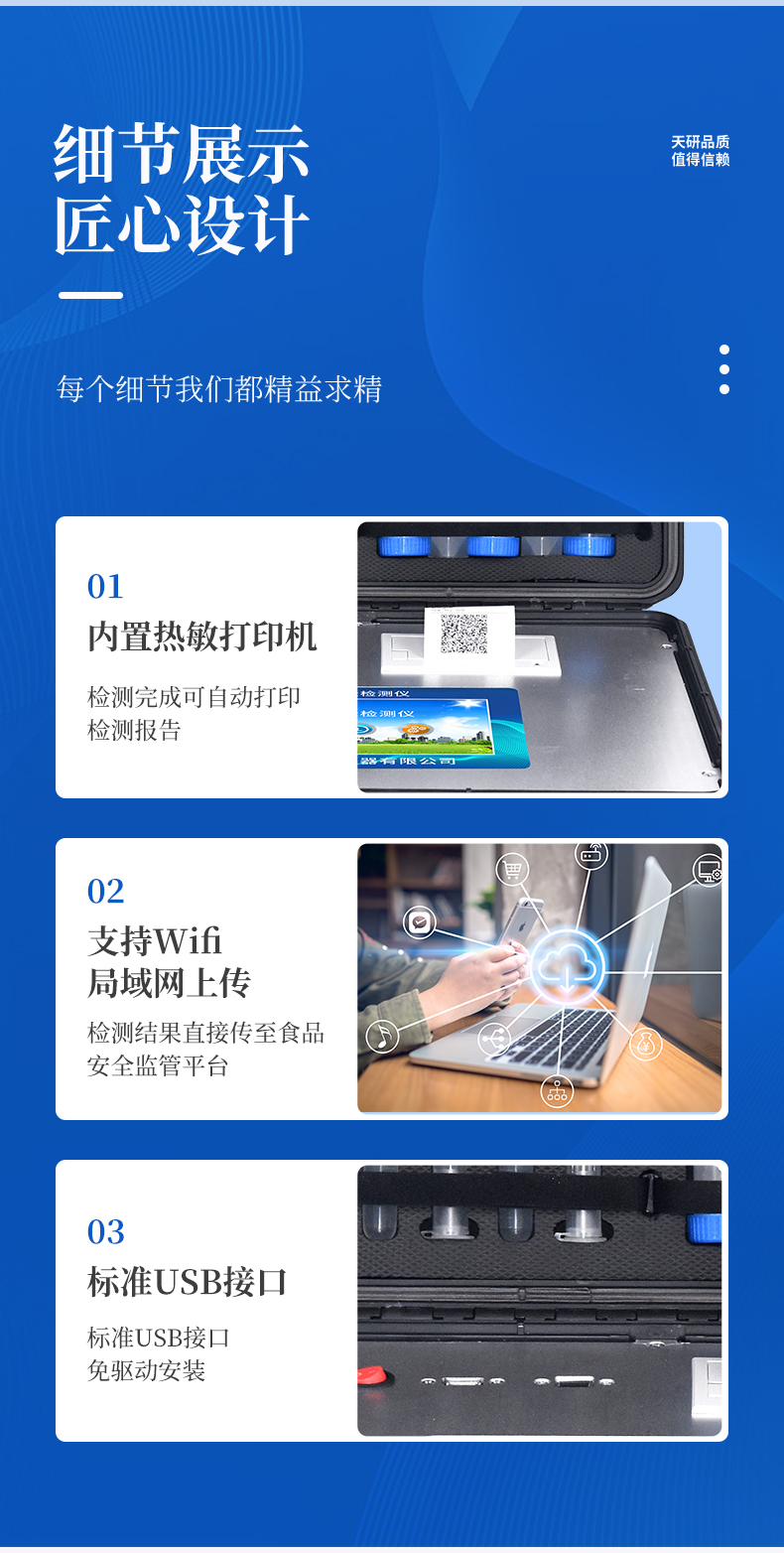 | 安卓智能操作系統(tǒng),采用更加**UI交互界面,儀器具有wifi聯(lián)網(wǎng)上傳、4G聯(lián)網(wǎng)傳輸、GPRS無線遠(yuǎn)傳、網(wǎng)線連接功能,快速批量上傳數(shù)據(jù)。 | 智能化程度高,儀器具有自檢功能:具有開機(jī)自檢和調(diào)零功能,具有自動檢測重復(fù)性功能。 | 新一代高速熱敏打印機(jī),檢測完成可自動打印檢測報(bào)告和二維碼。 | 儀器帶有監(jiān)管平臺,數(shù)據(jù)可局域網(wǎng)和互聯(lián)網(wǎng)數(shù)據(jù)上傳,檢測結(jié)果直接傳至食品安全監(jiān)管平臺。進(jìn)行區(qū)域食品安全監(jiān)管及大數(shù)據(jù)分析處理與數(shù)據(jù)統(tǒng)計(jì),檢測區(qū)域食品安全長短期動態(tài),達(dá)到食品安全問題預(yù)估、預(yù)警 | 一體化便攜式快檢設(shè)備,滿足現(xiàn)場及流動檢測使用需求,能夠在同一軟件下實(shí)現(xiàn)所有檢測項(xiàng)目的檢測,并可通過同一窗口直觀顯示檢測結(jié)果。 | 膠體金模塊檢測方式:軌道式自動傳輸掃描,檢測完成后自動退出檢測卡。 | 一體化主機(jī),包含食品安全檢測模塊、多通道農(nóng)藥殘留檢測模塊、膠體金免疫層析檢測模塊。 | CT線自動識別,無需手動調(diào)整。 | 儀器具有品類多種類樣品菜單庫,可靈活選擇檢測樣品,不同的檢測通道可同時檢測不同的樣品項(xiàng)目。。 | 樣品處理簡單省力,整體操作快速、安全、便捷。 | 儀器具有自身保護(hù)功能,可設(shè)置用戶名及密碼,防止非工作人員操作等。 | 高靈敏度,高檢測精度,高重復(fù)性精度,掃描式高精度光學(xué)傳感器。 | 儀器具有重新校準(zhǔn)、鎖定、恢復(fù)出廠設(shè)置功能。 | 內(nèi)置強(qiáng)大的數(shù)據(jù)庫,可在儀器上直接選擇樣品名稱、檢測指標(biāo)、送檢單位等信息,也可在儀器上直接編輯錄入樣品名稱、檢測指標(biāo)、送檢單位等信息并保存進(jìn)樣品數(shù)據(jù)庫。 | 儀器具有重新校準(zhǔn)、鎖定、恢復(fù)出廠設(shè)置功能。 | 結(jié)果判定線可修改,對照值標(biāo)定值可保存,斷電不丟失數(shù)據(jù)。 | 兼容市場上所有的膠體金卡,使用耗材不受限制,極大增強(qiáng)用戶使用體驗(yàn)。 |