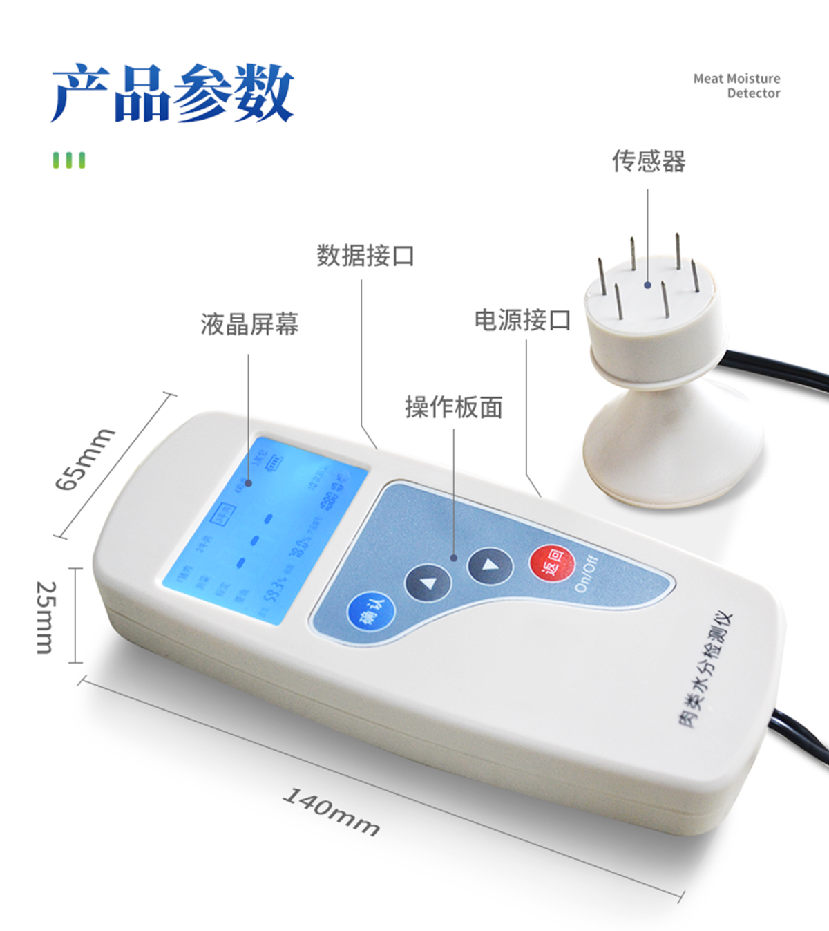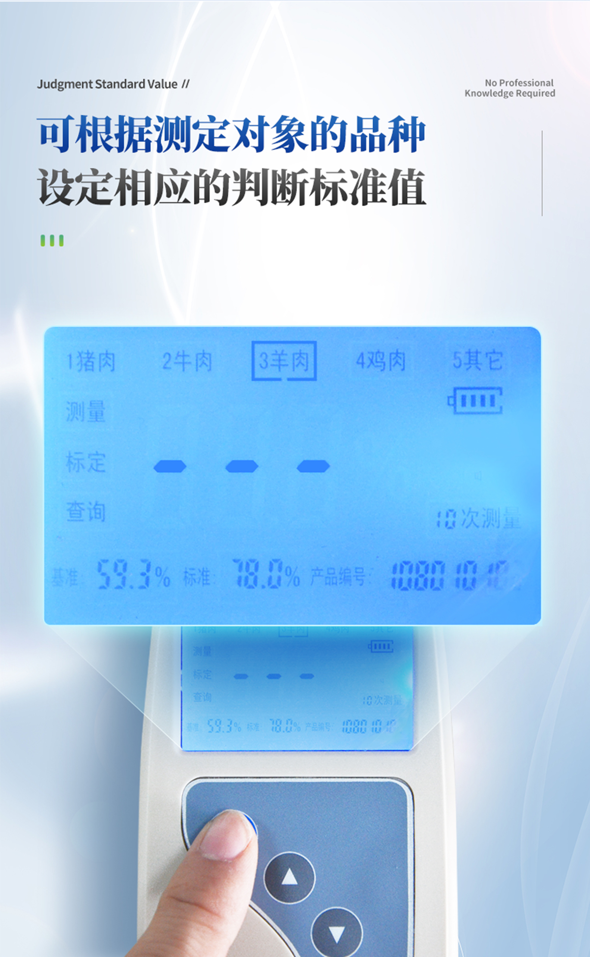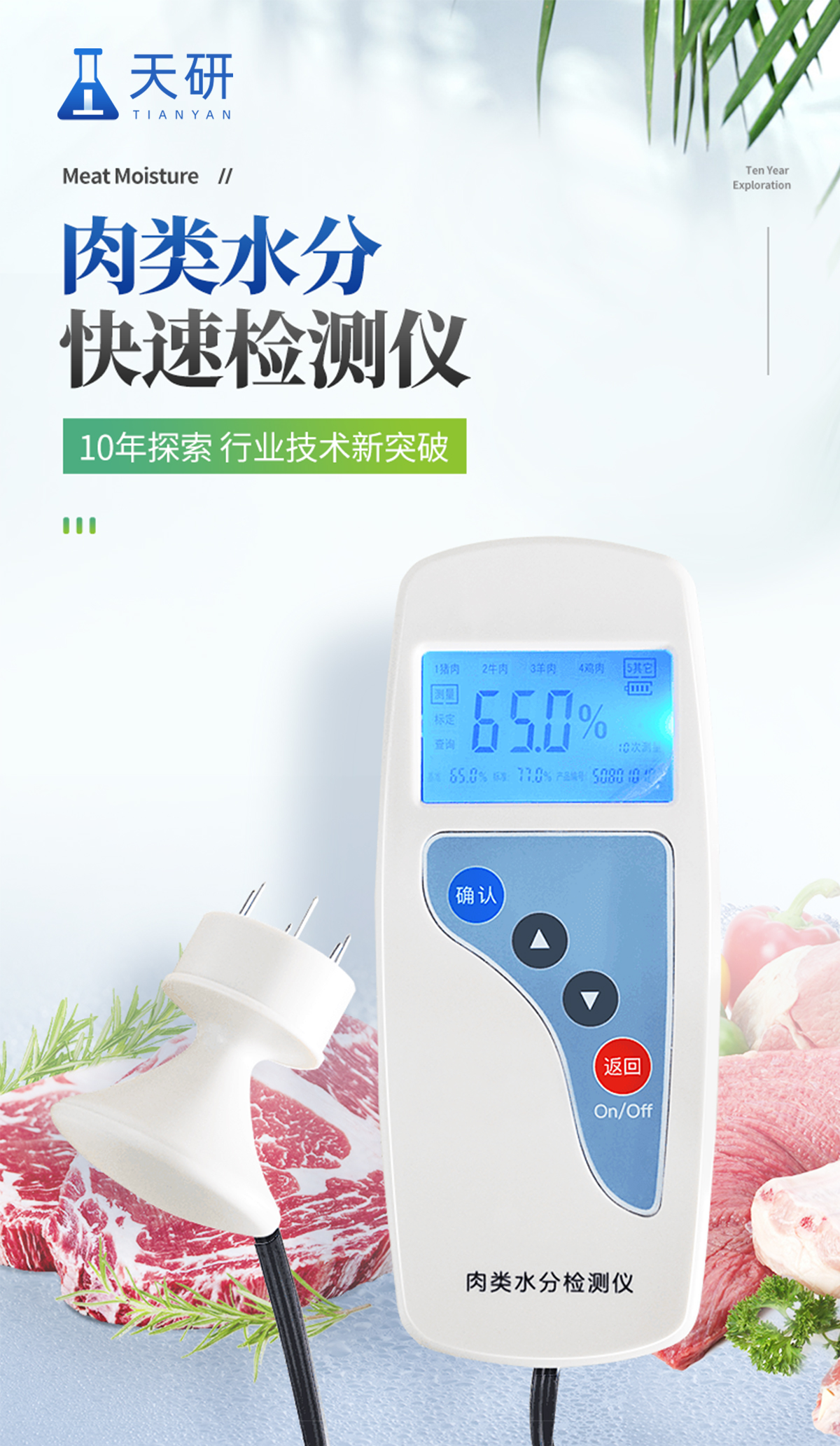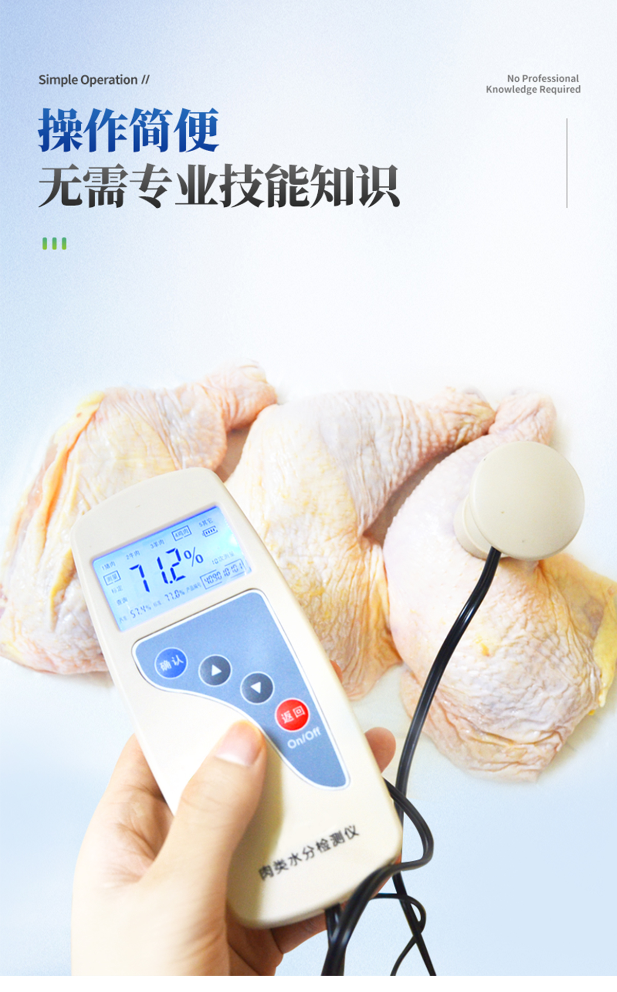 肉類水分檢測儀主要用于快速豬肉、牛肉、雞肉等動物肉類水分含量,從而判斷所測樣品是否為注水肉,該儀器設計精巧,單手可持,儀器可根據(jù)測定對象的品種,設定相應的判斷標準值。