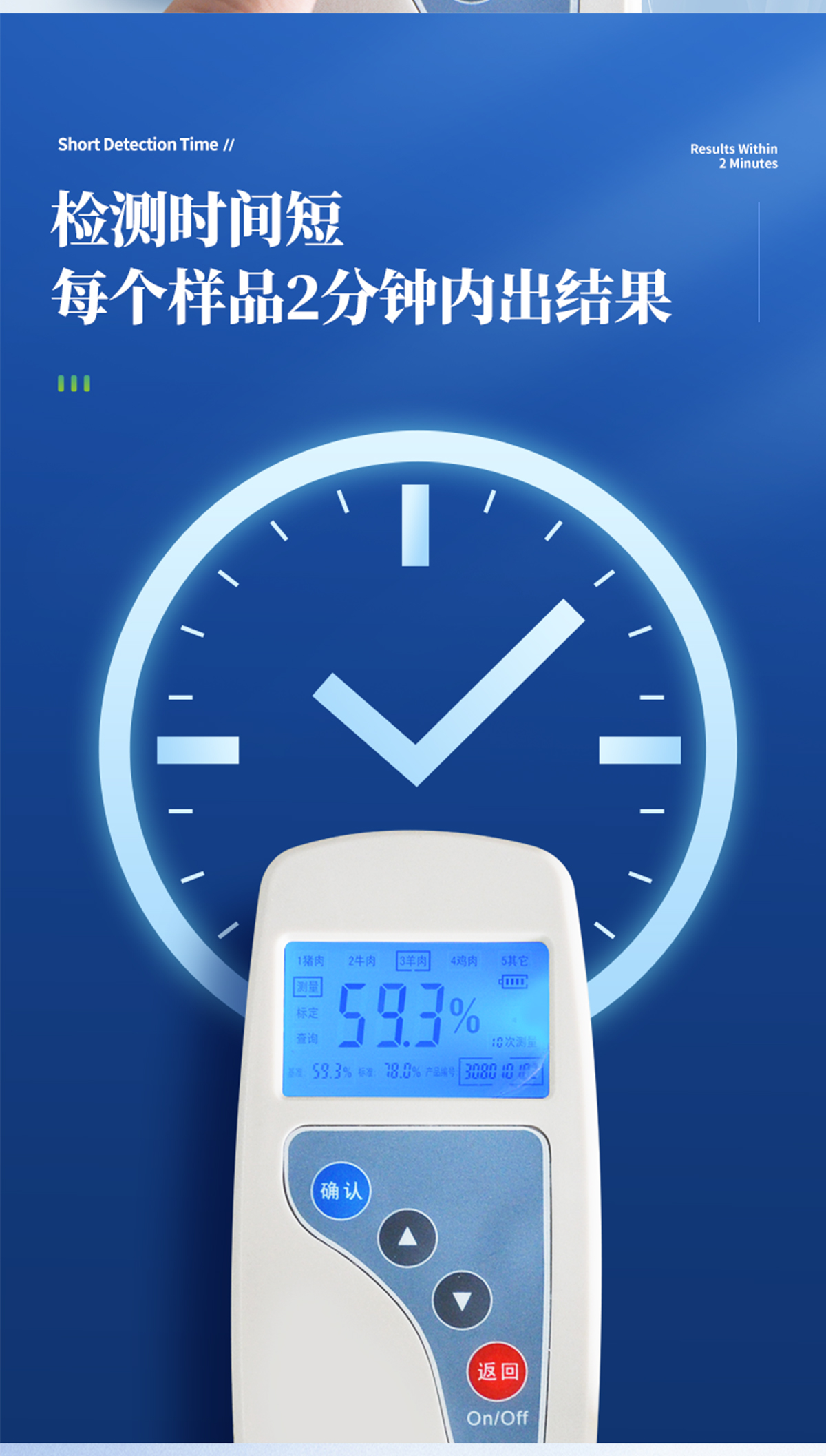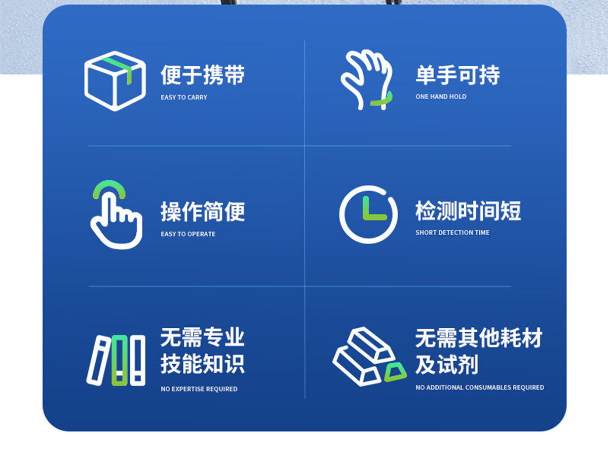 | 便于攜帶,單手可持 | 可根據(jù)測定對象的品種,設定相應的判斷標準值 | 操作簡便,檢測人員無需專業(yè)技能知識 | 檢測時間短,每個樣品2分鐘內(nèi)出結(jié)果; | 檢測試驗無需其他耗材及試劑 |