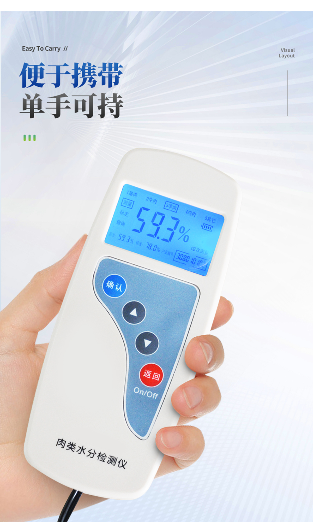 產(chǎn)品簡介: 肉類水分檢測儀主要用于快速豬肉、牛肉、雞肉等動物肉類水分含量,從而判斷所測樣品是否為注水肉,該儀器設計精巧,單手可持,儀器可根據(jù)測定對象的品種,設定相應的判斷標準值。 產(chǎn)品特點: 便于攜帶,單手可持