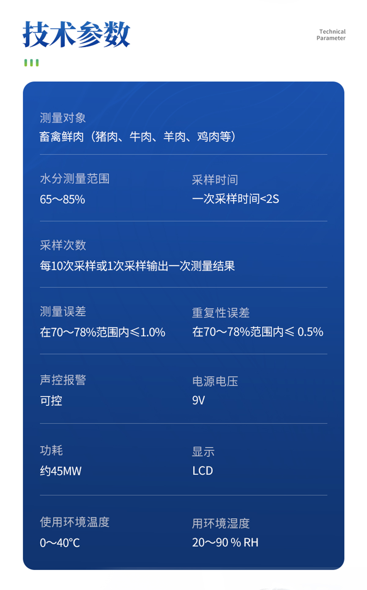 | 畜禽鮮肉(豬肉、牛肉、羊肉、雞肉等) | 65~85% | 一次采樣時間< 1s | 每10次采樣或1次采樣輸出一次測量結(jié)果 | 在70~78%范圍內(nèi)≤1.0% | 在70~78%范圍內(nèi)≤ 0.5% | 超標報警 | 可設定每個品種的判斷標準。 | 交直流兩用 | 觸摸式按鍵 | 45mW | 167×70×30mm | 藍色背光LCD | 0~40℃ | 20~90 % RH | USB接口 |
