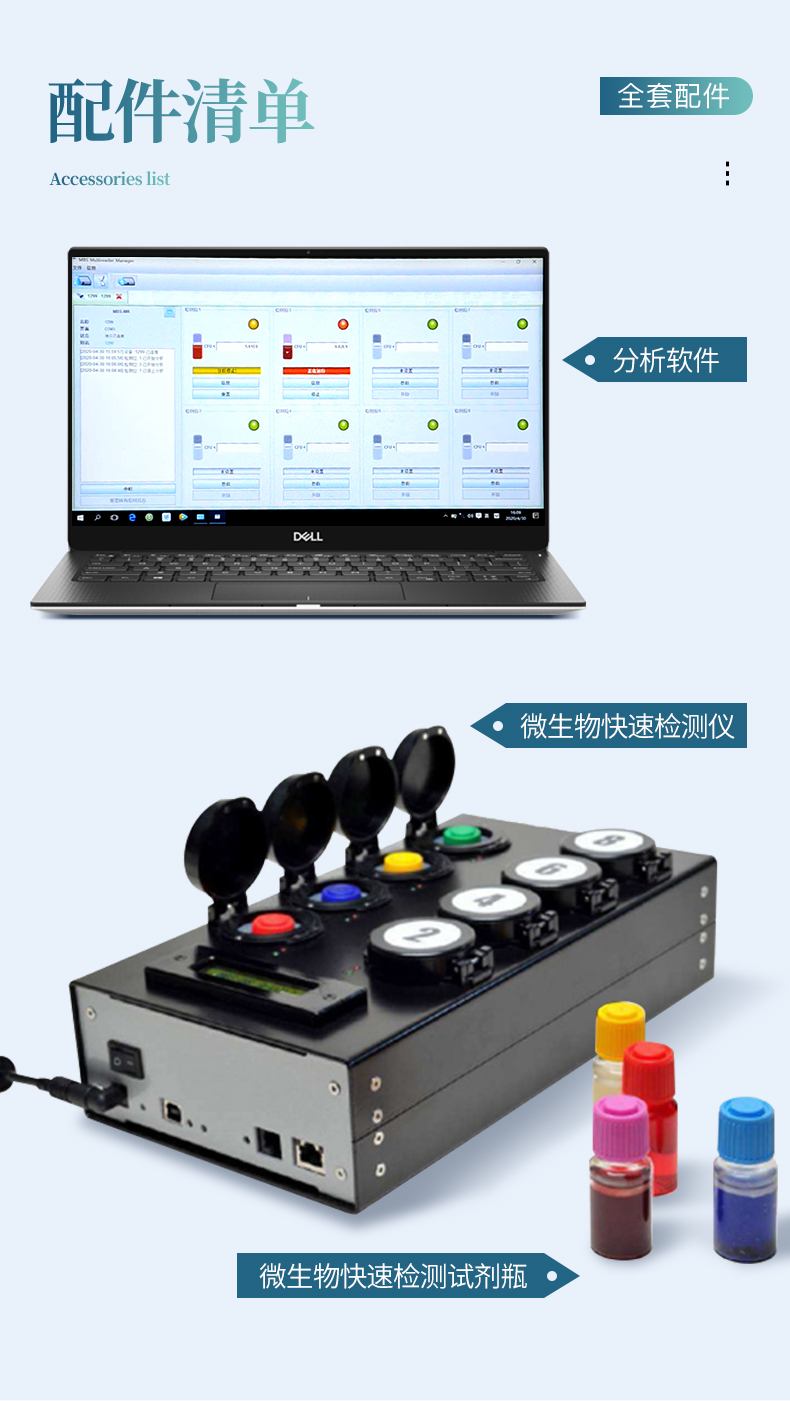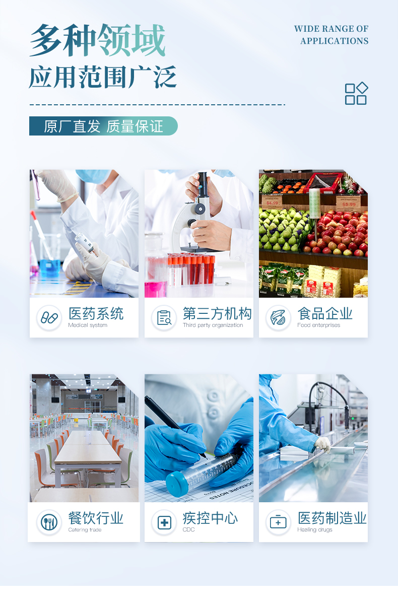 | 衛(wèi)生控制: -食品(HACCP) -廚房、工具、表面(HACCP) -水質(zhì) -(CDC)疾病控制、進(jìn)出口檢驗(yàn)檢疫 -藥品及 化妝品 | 與我們的生活息息相關(guān),例如: 咖啡館、餐廳 ,水源檢測(cè)、制水廠 ,分析實(shí)驗(yàn)室和HACCP診斷 ,農(nóng)產(chǎn)品及相關(guān)加工公司 ,藥廠、藥房、化妝品廠 ,環(huán)境監(jiān)測(cè)機(jī)構(gòu) ,水配送公司 ,消費(fèi)者保護(hù)團(tuán)體、工商管理機(jī)構(gòu) ,室內(nèi)空調(diào)調(diào)節(jié)公司 | 集傳統(tǒng)檢驗(yàn)方法優(yōu)點(diǎn)于一身:培養(yǎng)皿法、 酶法(β-葡萄糖苷酸酶分析)、 -免疫法(抗原搜尋)、基因法(基因搜尋) | 檢驗(yàn)樣本無(wú)需任何前處理 :-液態(tài)樣本,固態(tài)樣本和表面樣本均無(wú)需前處理 ; | 定性和定量分析 :-搭配檢測(cè)機(jī):100%的定量分析 、肉眼判讀:定性或半定量分析 ; | 簡(jiǎn)單便捷 :簡(jiǎn)單的三個(gè)步驟得到檢測(cè)結(jié)果 ; | 檢驗(yàn)迅速 :是傳統(tǒng)檢驗(yàn)方法速度的2~5倍 ; | 高靈敏性:可以檢測(cè)到1目標(biāo)微生物(理論極值); | 高特異性 :特異性高達(dá)99.999%(理論極值) ; | 檢測(cè)瓶就是實(shí)驗(yàn)室 :微生物檢測(cè)瓶隨時(shí)可用、未受過(guò)嚴(yán)格專業(yè)訓(xùn)練的檢測(cè)人員也可隨時(shí)隨地進(jìn)行檢測(cè) ; | 使用后安全丟棄 :和過(guò)期藥物同樣處理 ; |