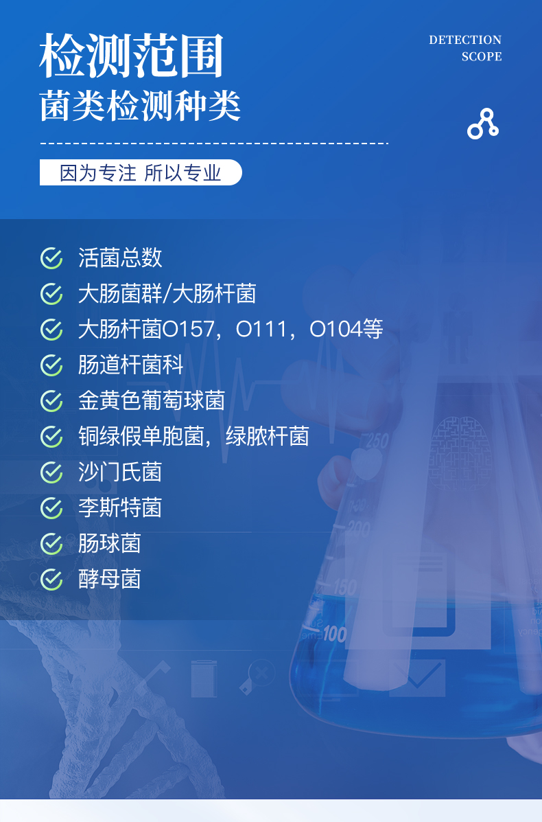 | 活細(xì)菌總數(shù) :大腸菌群/糞大腸菌群/大腸桿菌/大腸桿菌O157, O111, O104...等 | 腸道桿菌科 :金黃色葡萄球菌 銅綠假單胞菌;綠膿桿菌 沙門氏菌 李斯特菌 腸球菌 酵母菌 |