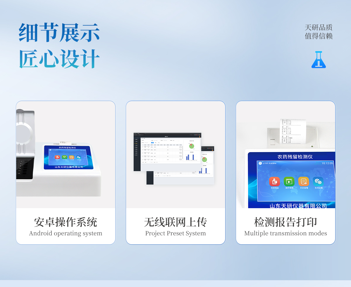 | 乙酰膽堿酯酶和丁酰膽堿酯酶試劑均可以使用,符合國(guó)家標(biāo)準(zhǔn)和農(nóng)業(yè)部標(biāo)準(zhǔn)的要求。 | 自動(dòng)判斷樣品是否合格,檢測(cè)結(jié)果更加直觀。 | 儀器具有100多種蔬菜名稱菜單庫(kù),分類管理,并可按需添加或刪除蔬菜名,編輯蔬菜名稱,可直接打印出蔬菜名稱。 | 檢測(cè)通道:12個(gè)檢測(cè)通道,可以同時(shí)測(cè)試多個(gè)樣品,循環(huán)檢測(cè),即放即檢,每個(gè)樣品由程序控制分別獨(dú)立工作,不會(huì)互相干擾。 | 智能操作系統(tǒng),采用更加人性化操作,主控采用多核處理器,主頻1.88Ghz,運(yùn)轉(zhuǎn)速度更快速,穩(wěn)定性更強(qiáng)。 | 顯示方式:7英寸高靈敏真彩觸摸屏顯示,人性化中文操作界面,讀數(shù)直觀、簡(jiǎn)單。 | 打印機(jī)采用串口5v打印,可選擇手動(dòng)打印或者自動(dòng)打印,三分鐘出打印結(jié)果,打印格式為檢測(cè)人姓名、吸光度差值、檢測(cè)時(shí)間、檢測(cè)機(jī)構(gòu)、樣品名稱及結(jié)果判定。 | 光源采用進(jìn)口超高亮發(fā)光二極管,具有低功耗、高精度、穩(wěn)定性強(qiáng)、光源可控可以關(guān)掉不使用的光源,響應(yīng)速度快等優(yōu)點(diǎn)。 | 智能恒流穩(wěn)壓,光強(qiáng)自動(dòng)校準(zhǔn),長(zhǎng)時(shí)間連續(xù)工作光源無(wú)溫漂現(xiàn)象。 | 儀器具有GPRS遠(yuǎn)傳功能,可插手機(jī)卡實(shí)現(xiàn)數(shù)據(jù)遠(yuǎn)傳平臺(tái),wifi聯(lián)網(wǎng)功能,可將數(shù)據(jù)快速上傳電腦,進(jìn)行數(shù)據(jù)管理與統(tǒng)計(jì)。 | 采用USB2.0接口設(shè)計(jì),方便數(shù)據(jù)的存貯和移動(dòng),并可隨時(shí)與計(jì)算機(jī)直接相連,并且可用計(jì)算機(jī)控制儀器。實(shí)現(xiàn)數(shù)據(jù)查詢、瀏覽、分析、統(tǒng)計(jì)、打印等。 | 智能化程度高,儀器具有自檢功能:具有開機(jī)自檢和調(diào)零功能,具有自動(dòng)檢測(cè)重復(fù)性功能 | 儀器具有自身保護(hù)功能,可設(shè)置用戶名及密碼,防止非工作人員操作等。 | 采用DC12v直流供電,安全系統(tǒng)更高,并且配備6A鋰電池充電器。 | 儀器具有重新校準(zhǔn)、鎖定、恢復(fù)出廠設(shè)置功能。 |