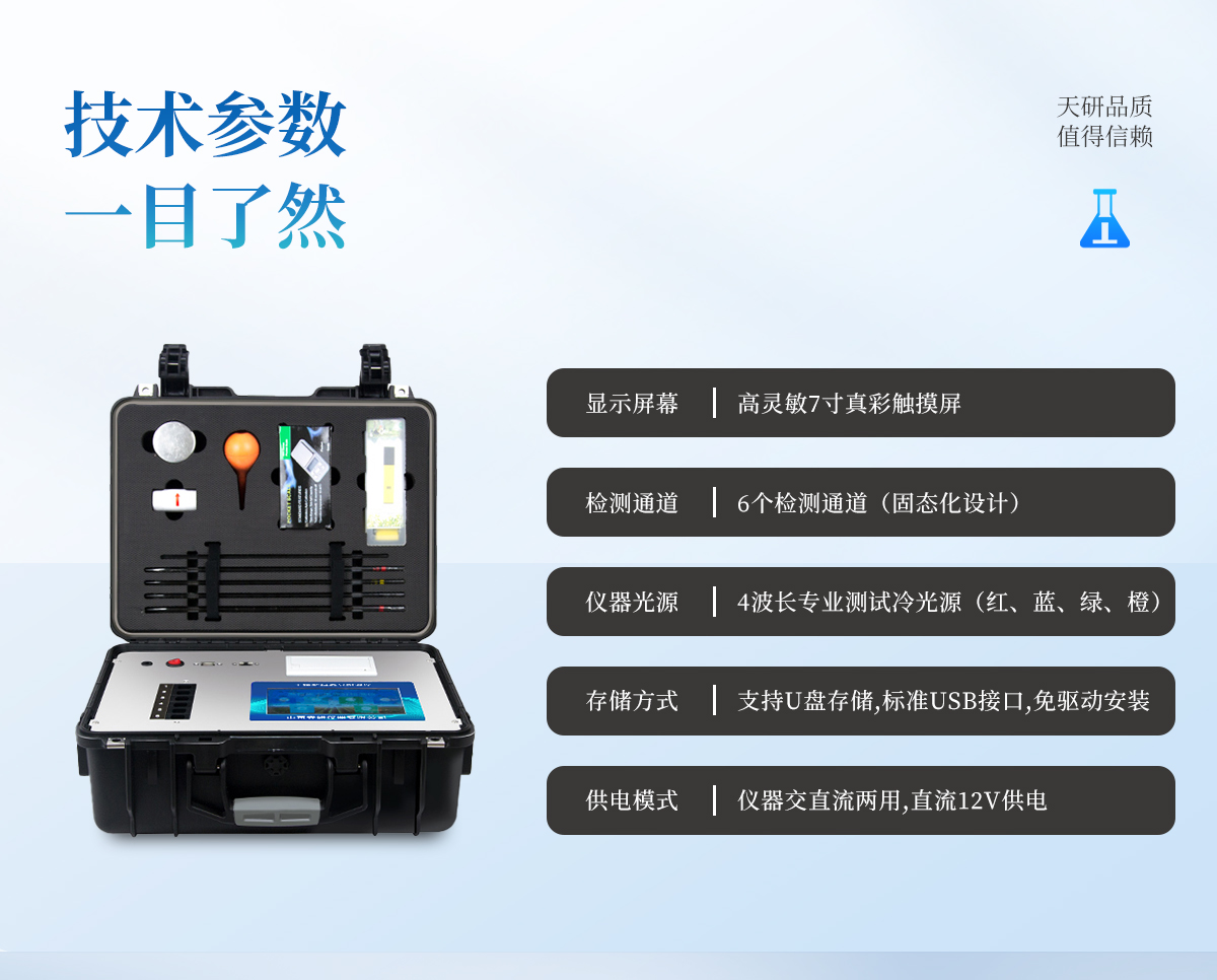 | 1、本儀器集各功能于一身,無(wú)需用戶自配附件,可靈活流動(dòng)檢測(cè)。 | 2、安卓智能操作系統(tǒng),主控芯片采用ARM Cortex-A7,RK3288/4核處理器,主頻1.88Ghz,運(yùn)轉(zhuǎn)速度更快速,穩(wěn)定性更強(qiáng)。 | 3、6個(gè)檢測(cè)通道(固態(tài)化設(shè)計(jì)),一次性可快速檢測(cè)6個(gè)樣品,極大提升檢測(cè)效率,降低檢測(cè)成本。 | 4、檢測(cè)過(guò)程中內(nèi)置校準(zhǔn)功能,智能恒流穩(wěn)壓,光強(qiáng)自動(dòng)校準(zhǔn),確保檢測(cè)準(zhǔn)確度。 | 5、內(nèi)置作物專家施肥系統(tǒng),可對(duì)百余種全國(guó)農(nóng)業(yè)經(jīng)濟(jì)作物、果樹等的目標(biāo)產(chǎn)量計(jì)算推薦施肥量,依據(jù)施肥配方科學(xué)指導(dǎo)農(nóng)業(yè)生產(chǎn)。測(cè)土配方施肥結(jié)果可打印,打印內(nèi)容包含:作物種類、肥料種類、目標(biāo)產(chǎn)量、需求總量、建議施肥方案。 | 6、儀器標(biāo)配wifi無(wú)線上傳、4G聯(lián)網(wǎng)傳輸、GPRS無(wú)線遠(yuǎn)傳功能,快速上傳數(shù)據(jù)。 | 7、儀器內(nèi)置大容量?jī)?nèi)存,支持查看全部歷史檢測(cè)記錄,以及傳輸所有檢測(cè)數(shù)據(jù)。 | 8、配有智慧云農(nóng)業(yè)平臺(tái),儀器連入無(wú)線網(wǎng)絡(luò)后,可將檢測(cè)數(shù)據(jù)可選擇性或批量無(wú)線上傳,方便用戶進(jìn)行長(zhǎng)期數(shù)據(jù)管理和可視化分析 | 9、儀器同時(shí)具有USB接口、以太網(wǎng)接口,并可隨時(shí)用U盤拷貝出數(shù)據(jù)。 | 10、可用手機(jī)隨時(shí)登錄云平臺(tái)在線移動(dòng)查看歷史數(shù)據(jù) | 11、內(nèi)置植物營(yíng)養(yǎng)診斷標(biāo)準(zhǔn)圖譜,根據(jù)各農(nóng)作物營(yíng)養(yǎng)缺失的圖片,進(jìn)行葉面對(duì)比,診斷豐缺。 | 12、4波長(zhǎng)專業(yè)測(cè)試?yán)涔庠矗t、藍(lán)、綠、橙),光源波長(zhǎng)穩(wěn)定,長(zhǎng)時(shí)間連續(xù)工作光源無(wú)溫漂現(xiàn)象,壽命長(zhǎng)達(dá)10萬(wàn)小時(shí)級(jí)別,重現(xiàn)性好,準(zhǔn)確度高。 | 13、比色池部分采用標(biāo)準(zhǔn)1cm比色皿,無(wú)機(jī)械位移及磨損,光路測(cè)試定位**,有效屏蔽外光干擾,保證檢測(cè)結(jié)果優(yōu)于國(guó)標(biāo)要求。 | 14、儀器系統(tǒng)內(nèi)帶有樣品前處理操作視頻,各種樣品檢測(cè)方法點(diǎn)擊視頻模塊即可觀看,檢測(cè)人員無(wú)需自學(xué)說(shuō)明書,指導(dǎo)教學(xué)方便快速,方便新手快速操作。 | 15、內(nèi)置新一代高速熱敏打印機(jī)(無(wú)需色帶),打印內(nèi)容包含:檢測(cè)單位、檢測(cè)人員、檢測(cè)項(xiàng)目、通道號(hào)、吸光度、養(yǎng)分含量(mg/kg)、檢測(cè)時(shí)間、以及二維碼等信息 | 16、高靈敏7寸真彩觸摸屏,采用更加**和人性化操作,高清晰高交互顯示,大程度降低傳統(tǒng)儀器的繁瑣操作和失誤。 | 17、內(nèi)置時(shí)鐘功能,方便操作時(shí)間記錄,長(zhǎng)期歷史追溯。 | 18、可設(shè)置多賬戶賬號(hào)密碼登錄,**UI交互界面,不同的用戶可自由添加編輯檢測(cè)信息,保存后可長(zhǎng)期使用。 | 19、GPS功能:可在野外作業(yè)時(shí)記錄經(jīng)緯度地點(diǎn),滿足特殊用戶需求。 | 20、內(nèi)置低電壓提示功能,可在檢測(cè)時(shí)明確電量,避免測(cè)試數(shù)據(jù)偏移,同時(shí)具有斷電保護(hù)功能,斷電自動(dòng)保存數(shù)據(jù),防止數(shù)據(jù)丟失。 | 21、交直流兩用供電方式,內(nèi)置大容量充電鋰電池,滿電狀態(tài)下可連續(xù)工作10余小時(shí),同時(shí)可外接車載電源蓄電。 | 22、儀器具有中英文切換功能,可滿足出口要求。 | 23、高強(qiáng)度PVC工程塑料手提箱設(shè)計(jì),堅(jiān)固耐用,便于攜帶。 |