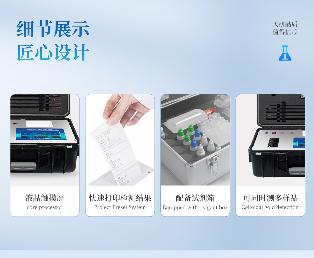 | 配套齊全:該儀器集藥、器、儀為一體,攜帶方便,相當(dāng)于一個(gè)小型移動(dòng)實(shí)驗(yàn)室,無(wú)需用戶自配附件,亦可靈活野外流動(dòng)測(cè)試。適于農(nóng)業(yè)服務(wù)部門或農(nóng)資經(jīng)銷商、合作社、肥料廠商、大種植戶測(cè)土施肥。 | 檢測(cè)功能全:測(cè)試項(xiàng)目國(guó)內(nèi)外全面,除標(biāo)配試劑外,其他各類藥劑均可加配選購(gòu)。 | 操作簡(jiǎn)便、速度快捷,配套整套附件及成品藥劑開瓶即用,無(wú)須配置。 |