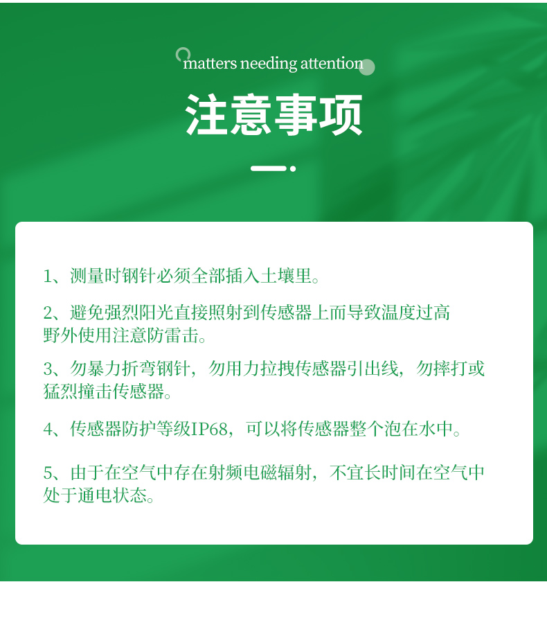 | 信號(hào)輸出類型:電壓輸出0-2V(輸出阻抗約0歐)電流輸出4-20mA(負(fù)載電阻<500ohm)RS485接口Modbus協(xié)議 | 供電電壓:3.6-30V/DC直流12-30V/DC直流3.6-30V/DC直流 | 靜態(tài)功耗:6mA@24V DC直流50mA@24V DC直流(兩電流輸出通道均為20mA)6mA@24V DC直流 | 土壤水分量程:可選量程:0-50%,0-100%分辨率:0-50%內(nèi)0.03%,50-100%內(nèi)1%精度:0-50%內(nèi)2%,50-100%內(nèi)3% | 電導(dǎo)率量程:可選量程:0-5000us/cm,10000us/cm,20000us/cm分辨率:0-10000us/cm內(nèi)10us/cm, 100000-20000us/cm內(nèi)50us/cm精度0-10000us/cm范圍內(nèi)為±3%; 10000-20000us/cm范圍內(nèi)為±5% | 電導(dǎo)率溫度補(bǔ)償:內(nèi)置溫度補(bǔ)償傳感器,補(bǔ)償范圍0-50℃ | 溫度測(cè)量量程:量程:-40~80℃,分辨率:0.1℃,精度:±0.5℃ | 測(cè)量原理與測(cè)量方式:土壤水分FDR方法,土壤電導(dǎo)率交流電橋法土壤原位插入或浸沒入培養(yǎng)液、水肥一體營(yíng)養(yǎng)液中直接測(cè)試 | 防護(hù)等級(jí):IP68浸沒水中可長(zhǎng)期使用 | 運(yùn)行環(huán)境:-40~85℃ | 探針材料:防腐特制電極 | 密封材料:黑色阻燃環(huán)氧樹脂 | 安裝方式:全部埋入或探針全部插入被測(cè)介質(zhì) | 默認(rèn)線纜長(zhǎng)度:2米,線纜長(zhǎng)度可按要求定制 | 連接方式:預(yù)裝冷壓端子 | 外形尺寸:45*15*145mm | 電極長(zhǎng)度:70mm |