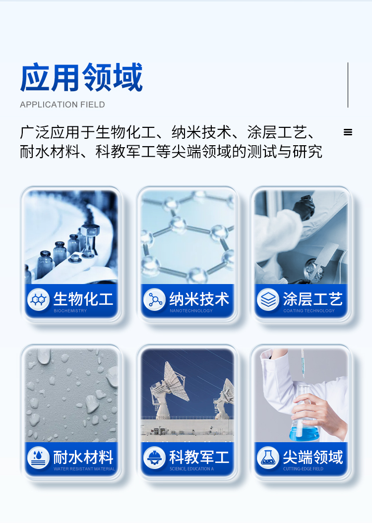 本機(jī)用于測試和分析液體在固體表面的接觸角、液體的表面張力、固體的表面能等。實現(xiàn)對固體表面的親/疏水性分析、潤濕性分析、潔凈度檢測、處理工藝效果評估,以及液體被競爭、吸附、吸收和鋪展等過程分析。廣泛應(yīng)用于化工、醫(yī)藥、食品、電子、印染、噴涂、軍工和科教等眾多領(lǐng)域的測試與研究。
