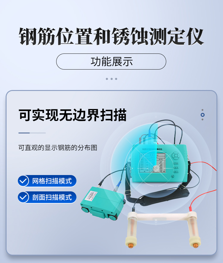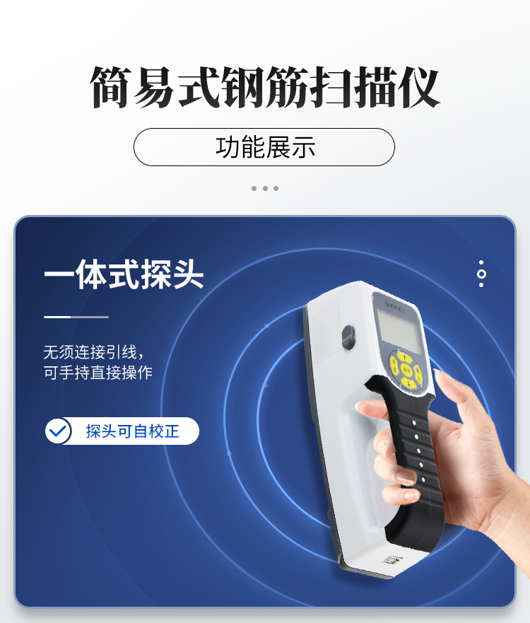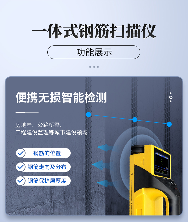 | 檢測混凝土結(jié)構(gòu)中鋼筋的位置及走向 | 檢測鋼筋的保護(hù)層厚度 | 探明結(jié)構(gòu)中其它磁性物體的分布 | 探頭自校正功能 |