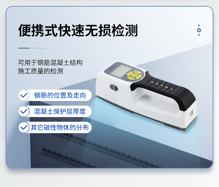 該機(jī)為內(nèi)置一體式探頭,無須連接引線,可手持直接操作是一種便攜式無損鋼筋保護(hù)層厚度檢測儀器。可用于鋼筋混凝土結(jié)構(gòu)施工質(zhì)量的檢測。能夠在混凝土表面確定鋼筋的位置、布筋情況,測量混凝土保護(hù)層厚度,此外也可對混凝土結(jié)構(gòu)中的磁性體及導(dǎo)電體的位置進(jìn)行檢測,如墻體內(nèi)的電纜、水暖管道等,施工前的探測可以有效避免施工中對這些設(shè)施的損壞,減少意外的發(fā)生。 依據(jù)標(biāo)準(zhǔn)產(chǎn)品符合《混凝土結(jié)構(gòu)工程施工質(zhì)量驗(yàn)收規(guī)范》 GB 50204-2002 對鋼筋檢測儀的要求。