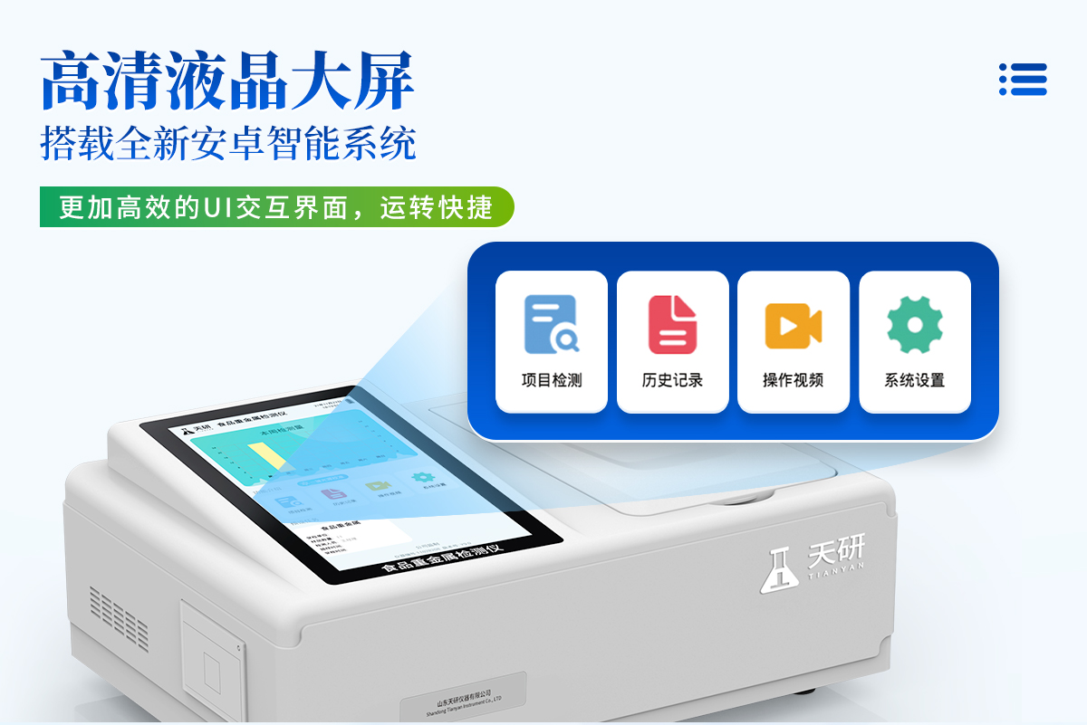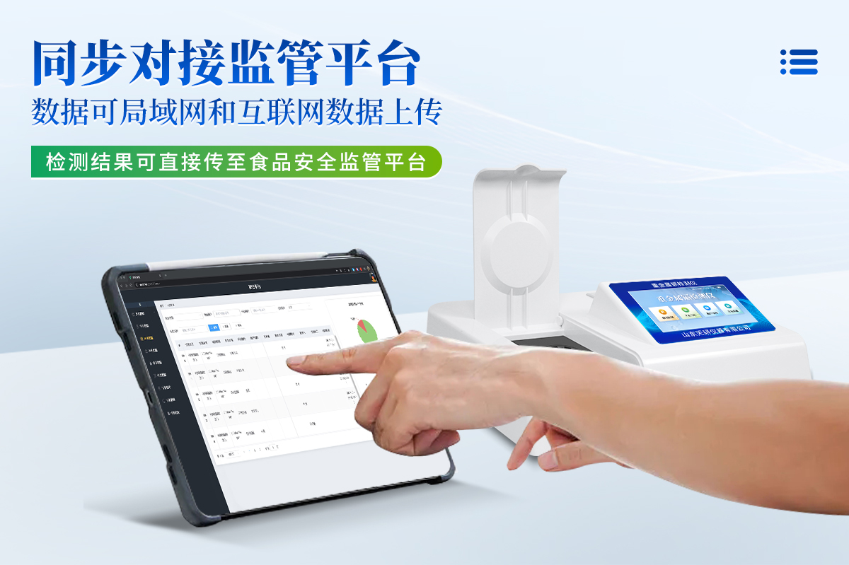 | 儀器采用臺式一體化系統(tǒng)檢測技術,將分光光度模塊、數字化管理模塊、無線通訊模塊高度集成于一體,同時預留升級檢測方法 | 儀器檢測模塊標準化、智能化,檢測項目可隨意自由組合。檢測箱體內置多個標準檢測單元,檢測模塊可以調整配置。 | 顯示屏幕:儀器采用7英寸液晶觸摸屏,搭配運行安卓智能操作系統(tǒng),主控芯片采用ARM Cortex-A7,RK3288/4核處理器,主頻1.88Ghz,操作方便,性能更強。 | 檢測通道:12通道;采用精密旋轉比色池設計,使用同芯片同光源校準精度,解決不同光源之間的誤差值,更加準確**。 | 儀器光源:高精度進口四波長冷光源,每個通道均配置 410、520、590、630nm 波長光源,標配**的光路切換裝置,光路切換功能可實現64波長,并且所有檢測項目可實現所有通道同時檢測。 | 通訊接口:配備無線通信模塊、可選配4G(APN)通訊模塊和藍牙傳輸,同時具有USB接口,可以多方式實現數據保存及數據傳輸。 | 存儲方式:支持U盤存儲,標準USB接口,免驅動安裝。檢測結果存儲容量20萬條以上,可生成Excel表格進行拷貝,并具有登錄保護功能。 | 智能化操作系統(tǒng): | 操作系統(tǒng):儀器可在同一檢測界面自動對應相關檢測通道,一次性選擇1-12個樣品名稱,無需退出界面,節(jié)省操作時間。并可以對每個通道屬性和樣品信息單獨進行編輯,例如送檢單位、人員,檢測人員等,打印時勾選打印顯示。 | 限量規(guī)判系統(tǒng):具有限量查詢、添加物質合規(guī)判定系統(tǒng)。檢測出結果后,系統(tǒng)自動調用系統(tǒng)數據庫中相關國標進行比對判定,客觀顯示結果是否合格。 | 數據監(jiān)管系統(tǒng):同步對接監(jiān)管平臺,數據可局域網和互聯網數據上傳,檢測結果可選擇直接傳至食品安全監(jiān)管平臺。進行區(qū)域食品安全監(jiān)管及大數據分析處理與數據統(tǒng)計,檢測區(qū)域食品安全長短期動態(tài),達到食品安全問題預估、預警。 | 供電模式:儀器交直流兩用,直流12V供電(標配),可連接車載電源,亦可選配6ah大容量充電鋰電池,電量可實時顯示,方便戶外流動測試。 | 儀器具有重新校準、鎖定、恢復出廠設置功能 |