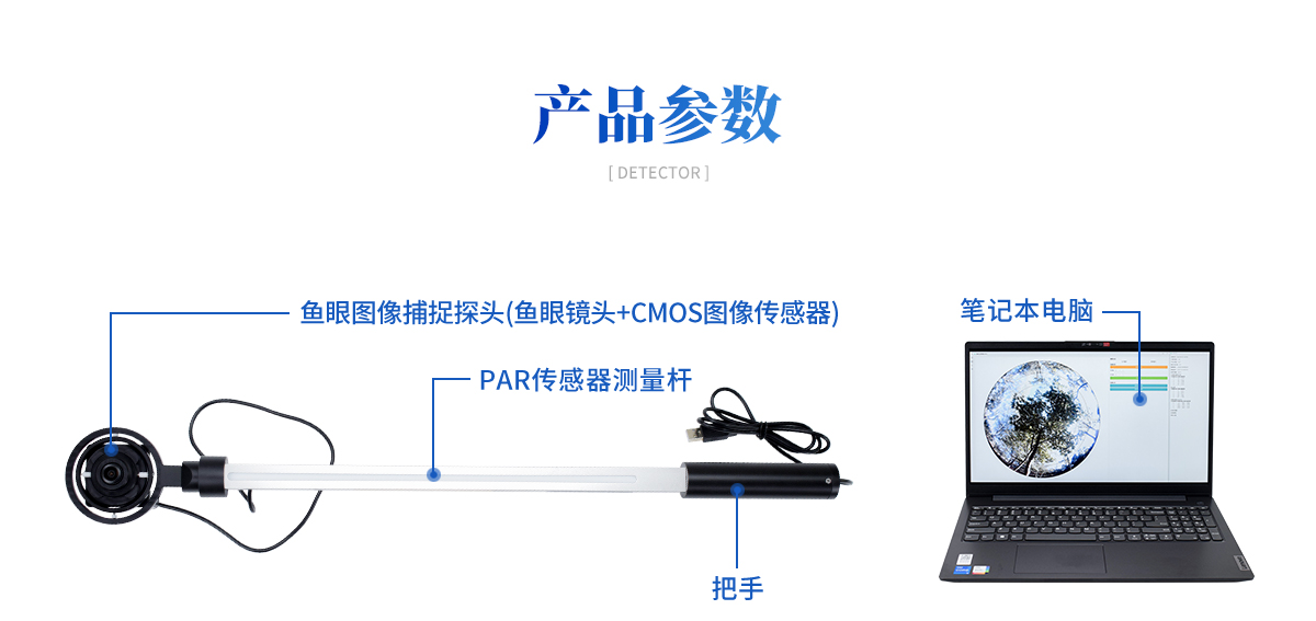 植物冠層圖像分析儀由魚眼圖像捕捉探頭(由魚眼鏡頭及CCD圖像傳感器組成)、內(nèi)置25個(gè)PAR傳感器的測(cè)量桿(搖臂)、筆記本電腦、圖像采集軟件及圖像 分析軟件、高容量的可充電電池組組成。魚眼探頭安裝在一個(gè)很輕的搖臂的頂端,它可以獲取150°視角的魚眼圖像。圖像的顯示和存貯由配置的筆記本計(jì)算機(jī)完 成。