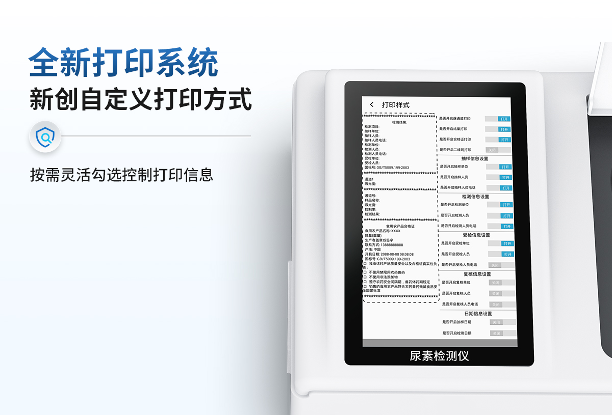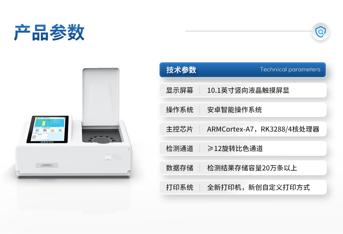 | 儀器采用臺式一體化系統(tǒng)檢測技術(shù),將分光光度模塊、數(shù)字化管理模塊、無線通訊模塊高度集成于一體,可支持檢測60種食品安全檢測項目,同時預(yù)留升級檢測方法。 | 儀器檢測模塊標準化、智能化,檢測項目可隨意自由組合。檢測箱體內(nèi)置多個標準檢測單元,檢測模塊可以調(diào)整配置。 | 顯示屏幕:儀器采用10.1英寸豎向液晶觸摸屏顯,搭配運行安卓智能操作系統(tǒng),主控芯片采用ARM Cortex-A7,RK3288/4核處理器,主頻1.88Ghz,操作方便,性能更強。 | 檢測通道:≥12通道;采用精密旋轉(zhuǎn)比色池設(shè)計,使用同芯片同光源校準精度,解決不同光源之間的誤差值,更加準確**。(1-12通道間誤差0.1%,專利號:ZL202022821055.2) | 儀器光源:高精度進口四波長冷光源,每個通道均配置 410、520、590、630nm 波長光源,標配**的光路切換裝置,專利光路切換功能可實現(xiàn)64波長,并且所有檢測項目可實現(xiàn)所有通道同時檢測。 | 設(shè)備可一鍵校準,自動保存校準數(shù)據(jù),自動對比校驗,得到精準光源,采用Android SP存儲數(shù)據(jù),光源數(shù)據(jù)永不丟失,方便每一次使用。 | 通訊接口:配備無線通信模塊、4G(APN)通訊模塊、藍牙傳輸,同時具有雙USB接口以及RJ45網(wǎng)線接口,可以多方式實現(xiàn)數(shù)據(jù)保存及數(shù)據(jù)傳輸。 | 存儲方式:支持U盤存儲,標準USB接口,免驅(qū)動安裝。檢測結(jié)果存儲容量20萬條以上,可生成Excel表格進行拷貝,并具有登錄保護功能。 | 智能化操作系統(tǒng): | 便捷操作系統(tǒng):設(shè)備檢測時可在同一檢測界面自動對應(yīng)相關(guān)檢測通道一次性選擇1-12個樣品名稱,無須退出界面,節(jié)省操作時間。 | 數(shù)據(jù)集成系統(tǒng):設(shè)備首頁自動統(tǒng)計檢測數(shù)據(jù)包含:周檢測數(shù)據(jù)、月檢測數(shù)據(jù),全部檢測總數(shù)量,均包含檢測總數(shù),合格數(shù),不合格數(shù),以及相關(guān)柱形分析圖,對各項檢測數(shù)據(jù)清晰掌握,無需電腦查詢,更加快捷直觀。 | 數(shù)據(jù)庫系統(tǒng):十幾項數(shù)據(jù)庫分類管理儀器:包含項目類型、項目數(shù)據(jù)、檢測數(shù)據(jù)、歷史記錄、國標信息、曲線信息、采樣信息、檢測信息、受檢信息、復(fù)核信息、圖表信息、光源校準信息、打印樣式信息、樣品庫信息等等,數(shù)據(jù)庫之間互相協(xié)調(diào)聯(lián)動保證數(shù)據(jù)的真實完整性。同時產(chǎn)品數(shù)據(jù)庫以及歷史檢測記錄支持一鍵檢索功能。 | 限量規(guī)判系統(tǒng):具有限量查詢、添加物質(zhì)合規(guī)判定系統(tǒng)。檢測出結(jié)果后,系統(tǒng)自動調(diào)用系統(tǒng)數(shù)據(jù)庫中相關(guān)國標進行比對判定,客觀顯示判定結(jié)果是否合格。 | 項目預(yù)設(shè)系統(tǒng):儀器具有任務(wù)預(yù)設(shè)模塊,一鍵提前預(yù)設(shè),給出方便快捷的新檢測方案,每一個任務(wù)分別可以設(shè)置不同的樣品、批次、編號、來源、備注、抽樣信息、檢測信息、受檢信息、復(fù)核信息等更多信息。樣品送檢時一鍵調(diào)取保存信息,并可多次調(diào)取,大大提高檢測效率。 | 數(shù)據(jù)監(jiān)管系統(tǒng):同步對接監(jiān)管平臺,數(shù)據(jù)可局域網(wǎng)和互聯(lián)網(wǎng)數(shù)據(jù)上傳,檢測結(jié)果可選擇直接傳至食品安全監(jiān)管平臺。進行區(qū)域食品安全監(jiān)管及大數(shù)據(jù)分析處理與數(shù)據(jù)統(tǒng)計,檢測區(qū)域食品安全長短期動態(tài),達到食品安全問題預(yù)估、預(yù)警。 | 全新打印系統(tǒng):內(nèi)置全新打印機,新創(chuàng)自定義打印方式,可按需靈活勾選控制:二維碼,抽樣信息、檢測信息,受檢信息、復(fù)核信息、抽樣日期、檢測日期等信息的打印。 | A4紙版本報告打印功能(可選配):設(shè)備擁有兩種結(jié)果展示方式,可以自動生成A4打印模板和小票打印模板兩種樣式,可通過WiFi及網(wǎng)線等方式鏈接外置打印機可進行打印。 | 供電模式:儀器交直流兩用,直流12V供電,可連接車載電源,可配6ah大容量充電鋰電池,電量可實時顯示,方便戶外流動測試。 | 儀器具備遠程升級功能,可定向分客戶分儀器更新,開機后自動更新,并可持續(xù)性免費更新系統(tǒng)版本,無需像傳統(tǒng)產(chǎn)品返廠更新,節(jié)省時間及人力成本并避免了物流運輸返廠升級導(dǎo)致設(shè)備損壞的潛在風(fēng)險。 |