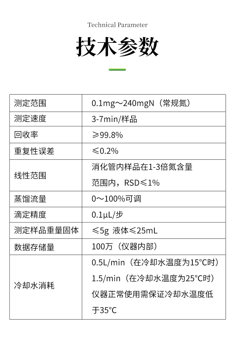 | 1.測定范圍:0.1mg~240mgN(常規(guī)氮) | 2.測定速度:3-7min/樣品 | 3.☆回收率:≥99.8% | 4.☆重復性誤差:≤0.2% | 5.線性范圍:消化管內(nèi)樣品在1-3倍氮含量范圍內(nèi),RSD≤1% | 6.蒸餾流量:0~100%可調(diào) | 7.☆滴定精度:0.1μL/步 | 8.測定樣品重量固體:≤6g 液體≤25mL | 9.☆數(shù)據(jù)存儲量:100萬(儀器內(nèi)部) | 10.☆500組用戶自定義方案 | 11.冷卻水消耗:0.5L/min(在冷卻水溫度為15℃時),1.5/min(在冷卻水溫度為25℃時);儀器正常使用需保證冷卻水溫度低于35℃。 |