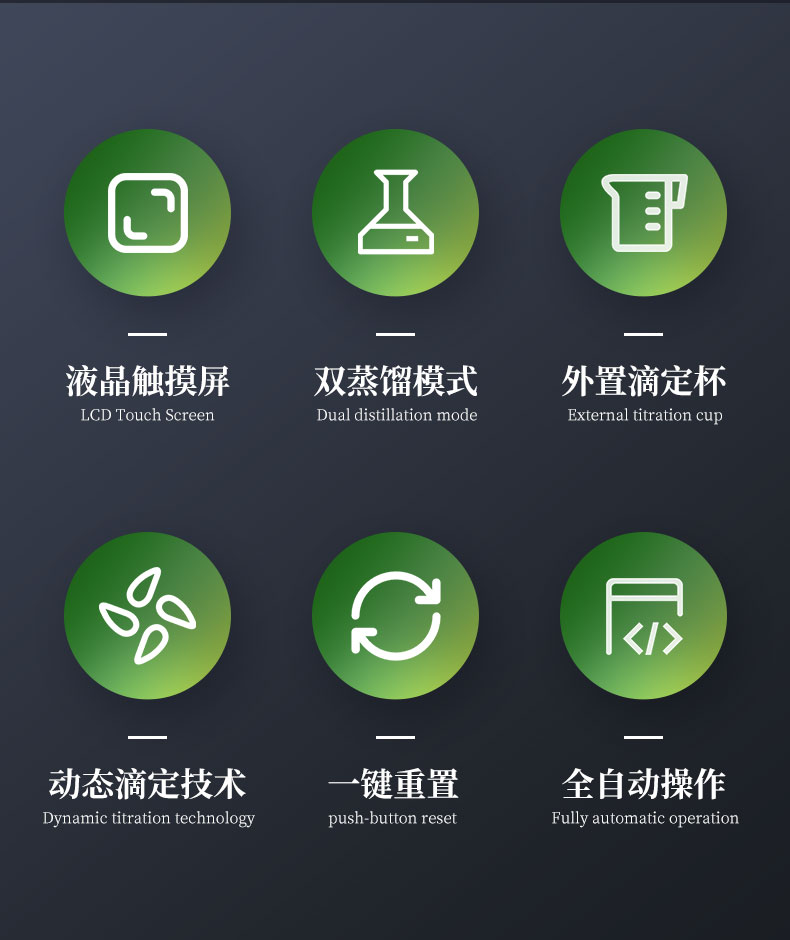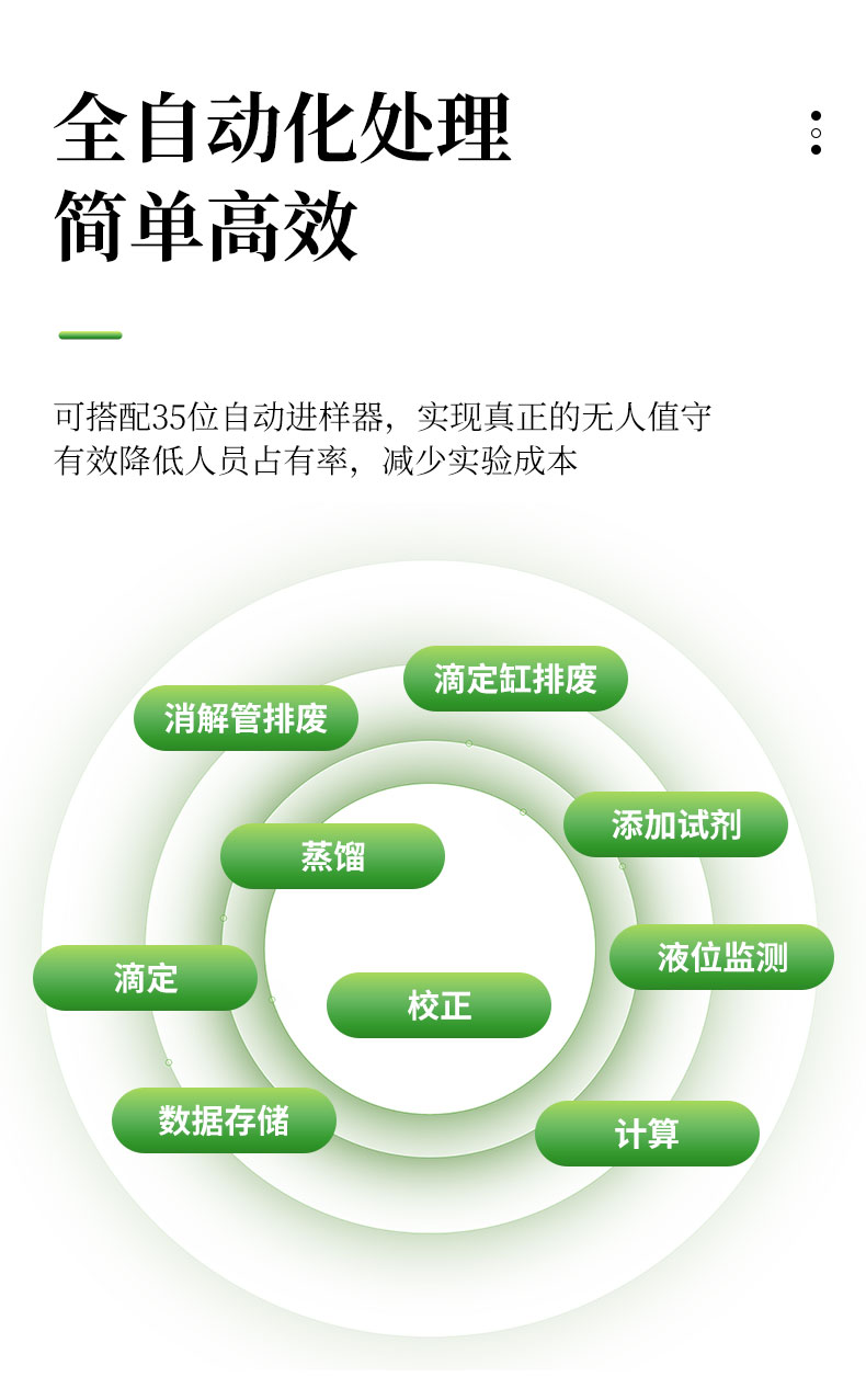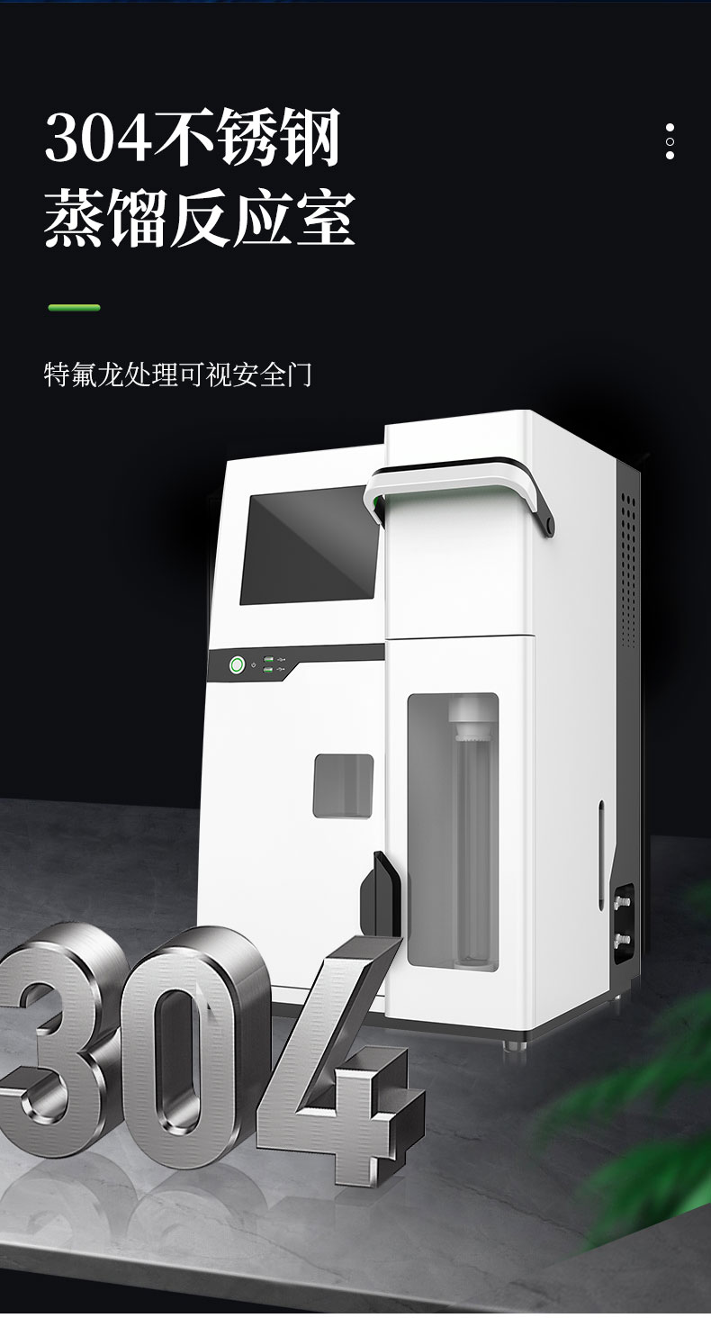 | 1.采用國家標準的凱氏定氮方法:濃硫酸環(huán)境消解樣品、堿性環(huán)境蒸汽蒸餾、硼酸吸收、指示劑滴定終點顏色判斷法。參與國家標準GB/T22923-2008、官方JJF109-2012《定氮儀校準規(guī)范》的起草; | 2.☆全自動添加試劑、蒸餾、滴定、消解管排廢、滴定缸排廢、校正、液位監(jiān)測、計算、數(shù)據(jù)存儲、生成測試報告并上傳,整個實驗過程全自動化處理簡單**; | 3.全自動安全監(jiān)測:安全門、消化管到位監(jiān)測;蒸餾發(fā)生器具有壓力傳感器、蒸汽過壓保護、溫度傳感器、溫度保護開關、水位浮球與電位雙重檢測等多重保護;蒸餾餾出液溫度和體積監(jiān)測,避免溫度過高或蒸餾體積波動影響測試結(jié)果;冷卻水流量實時監(jiān)測,低水壓報警,停水自動終止運行;冷凝流出液溫度監(jiān)測,保障樣品完全冷凝,確保實驗結(jié)果準確可靠; | 4.☆可搭配35位自動進樣器,實現(xiàn)真正的無人值守,有效降低人員占有率,減少實驗成本; | 5.全新的多核ARM操作系統(tǒng),中英文操作界面可選,10英寸LED高清彩色液晶觸摸屏實時監(jiān)測和顯示實驗過程; | 6.☆四級權限分級功能,從程序管理員-主管理員-輔助管理員-操作員使用不同權限,內(nèi)置時間鎖數(shù)據(jù)鎖符合“GLP和GMP”規(guī)定; | 7.☆上位機采用windows操作軟件,具有測試數(shù)據(jù)、回收率計算及統(tǒng)計、測試報告自動生成等功能,可方便用戶通過PC機對數(shù)據(jù)進行分析、處理;數(shù)據(jù)處理軟件包具有數(shù)據(jù)跟蹤、審核、輸出功能,具有操作、審核、批準、管理、維護五級管理功能,測試信息可靠、可溯源; | 8.☆可通過USB2.0接口使用U盤輸出數(shù)據(jù);儀器內(nèi)置WIFI模塊,網(wǎng)絡自動識別,可通過無線通訊,將詳細的測試信息同步上傳至PC端處理; | 9.雙蒸餾模式,蒸汽流量0~100%任意可調(diào); | 10.外置滴定杯,實驗過程實時可見,滴定系統(tǒng)照明配置與成熟的顏色終點判定軟件配合,使外界光源的影響降至**; | 11.高精度滴定系統(tǒng),專業(yè)一體式精工柱塞,確保測試精度和使用的可靠性; | 12.☆滴定系統(tǒng)采用動態(tài)滴定技術,可實現(xiàn)邊蒸餾邊滴定和滴定系統(tǒng)自動判斷和切換滴定速度,真正達到蒸餾、滴定、計算過程同步完成,減少實驗時間40%; | 13.滴定顏色可自動與手動校準。滴定終點判定采用高精度的十六位三基色數(shù)字信號顏色傳感器采集顏色信號; | 14.☆儀器內(nèi)部可儲存100萬組數(shù)據(jù),云端可無限量儲存數(shù)據(jù)。測試結(jié)果可選擇包含Word、Excel等12種表示方式; | 15.耐強酸耐強堿液腐蝕隔膜試劑泵,超強的耐顆粒堵塞結(jié)構(gòu),加液穩(wěn)定,負壓抽吸無危險; | 16.☆防濺瓶采用高分子材質(zhì),耐高溫、強堿,同時保證氨氣不泄露,回收率不偏低; | 17.試劑桶液位監(jiān)測,保證實驗過程不出現(xiàn)缺液問題。 | 18.儀器具備自檢功能、具備一鍵重置。 | 19.標配2種工作模式根據(jù)需求可增配硝態(tài)氮、高氮自動測試模塊。 | 20.☆304不銹鋼蒸餾反應室,特氟龍?zhí)幚砜梢暟踩T。 | 21.貼合氨逸出規(guī)律特殊設計的蒸餾系統(tǒng),確保高可靠的測試回收率 | 22.儀器內(nèi)置操作助手儀器更智能化。 |