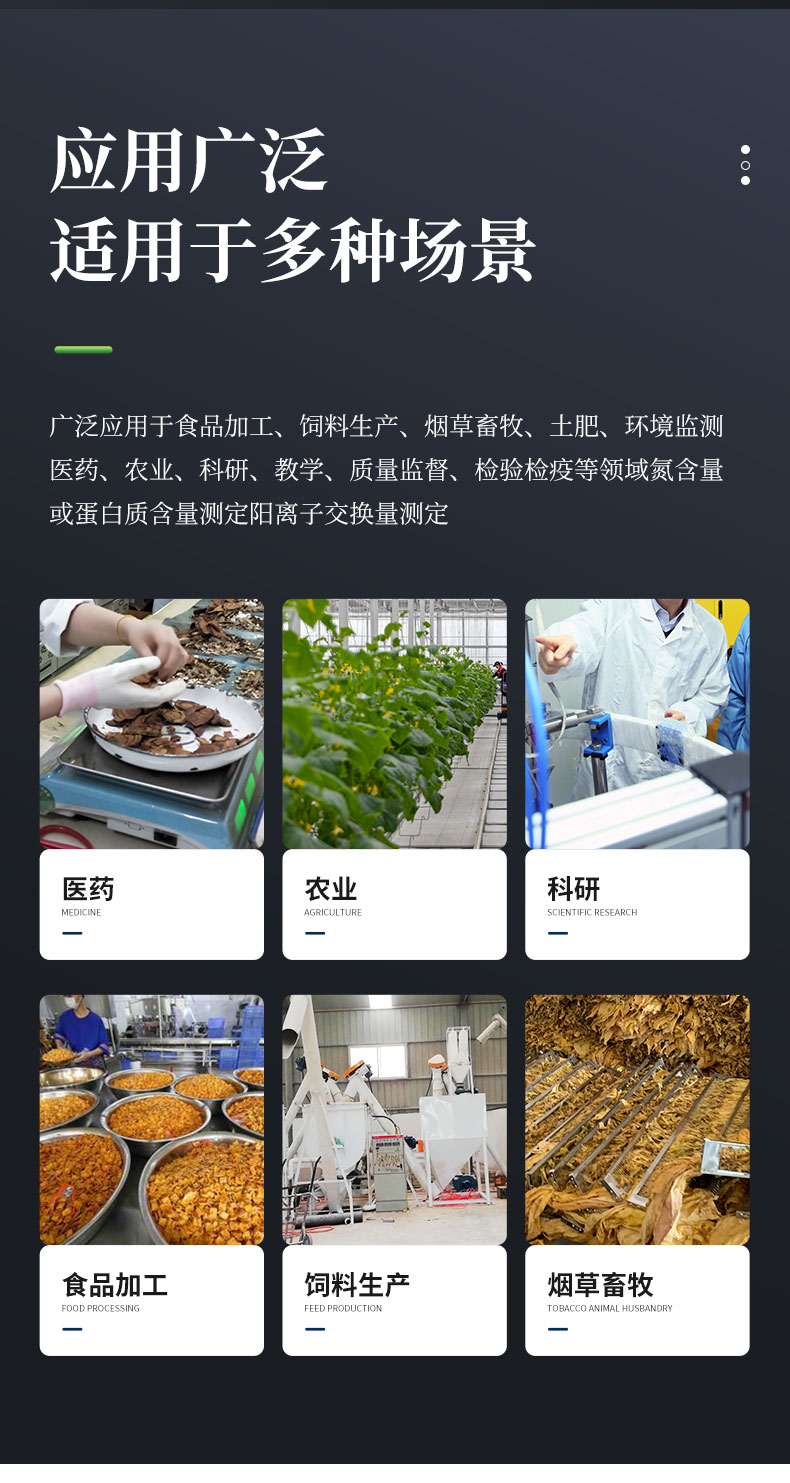1.廣泛應用于食品加工、飼料生產(chǎn)、煙草畜牧、土肥、環(huán)境監(jiān)測、醫(yī)藥、農(nóng)業(yè)、科研、教學、質(zhì)量監(jiān)督、檢驗檢疫等領域氮含量或蛋白質(zhì)含量測定陽離子交換量測定。