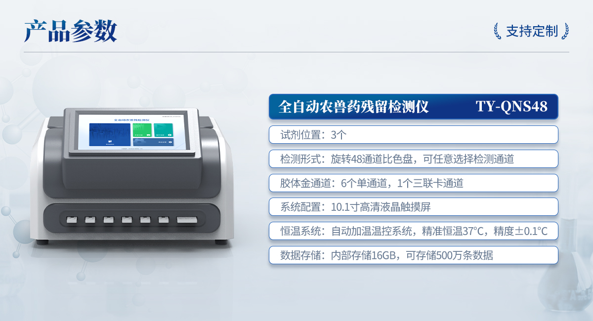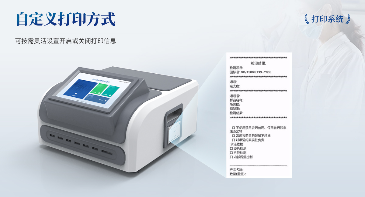| 1. 試劑位置:3個(gè) | 2. 農(nóng)殘檢測盤:旋轉(zhuǎn)48通道比色盤,可任意選擇檢測通道,自動(dòng)對應(yīng)選擇通道。 | 3. 膠體金通道:6個(gè)單通道,1個(gè)三聯(lián)卡通道,可讀取檢測卡結(jié)果,自動(dòng)采集、處理分析,自動(dòng)判斷檢測結(jié)果,并具備自動(dòng)判空功能。 | 4.系統(tǒng)配置:10.1寸高清液晶觸摸屏,采用ARM Cortex-A7,RK3288/4核處理器,運(yùn)行內(nèi)存1GB。Android7.1.1 系統(tǒng)分辨率1280×800。 | 5.恒溫系統(tǒng):具有自動(dòng)加溫溫控系統(tǒng),精準(zhǔn)恒溫37℃,精度±0.1℃。 | 6.添加系統(tǒng):儀器按照試劑要求自動(dòng)、按時(shí)、按量加入試劑,并且自動(dòng)對未正常放置的樣本或異常的樣本進(jìn)行檢查并提示。 | 7.清洗功能:儀器具備回流及自動(dòng)清洗管路功能,避免試劑污染。 | 8.混勻功能:設(shè)備具備自動(dòng)混勻功能。 | 9.光源校準(zhǔn):設(shè)備可自動(dòng)校準(zhǔn),確保檢測準(zhǔn)確度。 | 10.實(shí)時(shí)監(jiān)控:儀器測試過程中屏幕顯示運(yùn)行狀態(tài),可實(shí)時(shí)查看。 | 11.數(shù)據(jù)存儲(chǔ):內(nèi)部存儲(chǔ)16GB,可存儲(chǔ)500萬條數(shù)據(jù)。 | 12.樣品多選功能:設(shè)備具備樣品一鍵多選功能,選擇樣品自動(dòng)匹配檢測通道。 | 13.項(xiàng)目預(yù)設(shè):可提前設(shè)置單個(gè)及多個(gè)相同或不相同的檢測任務(wù),可單次或者多次調(diào)取,減少檢測時(shí)間。 | 14.自定義打印系統(tǒng):內(nèi)置自定義打印系統(tǒng),可按需靈活設(shè)置開啟或關(guān)閉:產(chǎn)品合格證(國家農(nóng)業(yè)部標(biāo)準(zhǔn)),二維碼,抽樣信息、檢測信息,受檢信息等信息的打印。 | 15.A4版本報(bào)告打印功能:設(shè)備可自動(dòng)生成A4版報(bào)告,A4報(bào)告帶二維碼,可掃描二維碼生成電子版,并可識(shí)別真?zhèn)巍?/td> | 16.傳輸方式:儀器配備無線通信模塊: 4G(APN)通訊模塊、Wifi模塊,藍(lán)牙傳輸模塊,同時(shí)具有USB接口以及RJ45接口能以多種方式實(shí)現(xiàn)數(shù)據(jù)保存和數(shù)據(jù)傳輸功能,設(shè)備數(shù)據(jù)可以同步上傳至平臺(tái)。 | 17.數(shù)據(jù)監(jiān)管系統(tǒng):設(shè)備自帶監(jiān)管平臺(tái),并可同步對接監(jiān)管平臺(tái),數(shù)據(jù)可局域網(wǎng)和互聯(lián)網(wǎng)數(shù)據(jù)上傳,檢測結(jié)果可直接傳至食品安全監(jiān)管平臺(tái)。達(dá)到食品安全問題預(yù)估、預(yù)警。 | 18.系統(tǒng)遠(yuǎn)程更新功能:無需設(shè)備返廠,即可遠(yuǎn)程實(shí)時(shí)升級(jí)全新系統(tǒng),節(jié)省時(shí)間成本及避免運(yùn)輸造成設(shè)備損。 |