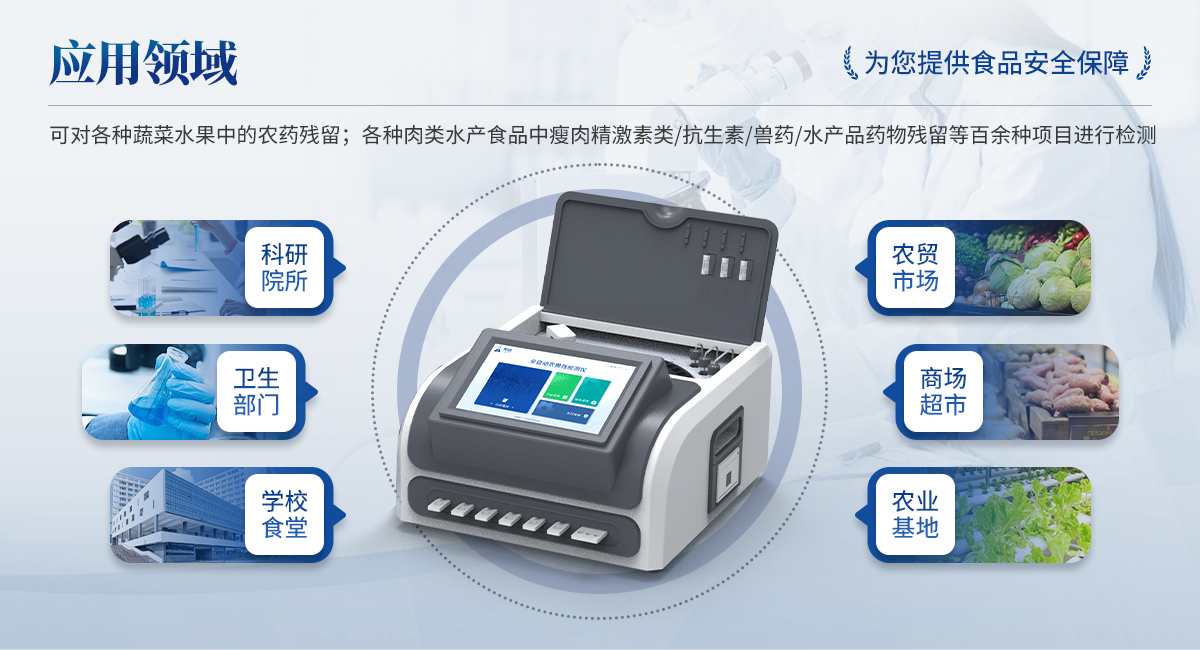 全自動(dòng)農(nóng)獸藥殘留檢測儀可對各種蔬菜水果中有機(jī)磷和氨基甲酸酯類農(nóng)藥殘留;各種肉類水產(chǎn)食品中瘦肉精激素類殘留,抗生素殘留,獸藥殘留,水產(chǎn)品藥物殘留等百余種項(xiàng)目進(jìn)行快速檢測。該設(shè)備廣泛應(yīng)用于蔬菜批發(fā)市場、超市、商場、食藥監(jiān)等部門的蔬菜和水果中的農(nóng)藥殘留檢測。