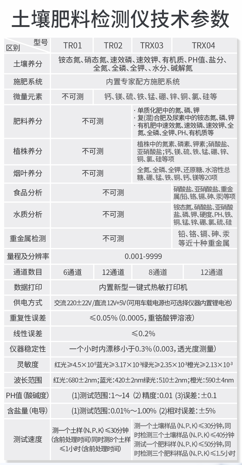 | 土壤中速效N、P、K等多種養(yǎng)分一次性同時(shí)浸提測(cè)定(農(nóng)業(yè)部速測(cè)行業(yè)標(biāo)準(zhǔn)起草者)。 | 肥料中氮(N)、磷(P)、鉀(K)等養(yǎng)分同時(shí)、快速、準(zhǔn)確檢測(cè)。 | 測(cè)試速度:正常熟練程度下: | 測(cè)一個(gè)土壤樣品(N、P、K)三項(xiàng)需要20分鐘(含藥劑準(zhǔn)備及土樣前處理時(shí)間),同時(shí)檢測(cè)三個(gè)土壤樣品(N、P、K)≤40分鐘,同時(shí)測(cè)8個(gè)土樣≤1小時(shí)。 | 測(cè)試一個(gè)肥料樣(N、P、K)≤50分鐘,同時(shí)檢測(cè)三個(gè)肥料樣品(N、P、K)≤1.5小時(shí)。 |