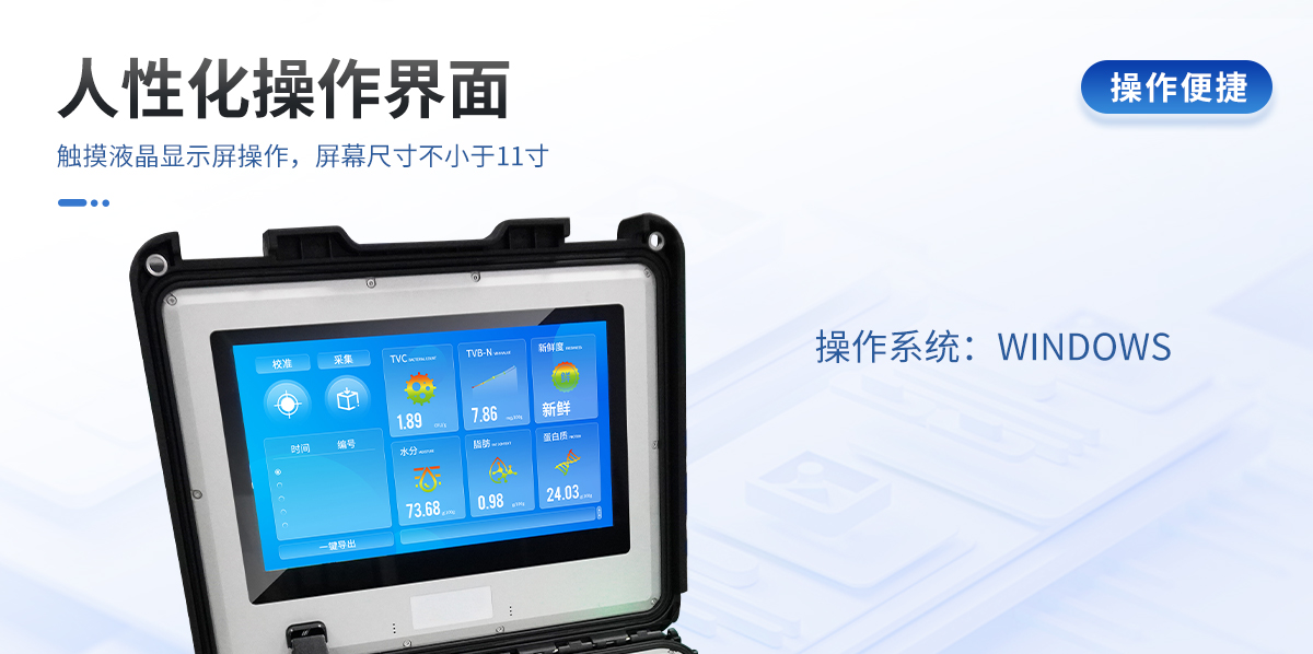 可用于檢測生鮮肉的蛋白質(zhì)、脂肪、水分、pH、TVC、TVB-N、新鮮度、L*、A*、B*等品質(zhì)參數(shù)。配備手提箱式防水減震外殼、大尺寸觸控屏幕并內(nèi)置大容量電池,可一鍵自動校準(zhǔn),是一款適合移動作業(yè)場景的高精度生鮮肉品質(zhì)檢測儀,其可用于生鮮肉及肉品生產(chǎn)、加工、儲運企業(yè)、肉品品質(zhì)監(jiān)管部門等。
