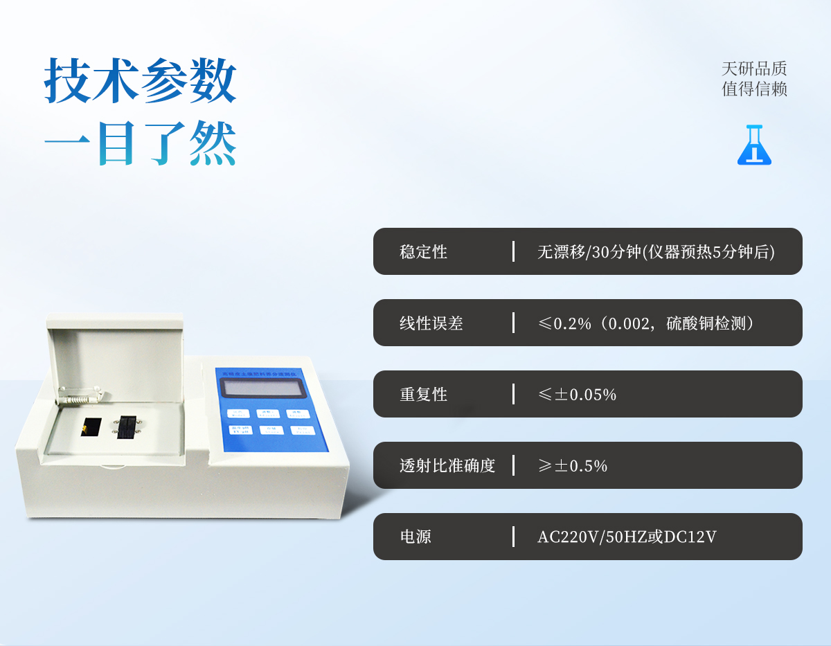 | 儀器透射比準(zhǔn)確度 ≥±0.5% | 儀器重復(fù)性 ≤±0.05% | 儀器穩(wěn)定性 無(wú)漂移/30分鐘(儀器預(yù)熱5分鐘后) | 線性誤差 ≤0.2%(0.002,硫酸銅檢測(cè)) | 儀器功耗 ≤5W | 電源 AC220V/50Hz或DC12V | 結(jié)果輸出 內(nèi)置**熱敏打印機(jī)可自動(dòng)打印出檢測(cè)結(jié)果,方便直觀。 |