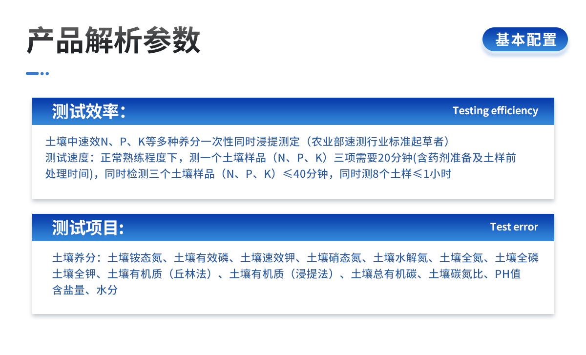 | 1、土壤養(yǎng)分:土壤銨態(tài)氮、土壤有效磷、土壤速效鉀、土壤硝態(tài)氮、土壤水解氮、土壤全氮、土壤全磷、土壤全鉀、土壤有機(jī)質(zhì)(丘林法)、土壤有機(jī)質(zhì)(浸提法)、土壤總有機(jī)碳、土壤碳氮比、PH值、含鹽量、水分。 | 2、土壤中微量元素:土壤鈣、土壤鎂、土壤硫、土壤硅、土壤硼、土壤鐵、土壤銅、土壤錳、土壤鋅、土壤氯、土壤鉬 |