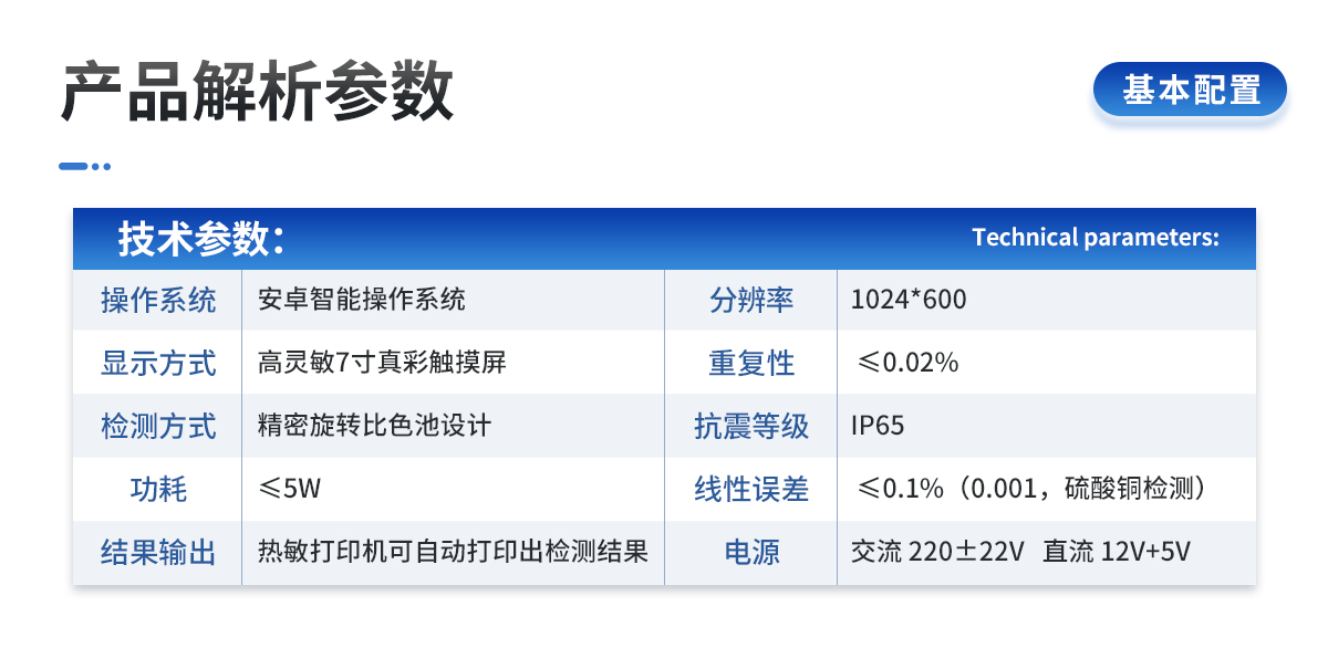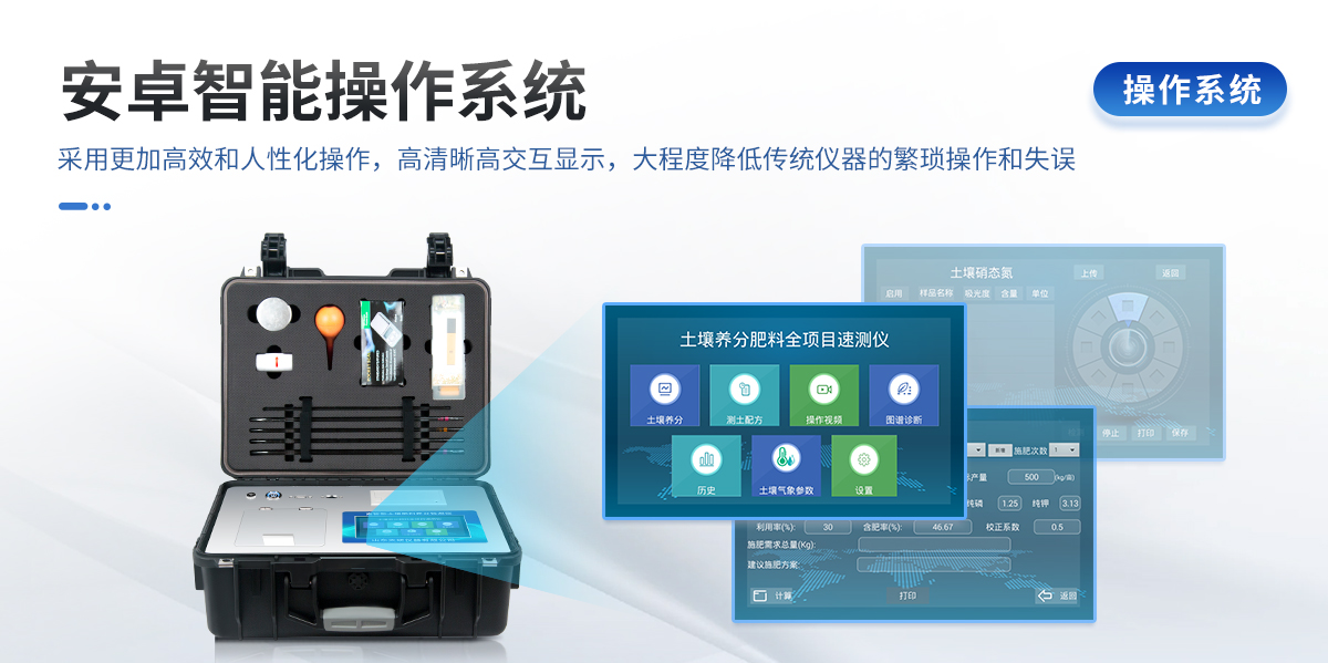 | 安卓智能操作系統(tǒng)Android 7.1版本,主控芯片采用ARM Cortex-A7,RK3288/4核處理器,主頻1.88Ghz,運(yùn)轉(zhuǎn)速度更快速,穩(wěn)定性更強(qiáng)。 | 可檢測各種土壤、肥料、作物、食品、水質(zhì)、環(huán)境等共200多個(gè)測試項(xiàng)目,一機(jī)多用,功能齊全。 | 測試速度更快!無需空白對(duì)照和標(biāo)準(zhǔn)校準(zhǔn),省卻以往繁瑣的操作步驟,一鍵式操作,直接讀取數(shù)據(jù),**率,低消耗。 | 12個(gè)旋轉(zhuǎn)檢測通道,一次性可快速檢測12個(gè)樣品,極大提升檢測效率,降低檢測成本。 | 采用高精度濾光片技術(shù)自主專利分析方法(專利號(hào):ZL 2020 2 1763837.9),**認(rèn)證。 | 具有自身保護(hù)功能,內(nèi)置人臉識(shí)別攝像頭可掃臉登錄,也可設(shè)置用戶名和密碼,防止非工作人員操作查看實(shí)驗(yàn)數(shù)據(jù)。 | 檢測過程中內(nèi)置校準(zhǔn)功能,智能恒流穩(wěn)壓,光強(qiáng)自動(dòng)校準(zhǔn),確保檢測準(zhǔn)確度,取得中國計(jì)量科學(xué)研究院的《校準(zhǔn)證書》 | 內(nèi)置傳感器航空接口,插拔方便,配備FDR傳感器、環(huán)境多要素傳感器。 | FDR傳感器為土壤三參數(shù)一體式,可同時(shí)測量土壤水分含量、土壤環(huán)境溫度、土壤電導(dǎo)率(鹽分)方便快捷。 | 環(huán)境多要素傳感器為6要素一體式,可同時(shí)測量空氣溫度、空氣濕度、露點(diǎn)、大氣壓力、光照度、二氧化碳。 | 儀器標(biāo)配wifi無線上傳、4G聯(lián)網(wǎng)傳輸、GPRS無線遠(yuǎn)傳,快速上傳數(shù)據(jù)。 | 配有智慧云農(nóng)業(yè)平臺(tái),儀器連入無線網(wǎng)絡(luò)后,可將檢測數(shù)據(jù)可選擇性或批量無線上傳,方便用戶進(jìn)行數(shù)據(jù)管理和長期分析。 | 儀器配同時(shí)具有USB接口、以太網(wǎng)接口,內(nèi)置大容量內(nèi)存,并可隨時(shí)用U盤拷貝數(shù)據(jù)。 | 可用手機(jī)隨時(shí)登錄云平臺(tái)在線移動(dòng)查看歷史數(shù)據(jù) | 內(nèi)置作物專家施肥系統(tǒng),可對(duì)百余種全國農(nóng)業(yè)經(jīng)濟(jì)作物、果樹等的目標(biāo)產(chǎn)量計(jì)算推薦施肥量,依據(jù)施肥配方科學(xué)指導(dǎo)農(nóng)業(yè)生產(chǎn)。測土配方施肥結(jié)果可打印,打印內(nèi)容包含:作物種類、肥料種類、目標(biāo)產(chǎn)量、需求總量、建議施肥方案。 | 內(nèi)置植物營養(yǎng)診斷標(biāo)準(zhǔn)圖譜,根據(jù)各農(nóng)作物營養(yǎng)缺失的圖片,進(jìn)行葉面對(duì)比,診斷豐缺。 | 4波長專業(yè)測試?yán)涔庠矗t、藍(lán)、綠、橙),光源波長穩(wěn)定,長時(shí)間連續(xù)工作光源無溫漂現(xiàn)象,壽命長達(dá)10萬小時(shí)級(jí)別,重現(xiàn)性好,準(zhǔn)確度高。 | 比色池部分采用標(biāo)準(zhǔn)1cm比色皿,無機(jī)械位移及磨損,光路測試定位**,有效屏蔽外光干擾,保證檢測結(jié)果優(yōu)于國標(biāo)要求。 | 儀器系統(tǒng)內(nèi)帶有樣品前處理操作視頻,各種樣品檢測方法點(diǎn)擊視頻模塊即可觀看,檢測人員無需自學(xué)說明書,指導(dǎo)教學(xué)方便快速,方便新手快速操作。 | 內(nèi)置新一代高速熱敏打印機(jī)(無需色帶),打印內(nèi)容包含:檢測單位、檢測人員、檢測項(xiàng)目、通道號(hào)、吸光度、養(yǎng)分含量(mg/kg)、檢測時(shí)間、以及二維碼等信息 | 高靈敏7寸真彩觸摸屏,采用更加**和人性化操作,高清晰高交互顯示,大程度降低傳統(tǒng)儀器的繁瑣操作和失誤,并取得多項(xiàng)《軟件著作權(quán)》。 | 內(nèi)置時(shí)鐘功能,方便操作時(shí)間記錄,長期歷史追溯。 | 可設(shè)置多賬戶賬號(hào)密碼登錄,**UI交互界面,不同的用戶可自由添加編輯檢測信息,保存后可長期使用。 | GPS功能:可在野外作業(yè)時(shí)記錄經(jīng)緯度地點(diǎn),滿足特殊用戶需求。 | 內(nèi)置低電壓提示功能,可在檢測時(shí)明確電量,避免測試數(shù)據(jù)偏移,同時(shí)具有斷電保護(hù)功能,斷電自動(dòng)保存數(shù)據(jù),防止數(shù)據(jù)丟失。 | 交直流兩用供電方式,內(nèi)置大容量充電鋰電池,滿電狀態(tài)下可連續(xù)工作10余小時(shí),同時(shí)可外接車載電源蓄電 | 儀器具有中英文切換功能,可滿足出口要求。 | 高強(qiáng)度PVC工程塑料手提箱設(shè)計(jì),堅(jiān)固耐用,便于攜帶。 |