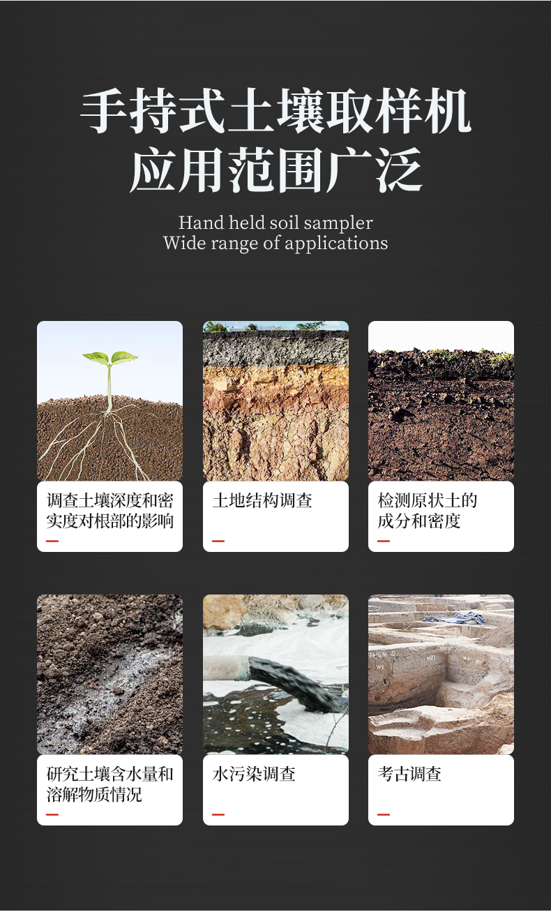 | 旋轉(zhuǎn)式,上下沒有擾動,不會破壞土壤剖面結(jié)構(gòu) | 采樣量大,插銷連接,易于拆卸。 | 鉆頭帶有鋸齒,通過沖擊錘鉆入土壤,入土容易。 | 筒型鉆頭獨特可拆卸裁口設(shè)計,取樣容易。 | 樣品處于比較寬松的柱狀圓筒中,取出十分容易 | 狀土壤很難被壓縮(保持原狀) | 采集一個樣本就可以研究整個土壤剖面情況 | 比開挖一個采樣坑要節(jié)約時間和減少樣本破壞 | 可有效地用于所有類型的土壤 |