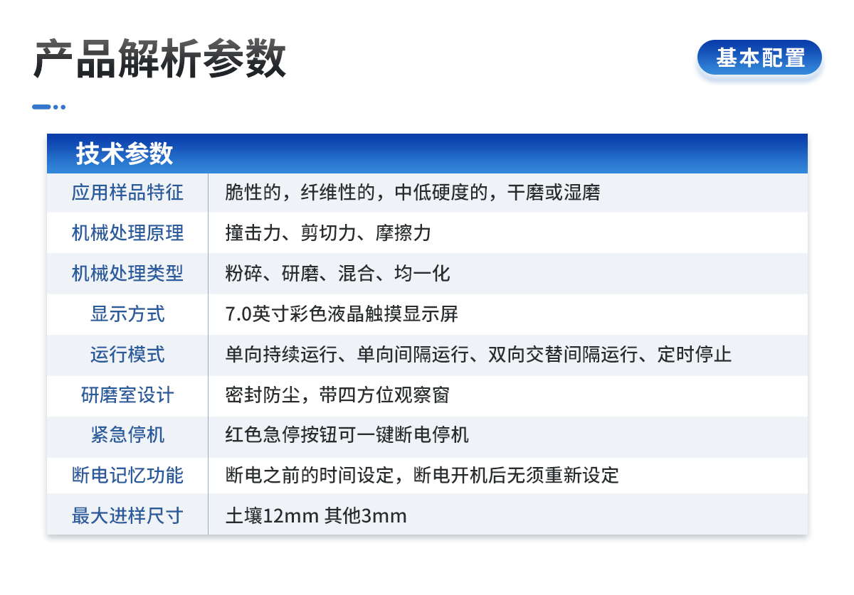 | 應(yīng)用領(lǐng)域:土壤、地質(zhì)、環(huán)保、第三方檢測、農(nóng)牧業(yè)、農(nóng)產(chǎn)品質(zhì)量、資源與環(huán)境等,土壤制樣、重金屬分析 | 應(yīng)用樣品特征:脆性的,纖維性的,中低硬度的,干磨或濕磨 | 儀器機械處理原理:撞擊力、剪切力、摩擦力 | 儀器機械處理類型:粉碎、研磨、混合、均一化 | 控制系統(tǒng):觸摸屏、無線遙控 | 遠(yuǎn)程遙控:標(biāo)配無線遙控器,可遠(yuǎn)距離控制研磨機的啟動、停止、加速、減速以及可切換三種運行模式(單向持續(xù)運行,單向間隔運行,雙向交替間隔運行) | 顯示方式:7.0寸彩色液晶顯示屏,可顯示、觸控操作運行模式、運行時間、轉(zhuǎn)速、交替運行間隔 | 運行模式:單向持續(xù)運行、單向間隔運行、雙向交替間隔運行、定時停止 | 連續(xù)運行時間設(shè)定:0.1~9999.9分鐘 | 交替、單向間隔暫停時間設(shè)定:0.1~9999.9分鐘 | 主盤轉(zhuǎn)速:50-450min | 研磨罐轉(zhuǎn)速:100-900min | 傳動比(行星盤、研磨罐):1:2 | 可連續(xù)工作(滿負(fù)荷):90h | 緊急停機:紅色急停按鈕可一鍵斷電停機 | 斷電記憶功能:斷電之前的時間設(shè)定,斷電開機后無須重新設(shè)定 | 過載保護(hù)功能:有 | 研磨室設(shè)計:密封防塵,帶四方位觀察窗 | 同時處理樣品種數(shù):4種 | 適用研磨罐:本機是新款通用型,100ml、250ml、500ml三種規(guī)格研磨罐均可使用,可根據(jù)客戶需求同時放不同規(guī)格的罐;對角對稱即可(4個研磨罐為一套)。 | 最大進(jìn)樣尺寸:土壤12mm 其他3mm | 研磨罐配球量:罐子容積的三分之一 | 最大裝樣量:研磨罐容積的三分之二 | 出樣粒度:最小可達(dá)0.1um(即1.0×10mm-4) | 研磨罐材質(zhì):瑪瑙、陶瓷、聚四氟乙烯、氧化鋯、聚氨酯、不銹鋼、尼龍、碳化鎢、硬質(zhì)合金等可選(常用瑪瑙、氧化鋯研磨罐) | 研磨球材質(zhì):瑪瑙、氧化鋯、不銹鋼、陶瓷、硬質(zhì)合金、碳化硅等 | 研磨球直徑:3、5、10、15、20mm(根據(jù)實際需求配置) | 電源端口:國標(biāo)、歐標(biāo)、美標(biāo)、英標(biāo)等 | 電機轉(zhuǎn)速、功率、電壓:1400rpm、0.75kw、220V±10%單相,50/60Hz | 凈重:80kg | 尺寸(長寬高):756*484*488mm | 噪聲描述:60dB | 防護(hù)等級:IP60 | 標(biāo)準(zhǔn)配置:研磨儀主機:1臺; | 研磨罐鎖緊裝置:1套4個; | 250ml研磨機研磨罐保護(hù)裝置:1套4個; | 100ml研磨機研磨罐保護(hù)裝置:1套4個; | 電源線:1根; | 說明書:1本; | 保修卡:1張; | 合格證:1張 |