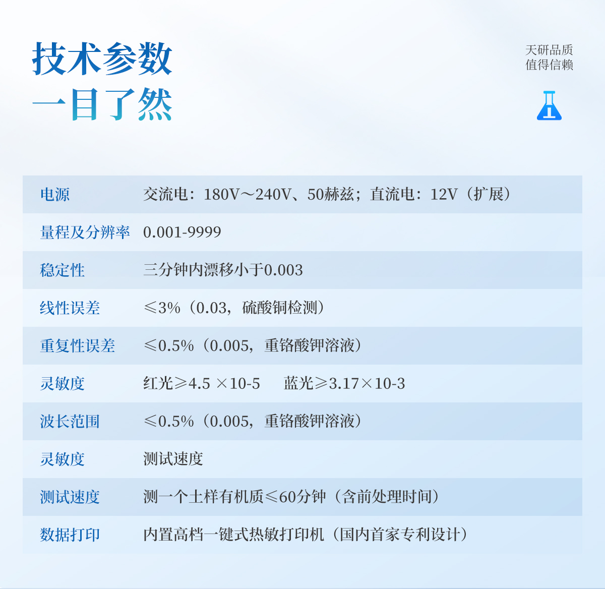 | 電源:交流電:180V~240V、50赫茲;直流電:12V(擴(kuò)展) | 量程及分辨率:0.001-9999 | 穩(wěn)定性:三分鐘內(nèi)漂移小于0.003 | 線性誤差:≤3%(0.03,硫酸銅檢測(cè)) | 重復(fù)性誤差:≤0.5%(0.005,重鉻酸鉀溶液) | 靈敏度:紅光≥4.5 ×10-5 藍(lán)光≥3.17×10-3 | 波長(zhǎng)范圍:紅光620±8nm 藍(lán)光440±8nm | 測(cè)試速度:測(cè)一個(gè)土樣有機(jī)質(zhì)≤60分鐘(含前處理時(shí)間) | 可同時(shí)檢測(cè)8個(gè)土樣≤個(gè)小時(shí)(含前處理時(shí)間) | 數(shù)據(jù)打印:內(nèi)置高檔一鍵式熱敏打印機(jī)(國(guó)內(nèi)首家專利設(shè)計(jì)) |