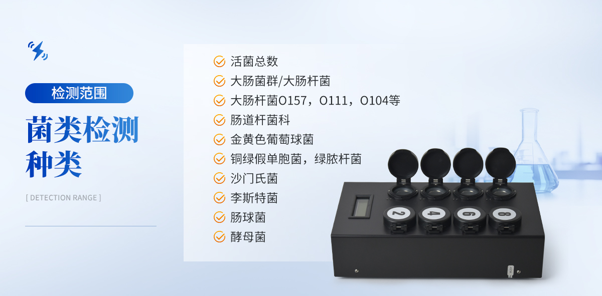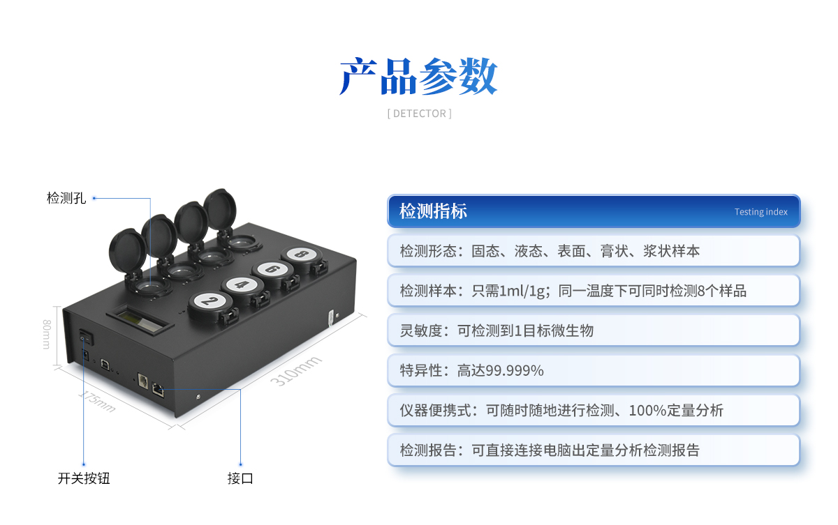 | 1) 可檢測固態(tài)、液態(tài)、表面、膏狀、漿狀樣本 | 2) 樣本在檢測時無需任何的前處理過程,直接丟入檢測瓶即可 | 3) 可自動控制孵育溫度和孵育時間 | 4) 檢測樣本只需1ml/1g;同一溫度下可同時檢測8個樣品 | 5) 靈敏度高達可檢測到1目標微生物;特異性高達99.999% | 6) 獨立、持續(xù)的檢測并記錄瓶中的微生物數(shù)量(CFU) | 7) 簡單三個操作步驟,傻瓜型,無需專業(yè)操作人員 | 8) 儀器便攜式,可隨時隨地進行檢測、100%定量分析,并可直接連接電腦出定量分析檢測報告 |