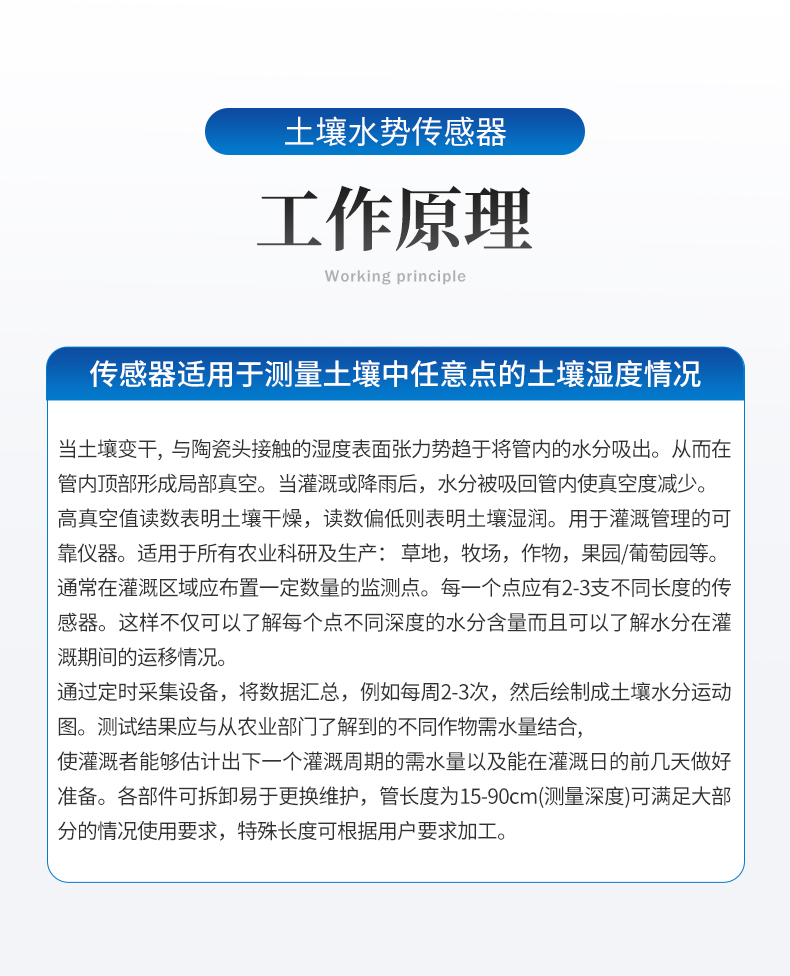 ?傳感器適用于測(cè)量土壤中任意點(diǎn)的土壤濕度情況。當(dāng)土壤變干, 與陶瓷頭接觸的濕度表面張力勢(shì)趨于將管內(nèi)的水分吸出。從而在管內(nèi)頂部形成局部真空。當(dāng)灌溉或降雨后,水分被吸回管內(nèi)使真空度減少。
