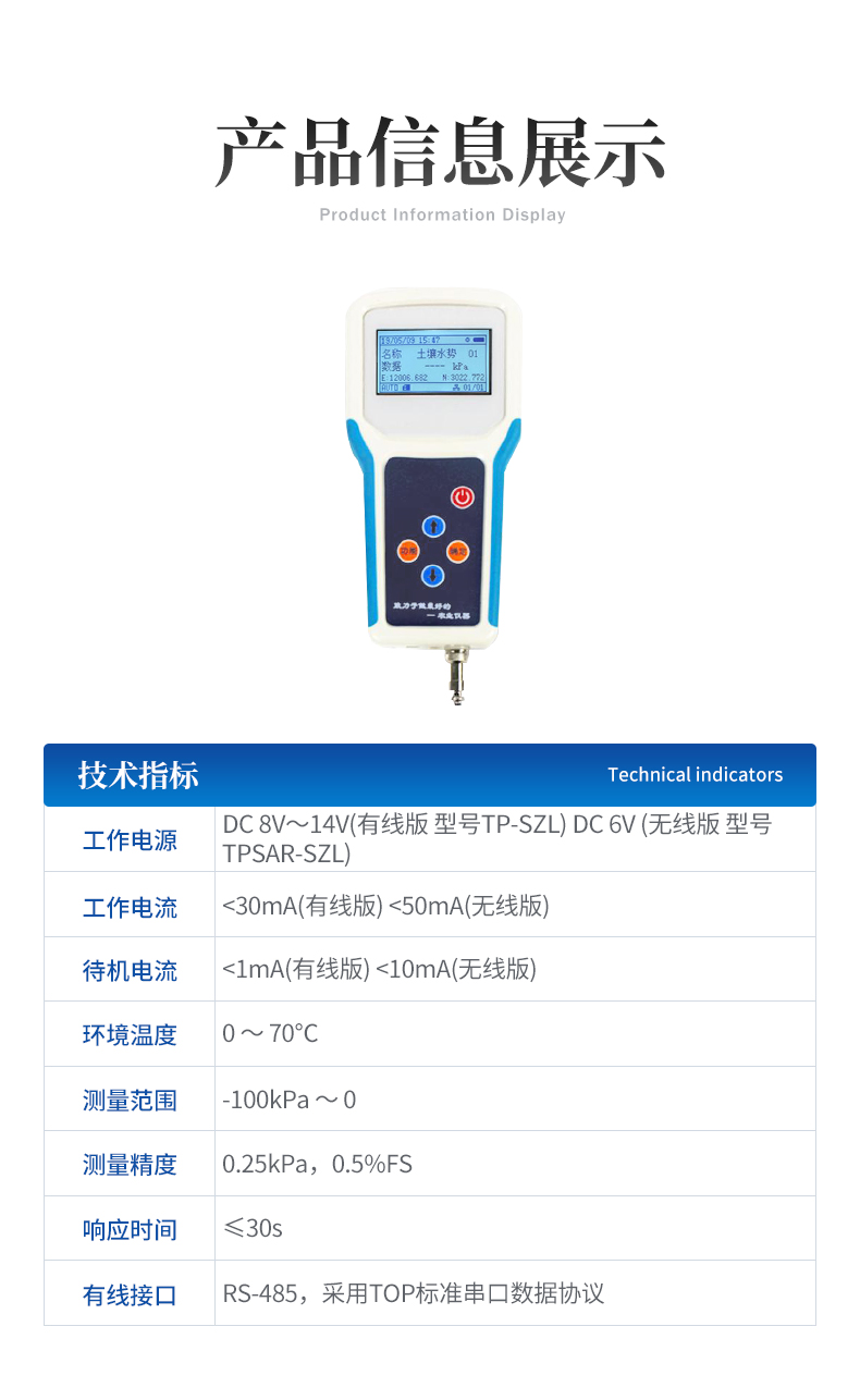 詳細(xì)產(chǎn)品介紹及技術(shù)參數(shù)技術(shù)參數(shù):工作電源 DC 8V~14V(有線版 型號(hào)TP-SZL) DC 6V (無(wú)線版 型號(hào)TPSAR-SZL)工作電流<30ma(有線版)>待機(jī)電流<1ma(有線版)>環(huán)境溫度 0 ~ 70℃測(cè)量范圍 -100kPa ~ 0測(cè)量精度 0.25kPa,0.5%FS響應(yīng)時(shí)間 ≤30s有線接口 RS-485,采用TOP標(biāo)準(zhǔn)串口數(shù)據(jù)協(xié)議工作原理:?傳感器適用于測(cè)量土