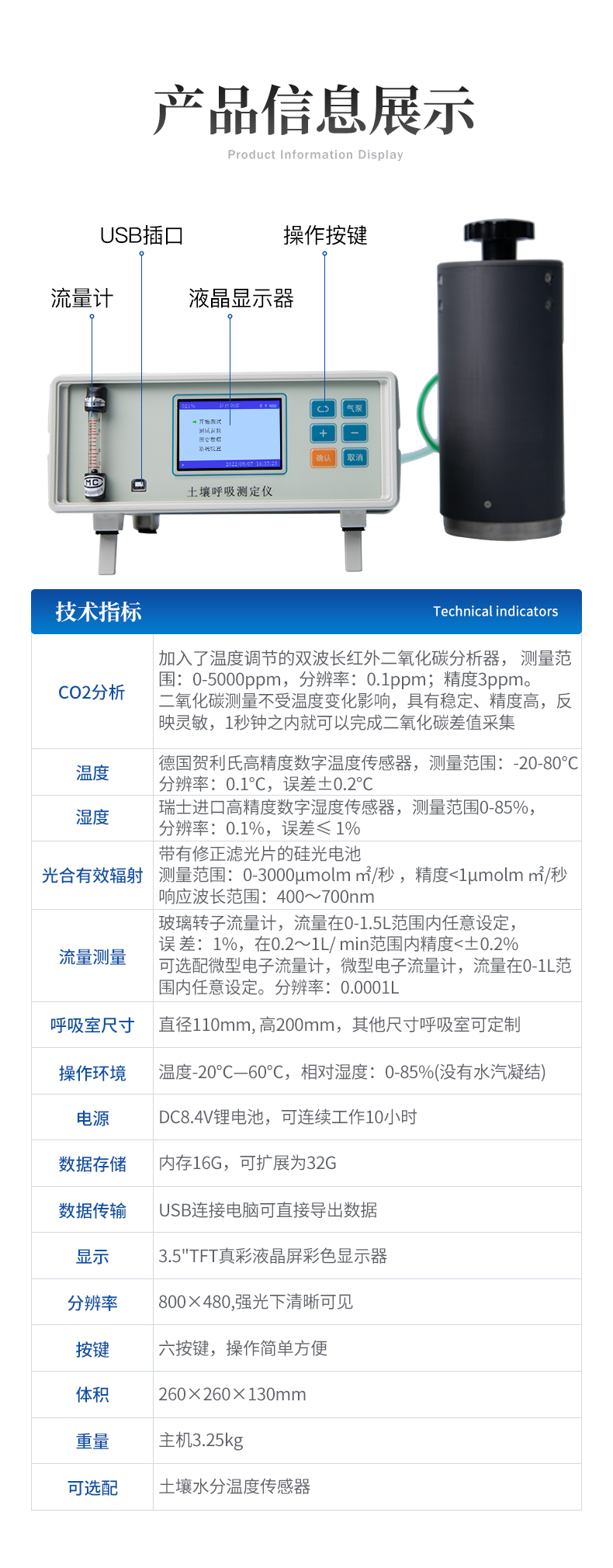| 1、 CO2分析:加入了溫度調(diào)節(jié)的雙波長紅外二氧化碳分析器, 測量范圍:0-5000ppm,分辨率:0.1ppm; 精度3ppm。二氧化碳測量不受溫度變化影響,具有穩(wěn)定、精度高,反映靈敏,1秒鐘之內(nèi)就可以完成二氧化碳差值采集。 | 2、溫度:德國賀利氏高精度數(shù)字溫度傳感器,測量范圍:-20-80℃,分辨率:0.1℃,誤差±0.2℃ | 3、 濕度: 瑞士進(jìn)口高精度數(shù)字濕度傳感器,測量范圍0-85%,分辨率:0.1%,誤差≤ 1% | 4、光合有效輻射:帶有修正濾光片的硅光電池,測量范圍:0-3000μmolm ㎡/秒 ,精度<1μmolm> | 5、流量測量:玻璃轉(zhuǎn)子流量計(jì),流量在0-1.5L范圍內(nèi)任意設(shè)定, 誤 差:1%,在0.2~1L/ min范圍內(nèi)精度<±0.2%。可選配微型電子流量計(jì),微型電子流量計(jì),流量在0-1l范圍內(nèi)任意設(shè)定。分辨率:0.0001l<> | 6、 呼吸室尺寸:直徑110mm, 高200mm,其他尺寸呼吸室可定制。 | 7、操作環(huán)境:溫度-20℃—60℃,相對濕度:0-85%(沒有水汽凝結(jié)) | 8、 電源:DC8.4V鋰電池,可連續(xù)工作10小時(shí) | 9、數(shù)據(jù)存儲(chǔ):內(nèi)存16G,可擴(kuò)展為32G。 | 10、 數(shù)據(jù)傳輸:USB連接電腦可直接導(dǎo)出數(shù)據(jù)。 | 11、顯 示:3.5"TFT真彩液晶屏彩色顯示器 | 12、 分辨率 800×480,強(qiáng)光下清晰可見 。 | 13、按 鍵:六按鍵,操作簡單方便 | 14、 體積:260×260×130mm | 13、 重量:主機(jī)3.25kg | 14、 可選配:土壤水分溫度傳感器 |