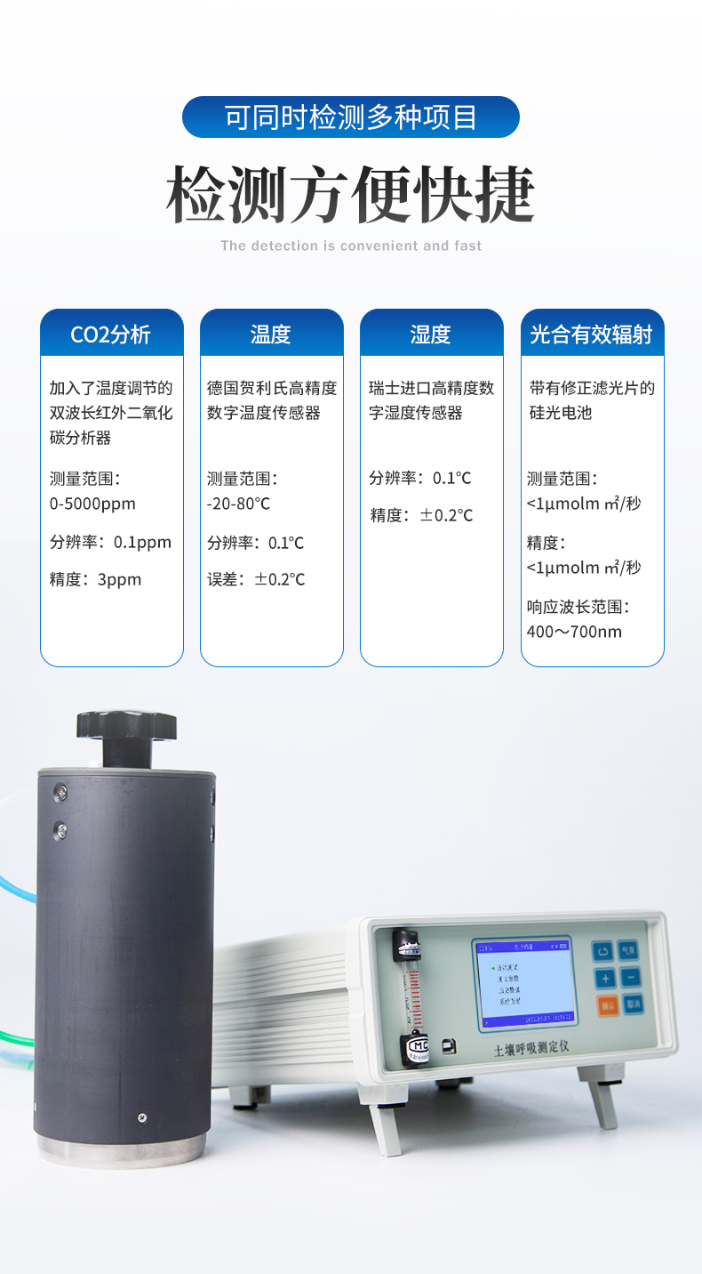 土壤呼吸是土壤生態(tài)系統(tǒng)碳素循環(huán)的一個(gè)重要過程,是土壤碳素同化異化平衡作用的結(jié)果,也是碳素由陸地生態(tài)系統(tǒng)返回大氣的主要途徑,是土壤中生命活動(dòng)的表征,準(zhǔn)確測定其釋放量是評價(jià)生態(tài)系統(tǒng)中生物學(xué)過程的關(guān)鍵;通過對土壤呼吸及其相關(guān)參數(shù)的監(jiān)測,可估測根系和土壤微生物對氣候變化的響應(yīng)。土壤CO2通量在時(shí)間和空間上受多種復(fù)雜物理和生物過程影響,長期、連續(xù)、準(zhǔn)確的測量土壤碳通量,對陸地生態(tài)系統(tǒng)碳通量研究具有重要的意義。土壤呼吸測定儀可以同時(shí)顯示呼吸室內(nèi)部的CO2濃度、溫度和濕度變化以及外部光合有效輻射強(qiáng)度。廣泛應(yīng)用于農(nóng)業(yè)生態(tài)科研、碳源碳匯研究、全球氣候變化、土地利用方式改變、生態(tài)修復(fù)研究、土壤微生物活力評估、植物生態(tài)研究、昆蟲呼吸、根系呼吸以及水果貯藏。 產(chǎn)品適用于農(nóng)業(yè)農(nóng)村局、高校、科研院所、水利局、環(huán)保局、企事業(yè)單位。